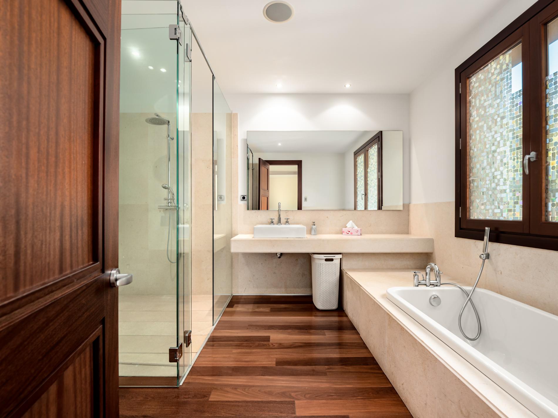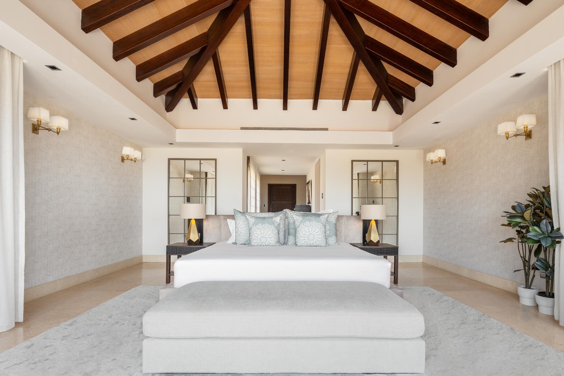 Bedroom 1: Master bedroom with king-size bed, dressing room, full bathroom with huge sunken bath, leading out to a furnished terrace