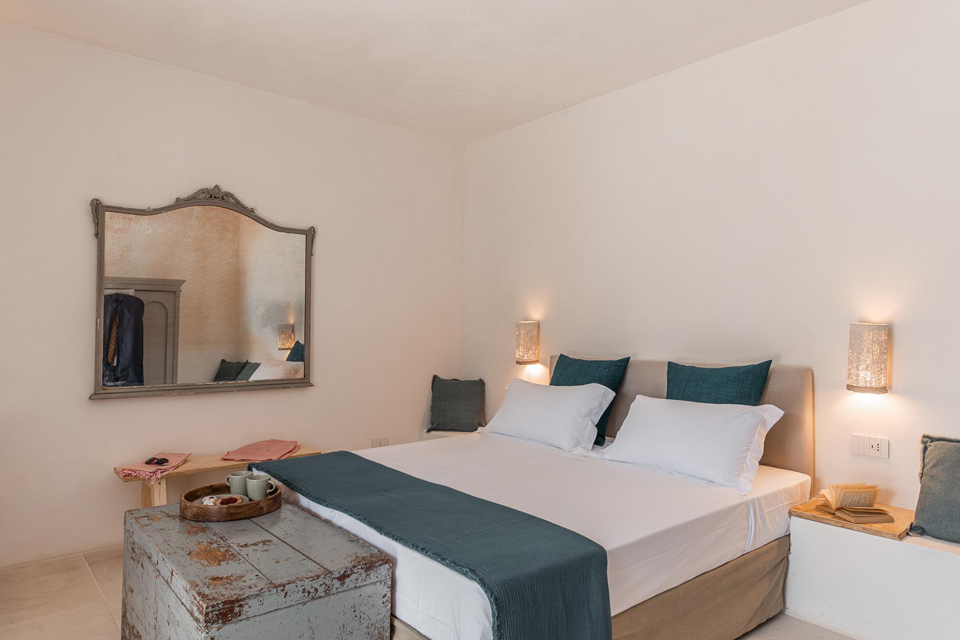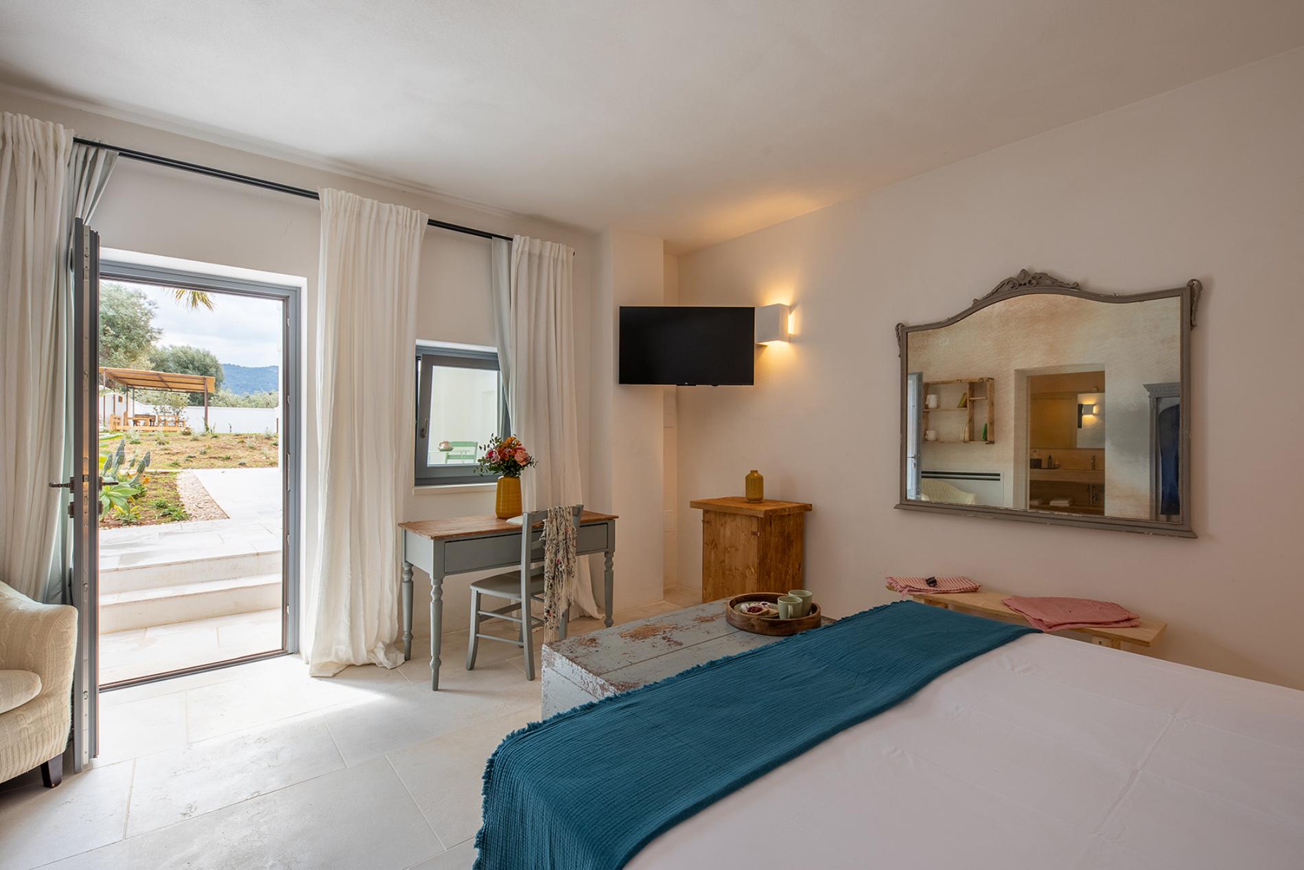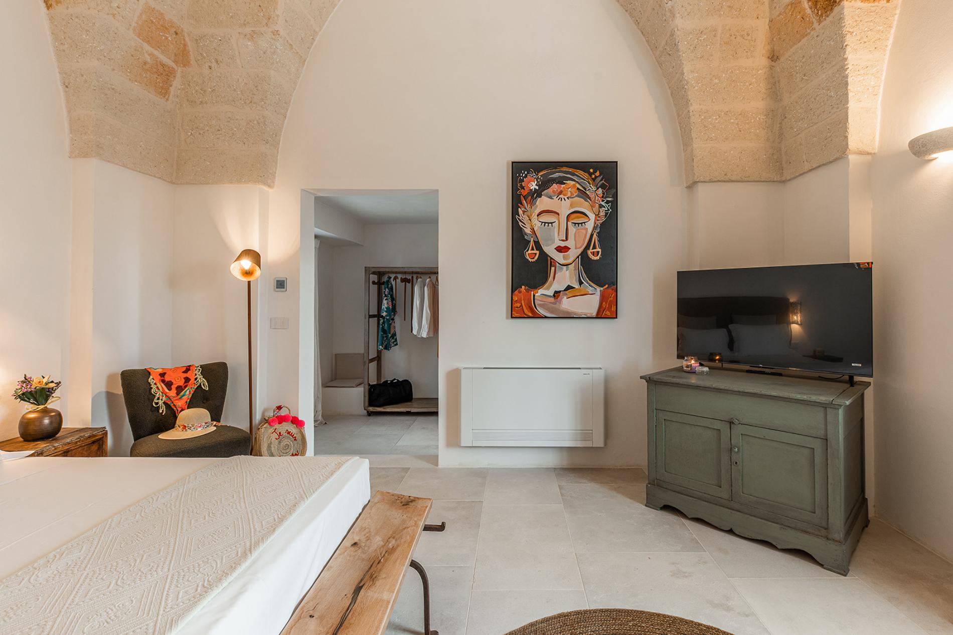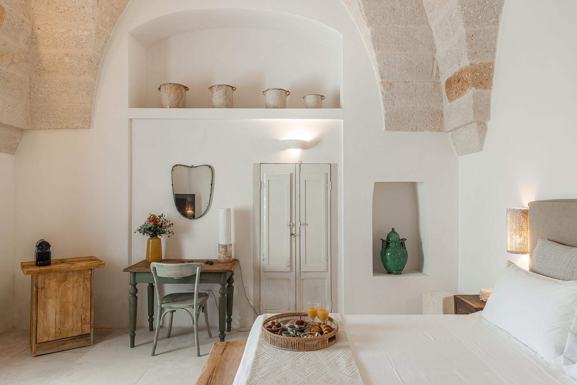 The Lamia room embodies the timeless elegance of Puglia. With its exposed tuff walls and original beamed ceilings, this room conveys a sense of authenticity and refinement.