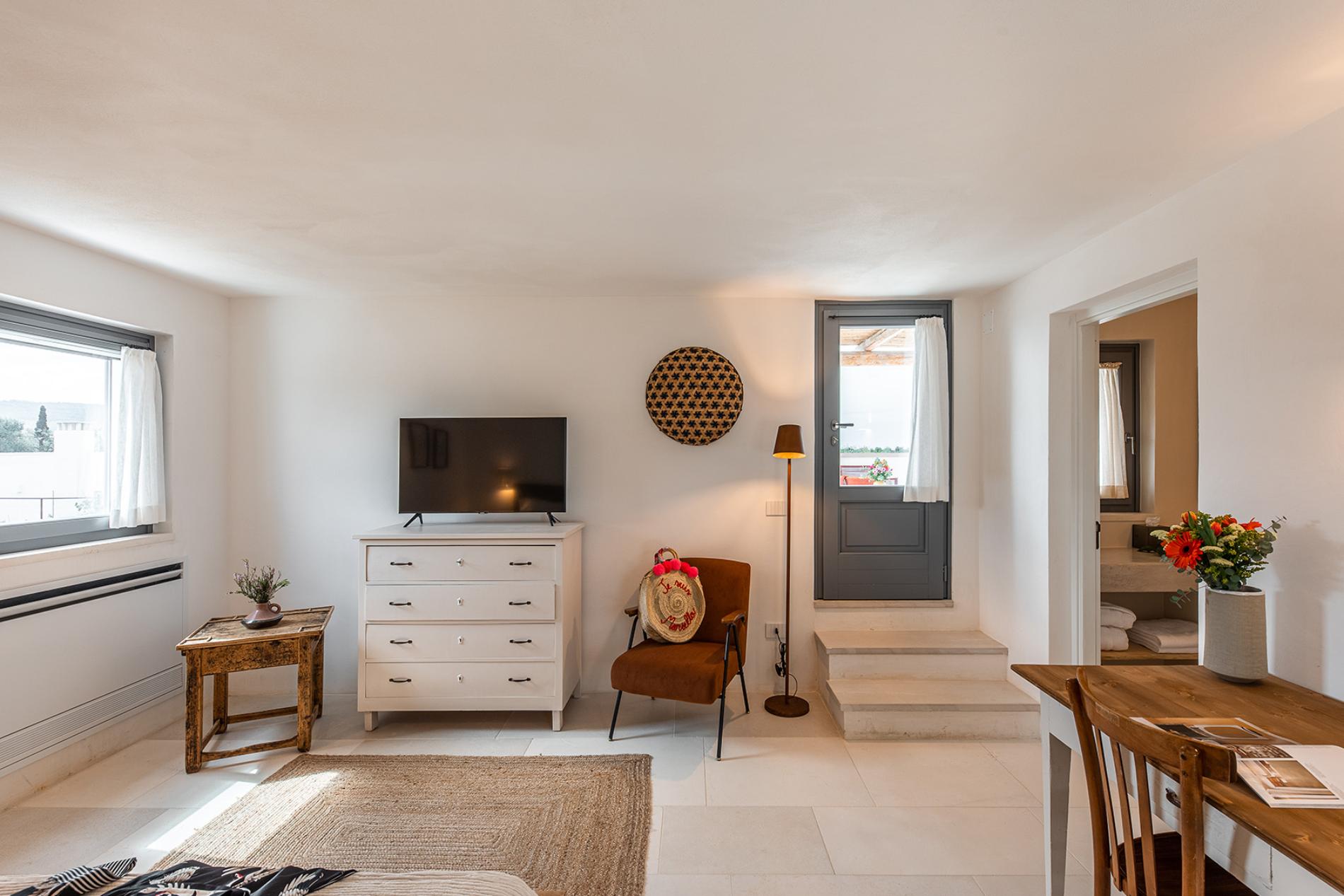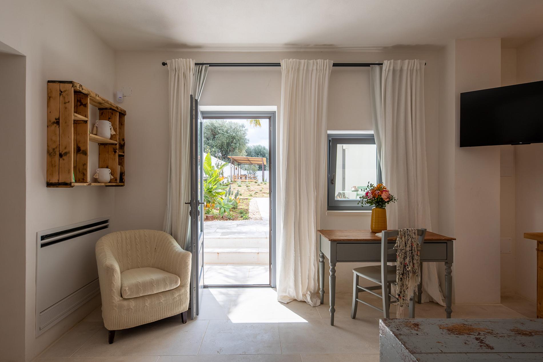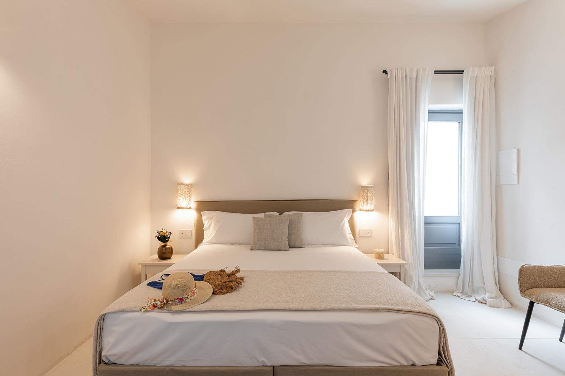 The Lamia room embodies the timeless elegance of Puglia. With its exposed tuff walls and original beamed ceilings, this room conveys a sense of authenticity and refinement.