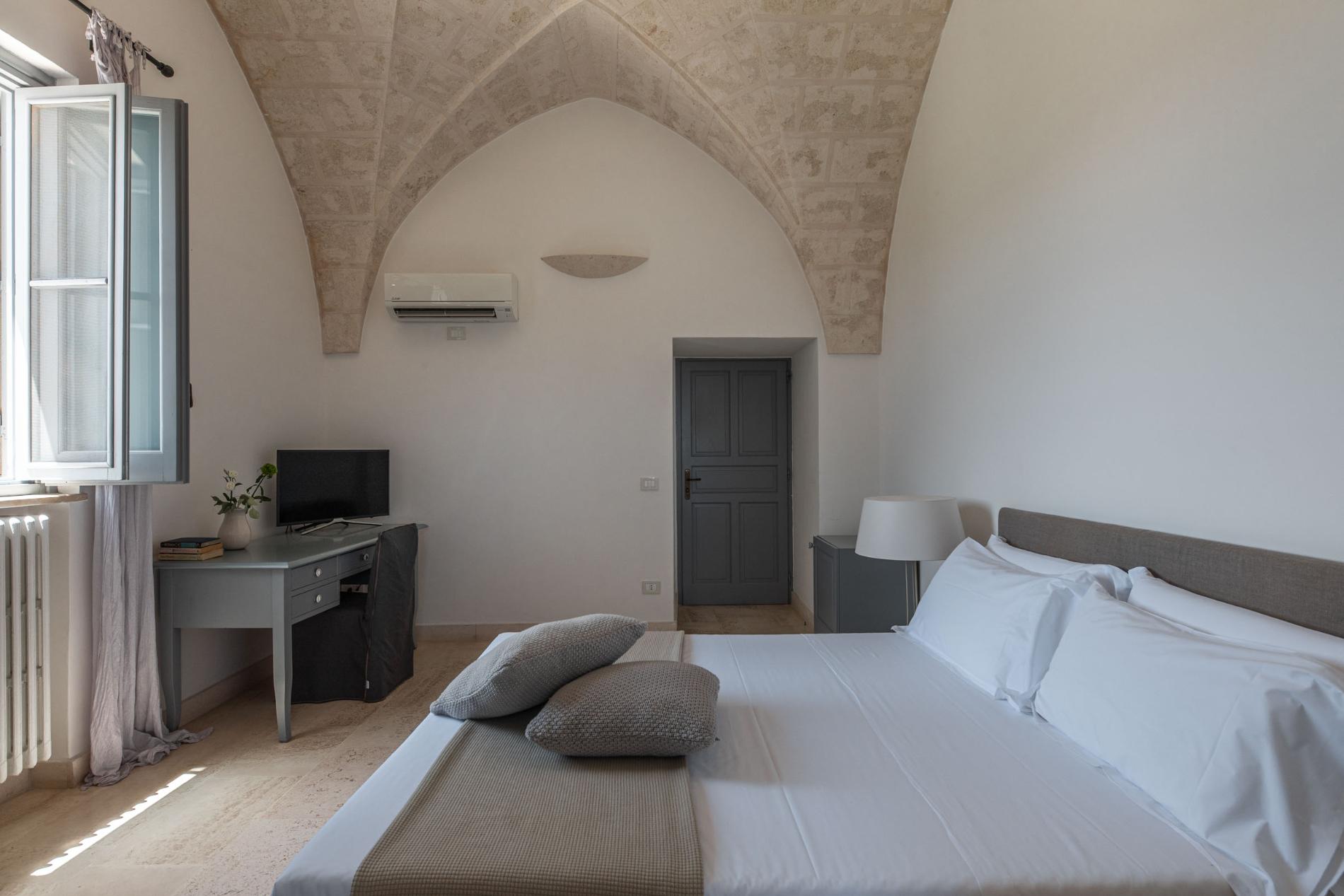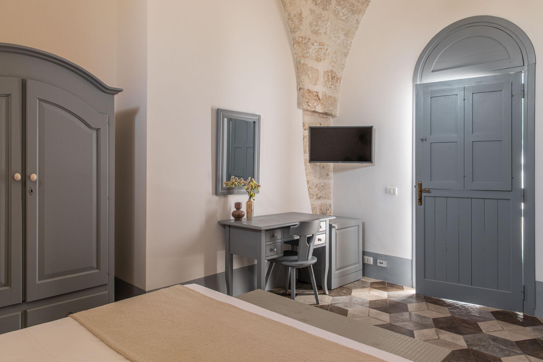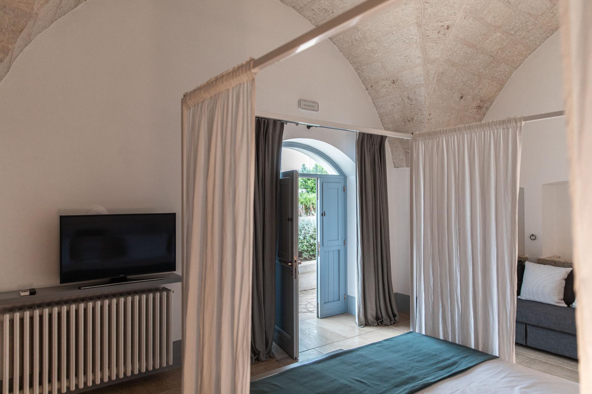 The Masseria has 14 bedrooms, all located in the central building while offering privacy, soundproofing, and ample space. Rooms are hypoallergenic featuring high-quality mattresses and pillows, as well as skin-friendly bedding, towels and linen. Each room offers a different view: garden view, orchard, countryside, and/or sea views.