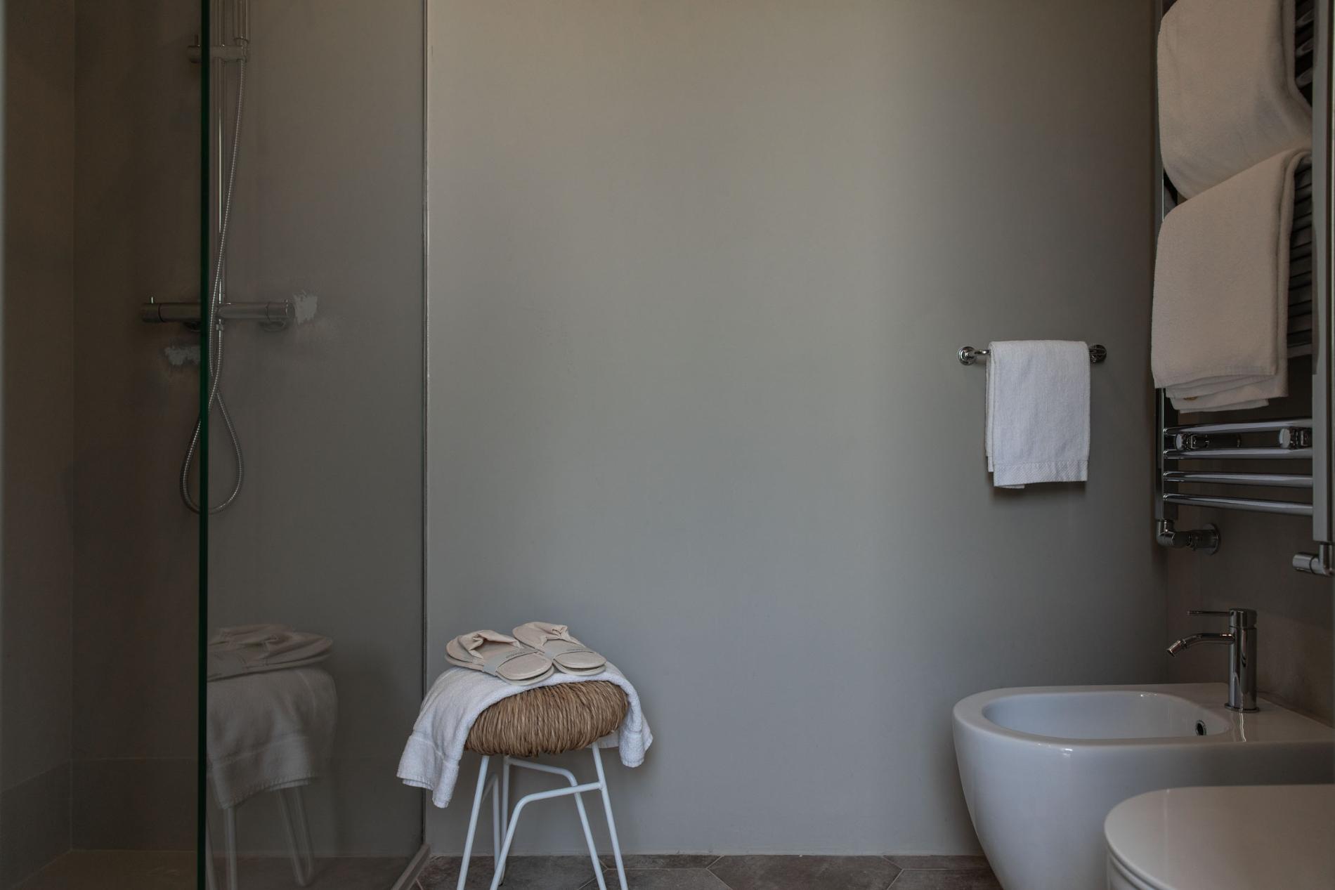 Each room has a large double bed (some with two single beds), wardrobe, in-room safe, mirrors, sustainable toiletries, high-quality courtesy kit, independent air conditioning and heating, smart TV, private bathroom, and charming stunning views.