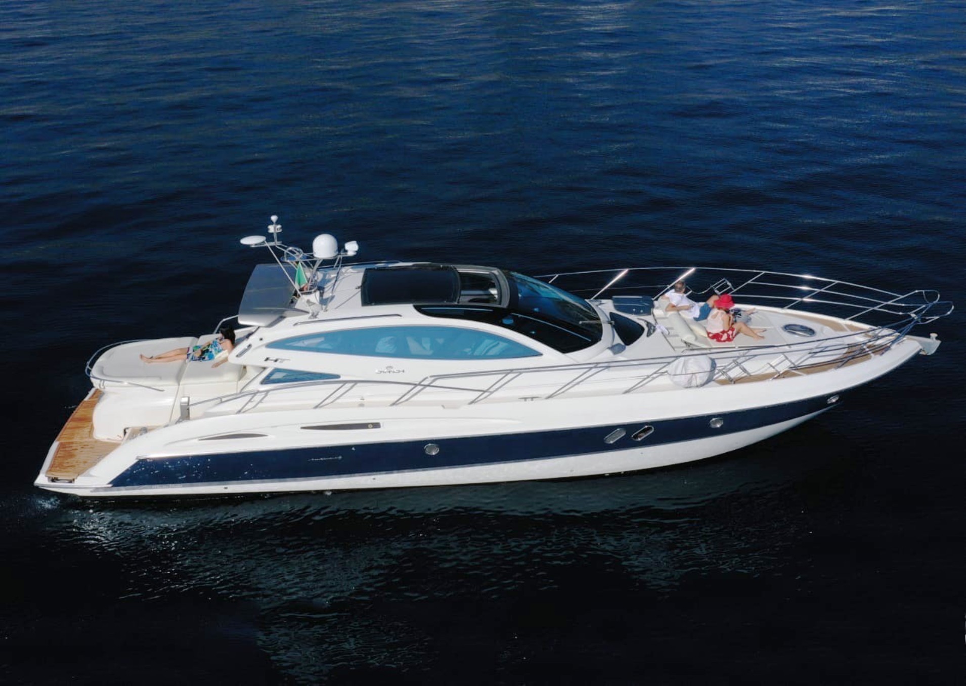 A limited-edition open yacht with an elegant and roomy layout. Sophisticated design embellished with leather and wood details along with top-of-the-line features. Comfortable and sleek interiors featuring two ensuite cabins, large salon with sliding sunroof and padded sundeck area. The perfect craft to enjoy your time onboard.
