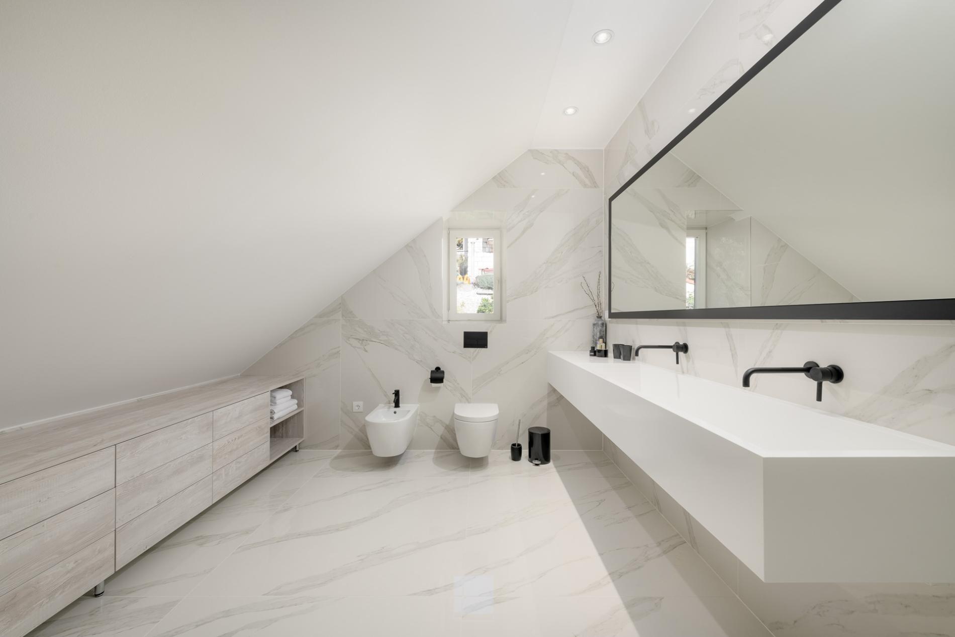 Besides the beautiful interior, from the main ground floor, you can step onto a large stone terrace equipped with sun chairs, sun umbrellas, outdoor seating furniture, and a swimming pool. Additionally, the summer kitchenette is a perfect choice if you need some relaxing time at a comfortable shadowed sitting area having delicious barbeque meals.