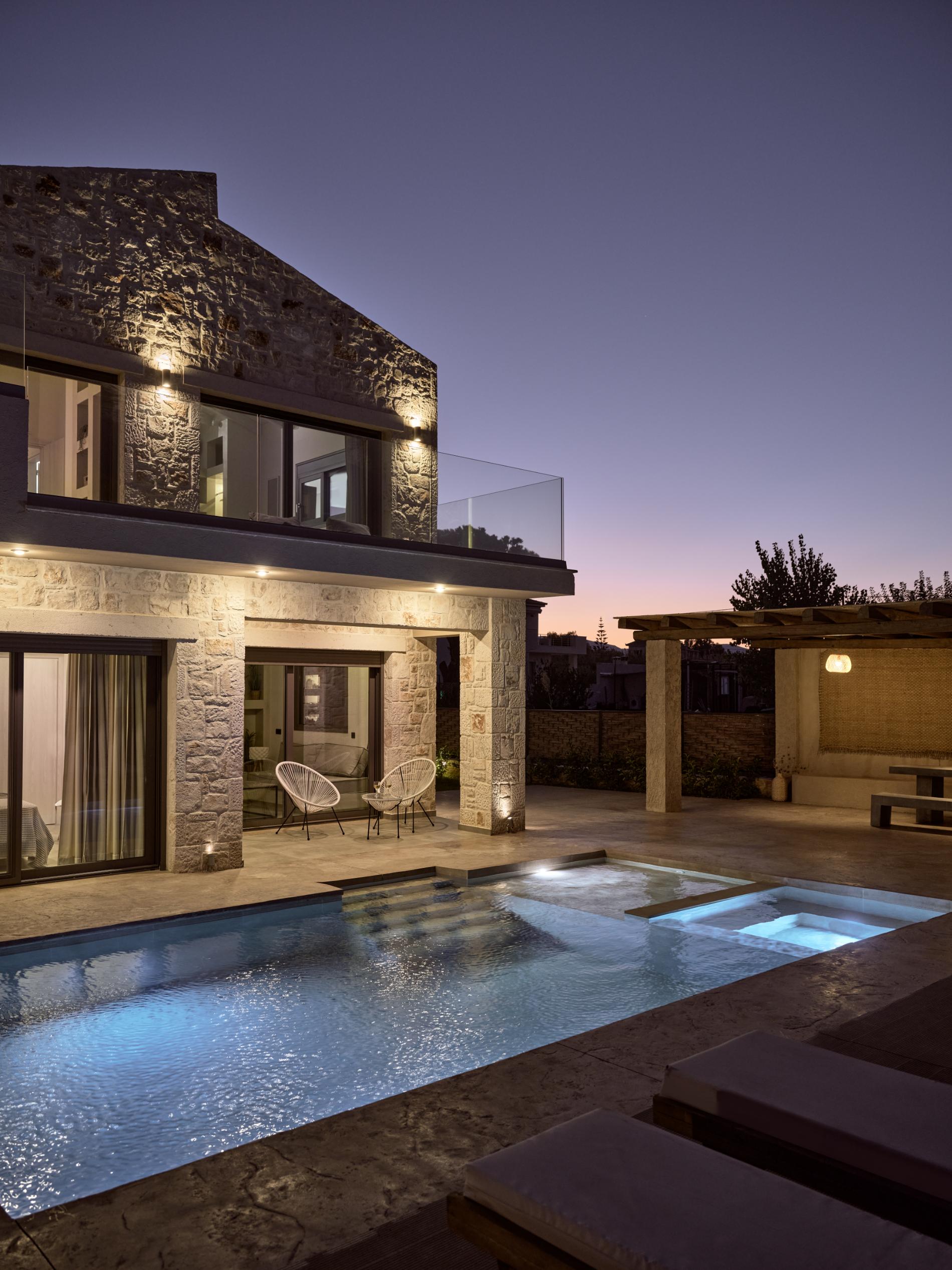 This captivating home is embellished with a private 35m2 private swimming pool, featuring a three seater spa whirlpool, lounge area and outdoor dinning area. Grown-ups can lounge to their sun loungers before idling back for al fresco barbecues under sunset skies. The property lays in 250sqm outdoor area with spectacular views to the entire Psarou prefecture. An ideal sea side holiday escape for those who seek privacy and summery living. The villa is part of a Luxury Villas complex (the third in line), where two more villa are located in front, and one more villa behind this villa, each with seclusion and ultimate privacy in mind.