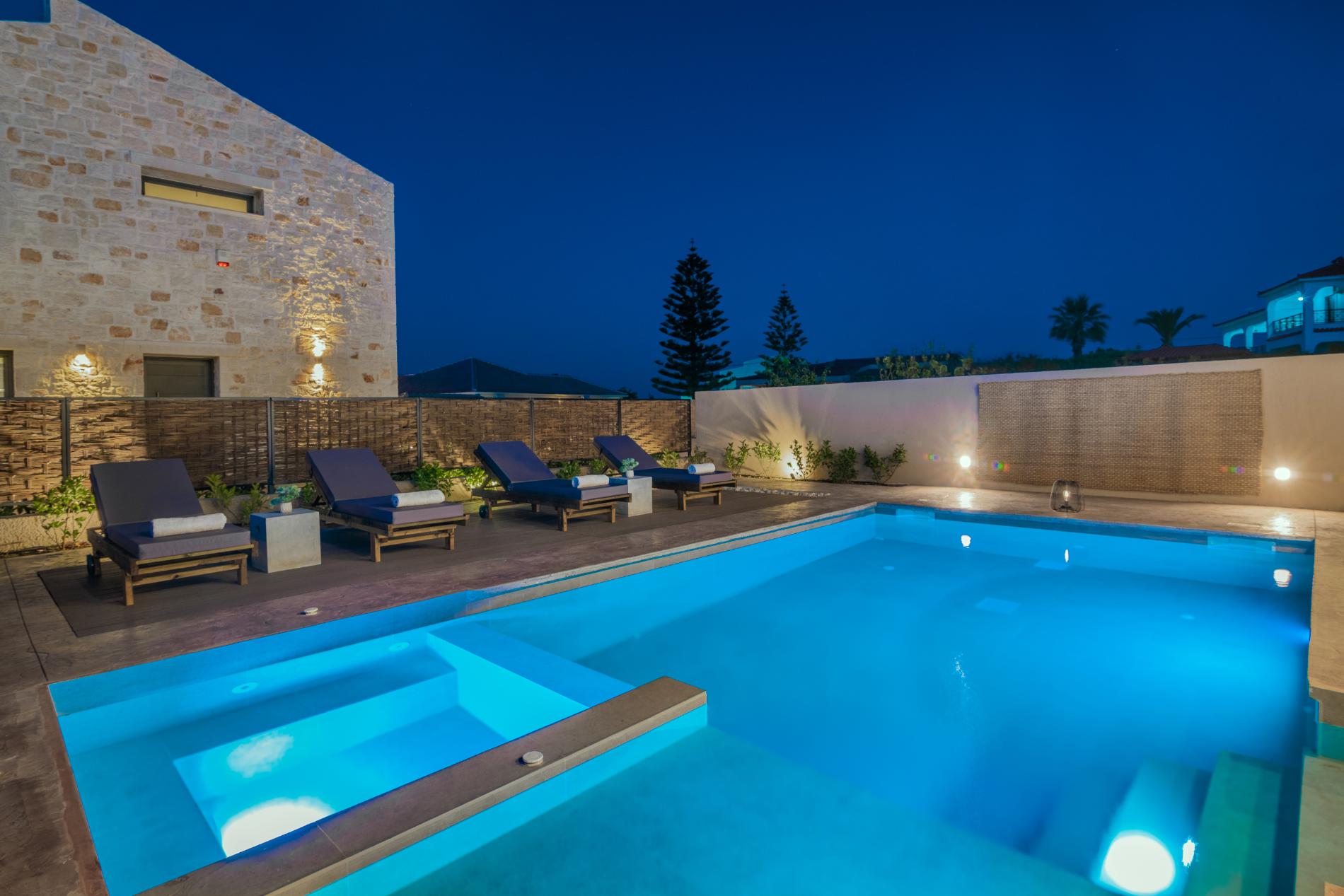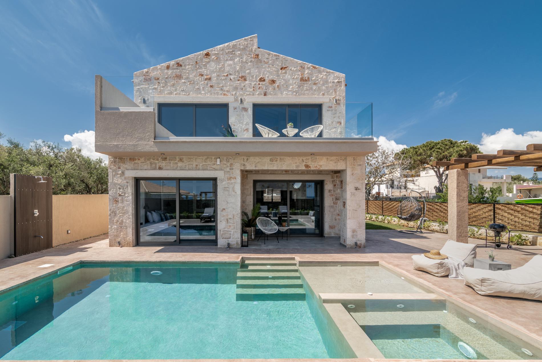 The villa features three wonderful bedrooms, two with en-suite bathroom on the first floor and one with shared bathroom at the ground floor allowing plenty of space and comfort for all. It can comfortably accommodate up to 6 guests in real beds, and two more guests (preferably children ) can sleep in the two sofa beds (0.80×2.00) featured at the living room area.