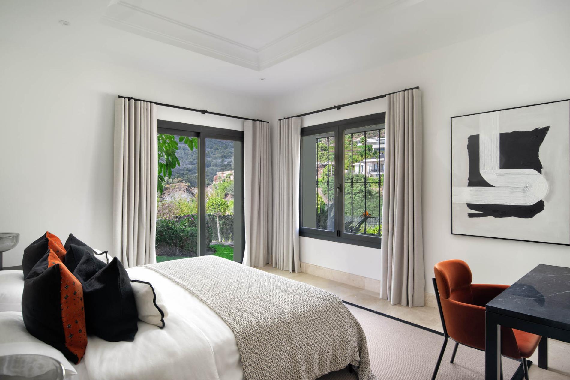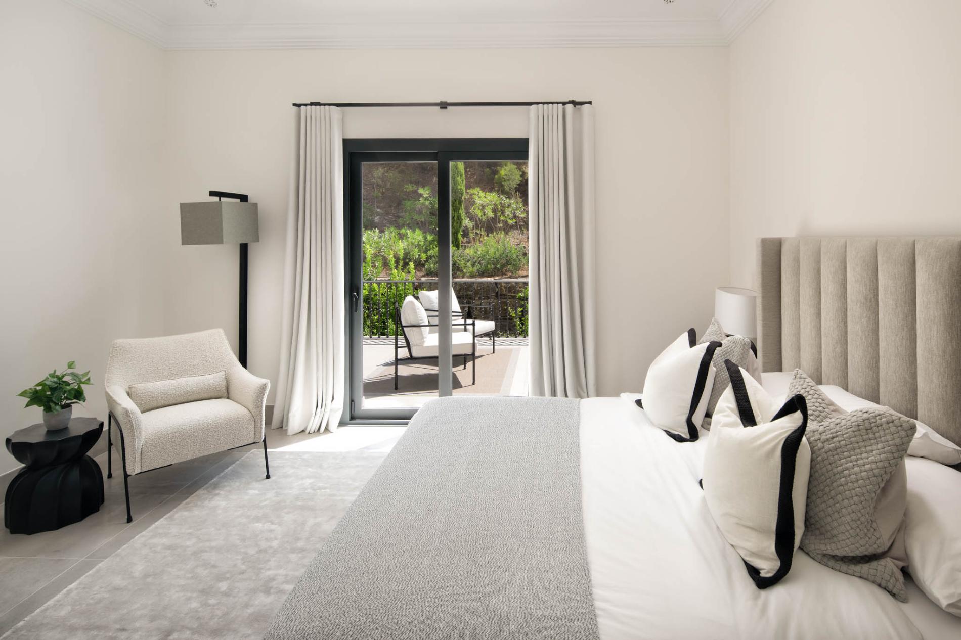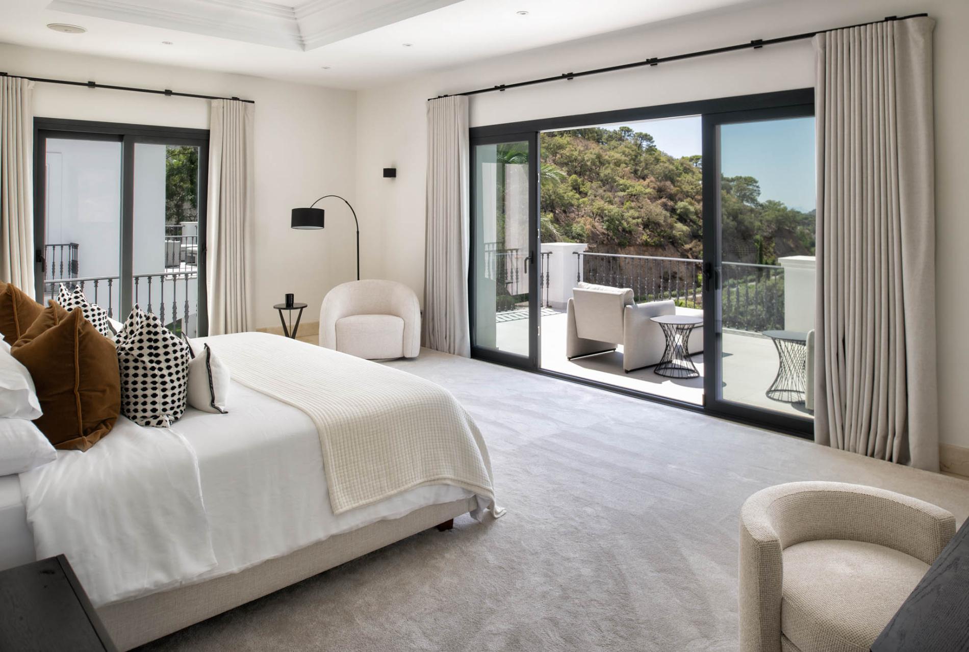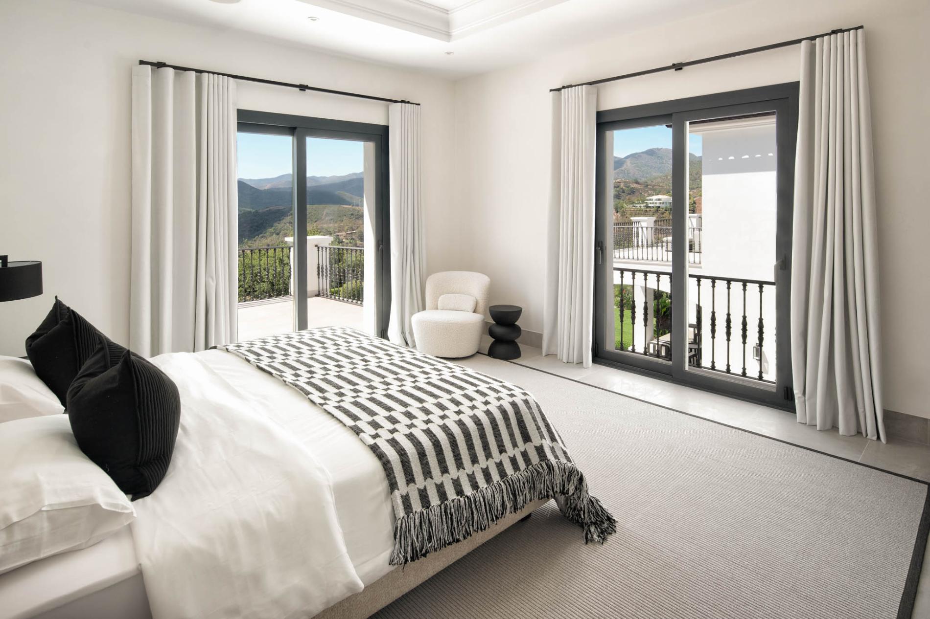 The upper floor comprises two ensuite bedrooms in the same contemporary style as the rest of the villa, with private balconies facing the mountains.