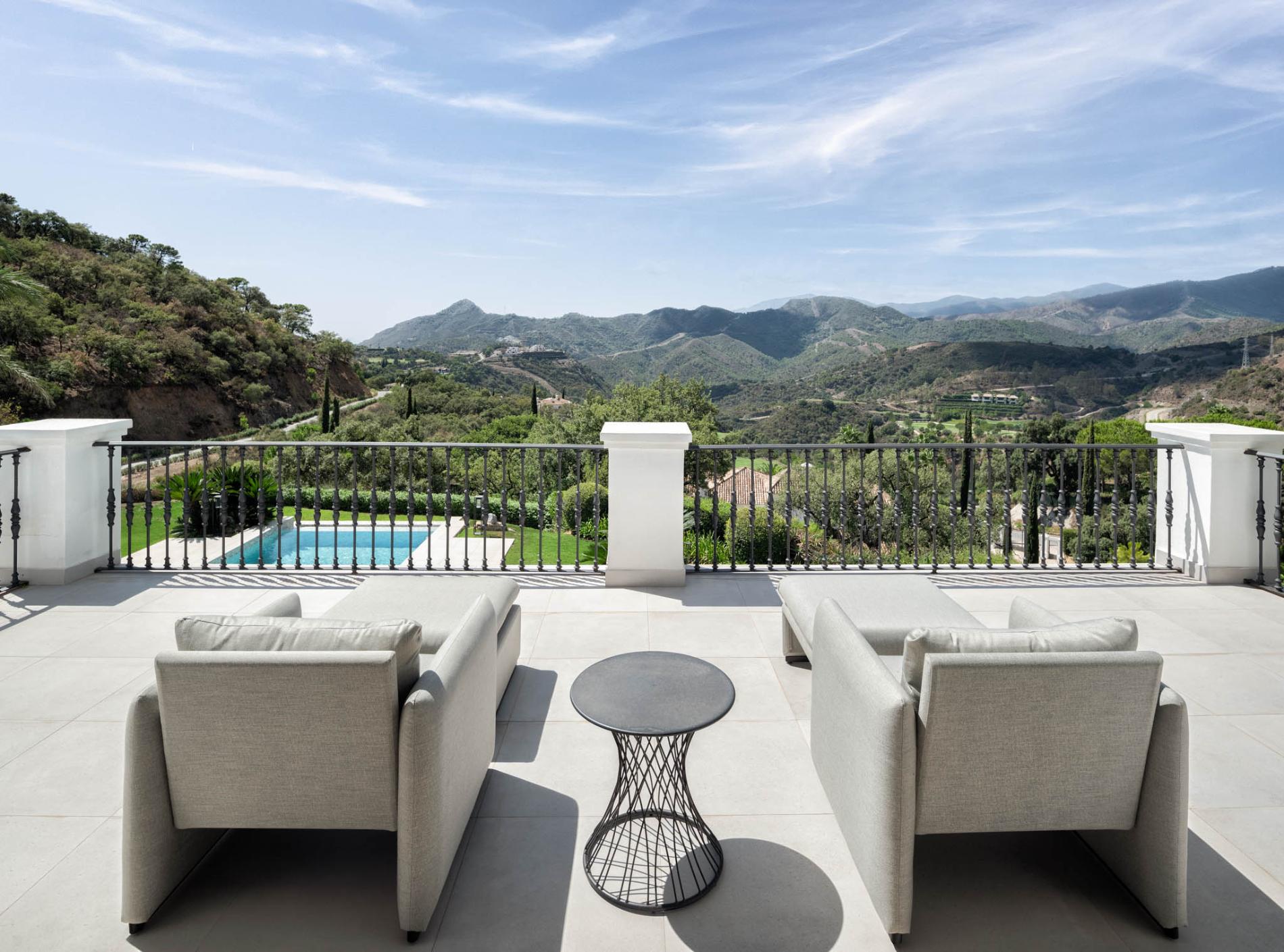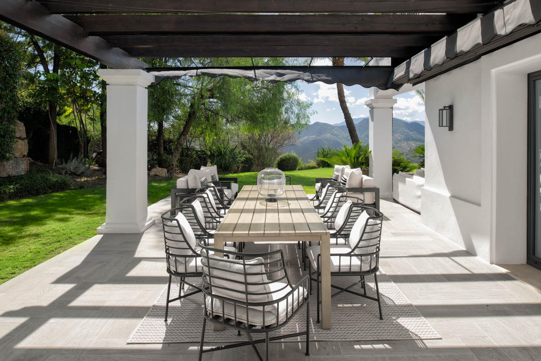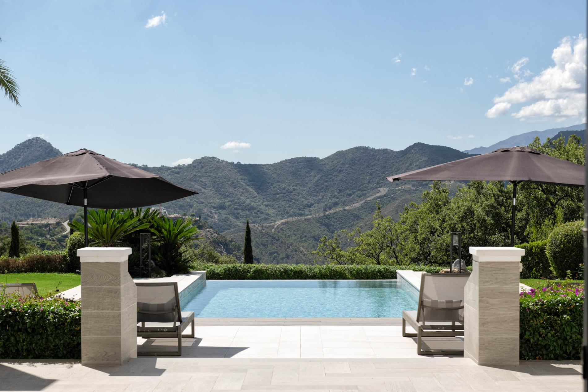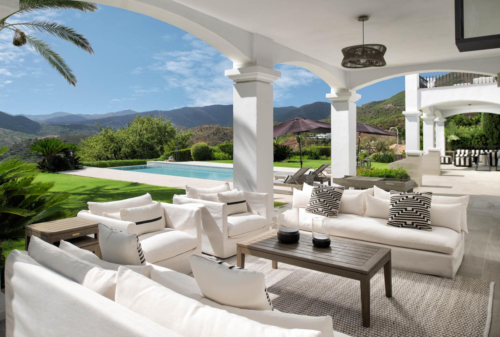 Access to the holiday villa is along an enchanting cobbled driveway, adorned with a central fountain — a perfect complement to the grand portico and elegant architecture. From the double height entrance hall, you can see straight through to the pool and spectacular mountain views beyond. The left wing of the luxury villa comprises a large bespoke kitchen with a central island, sleek units and mod cons, a bright and airy sitting room and a formal dining room with modern furniture, comfortable seating and a classic neutral colour palette. Large covered sundecks at the back of the house are furnished with plush seats where you can relax in the shade, dine alfresco and gaze at the stunning uninterrupted view.