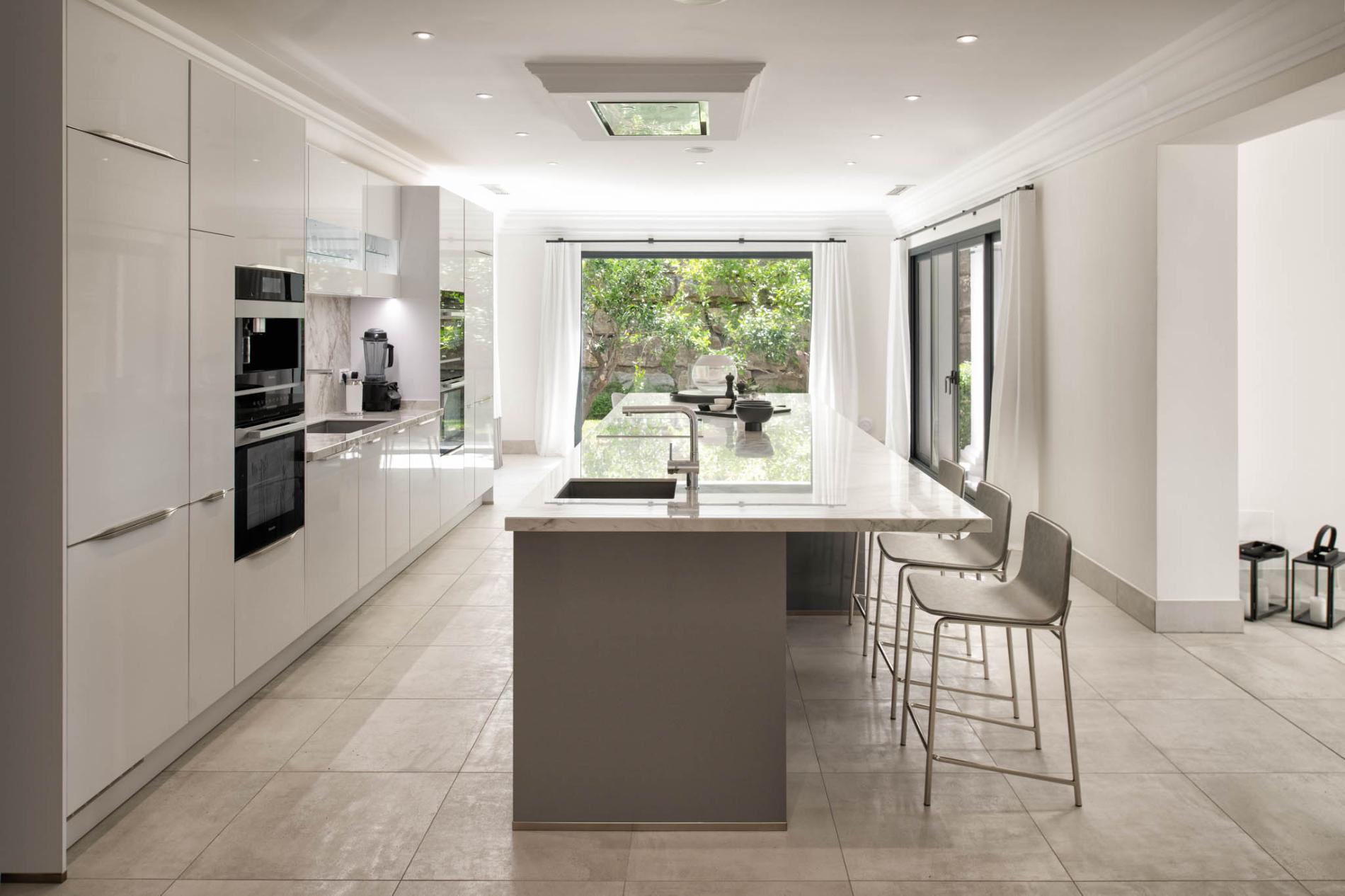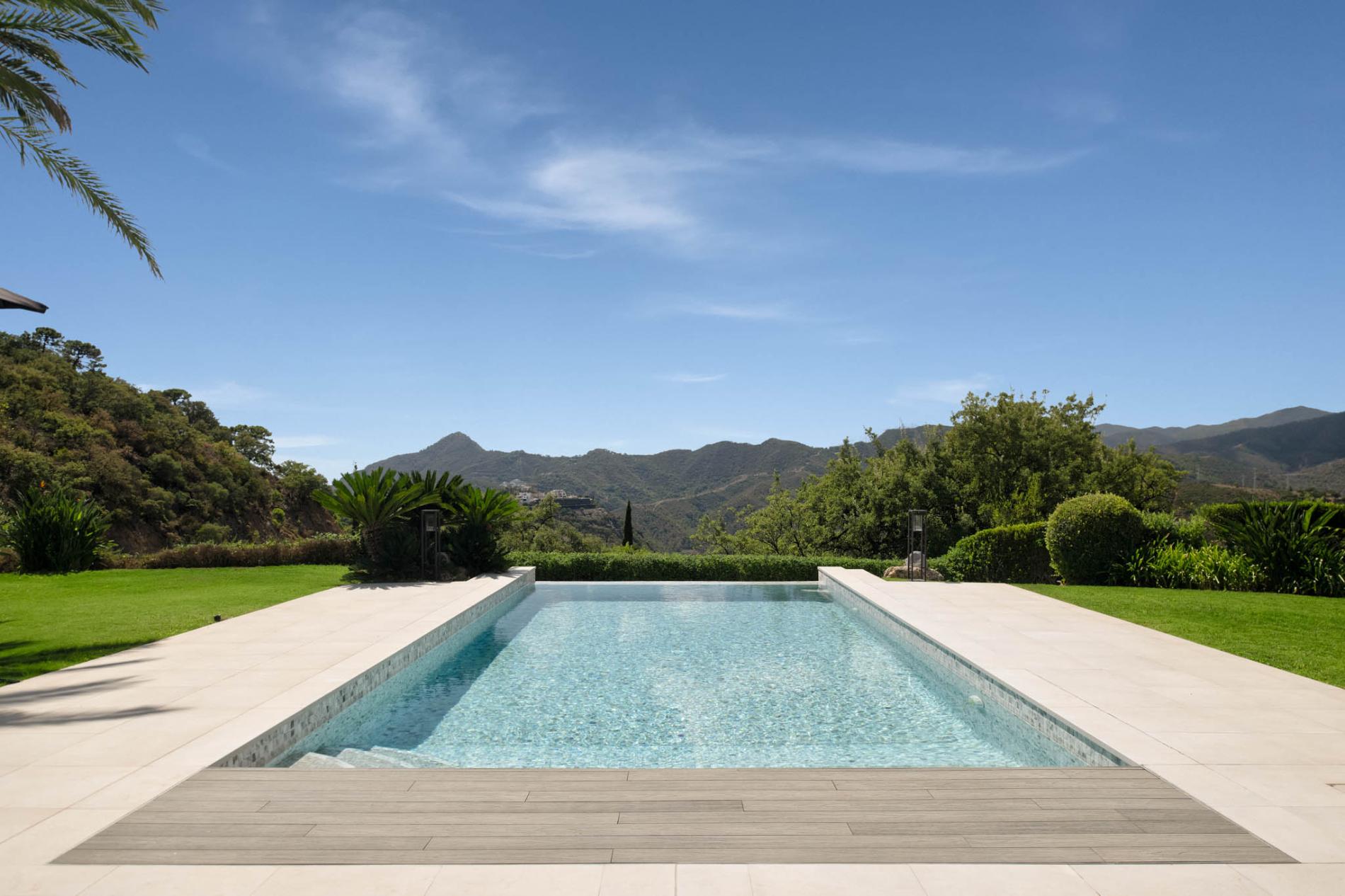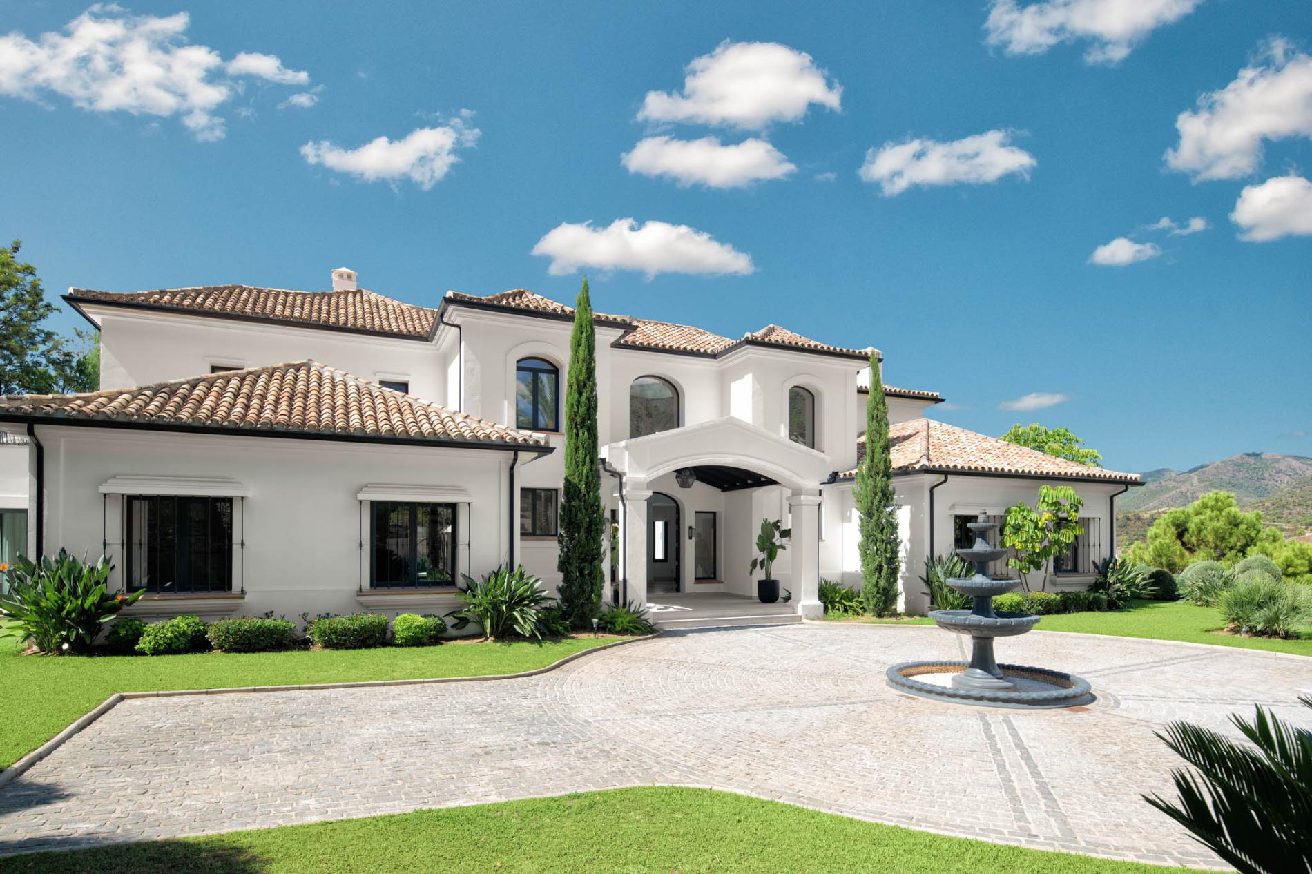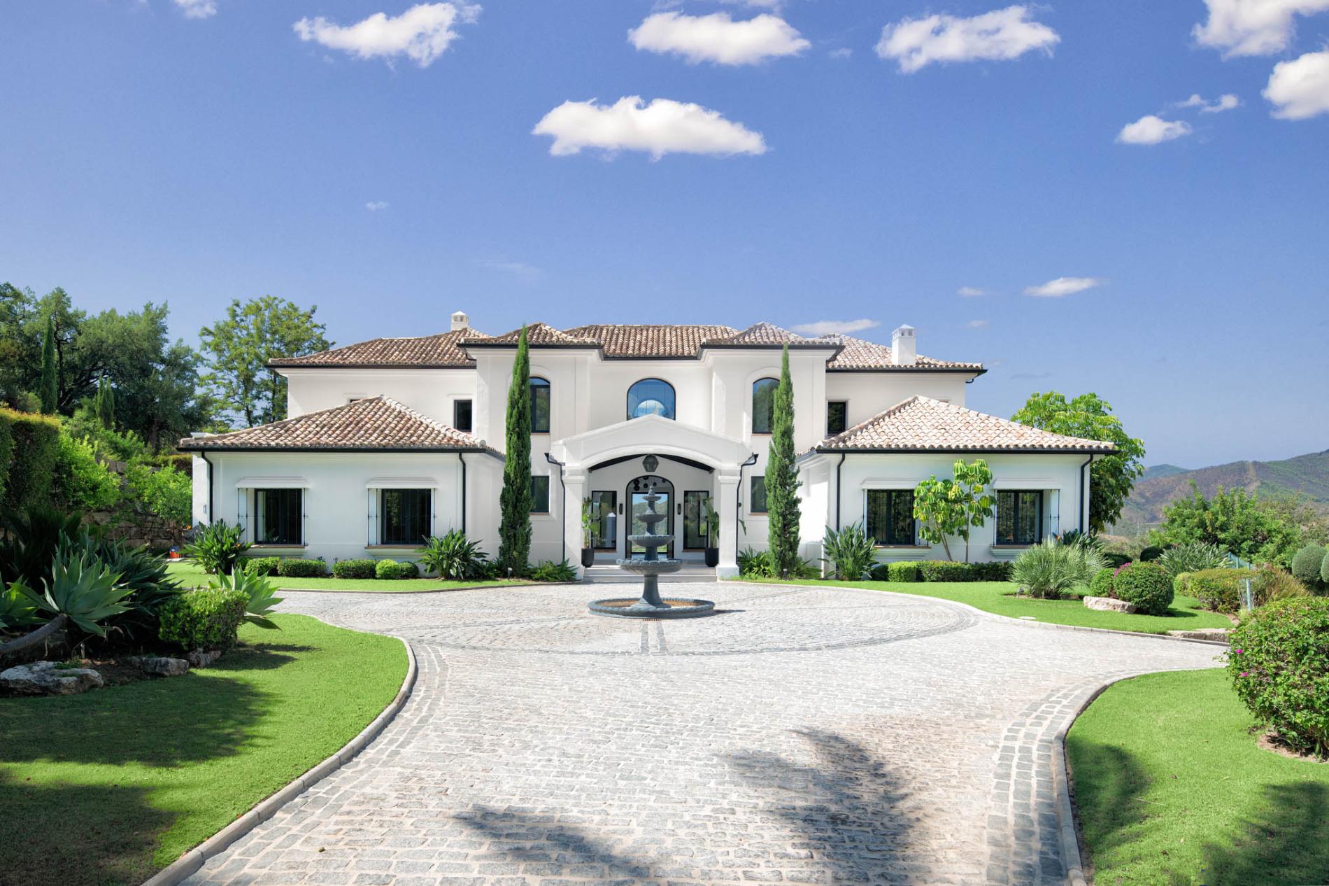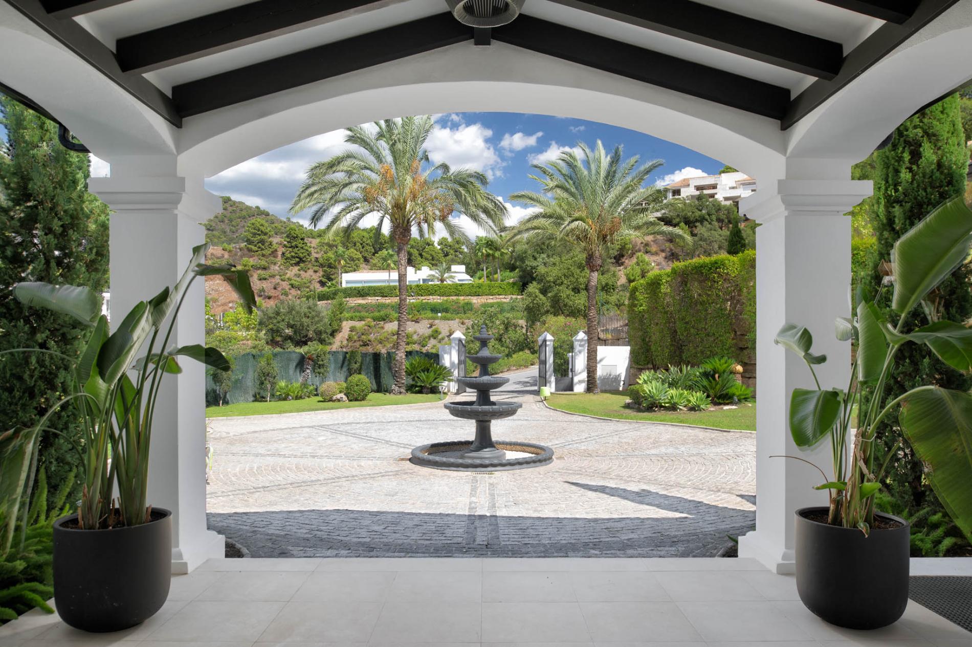 Access to the holiday villa is along an enchanting cobbled driveway, adorned with a central fountain — a perfect complement to the grand portico and elegant architecture. From the double height entrance hall, you can see straight through to the pool and spectacular mountain views beyond. The left wing of the luxury villa comprises a large bespoke kitchen with a central island, sleek units and mod cons, a bright and airy sitting room and a formal dining room with modern furniture, comfortable seating and a classic neutral colour palette. Large covered sundecks at the back of the house are furnished with plush seats where you can relax in the shade, dine alfresco and gaze at the stunning uninterrupted view.