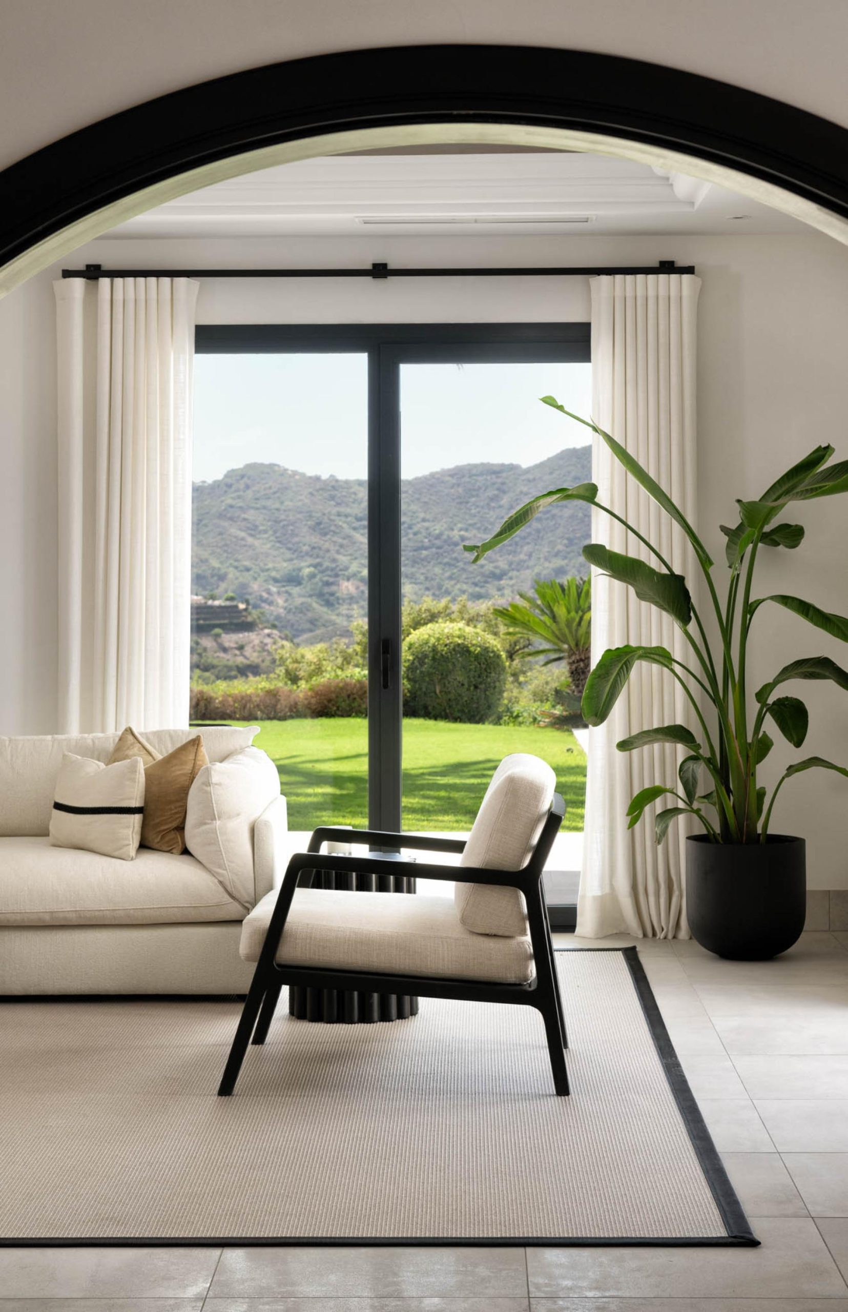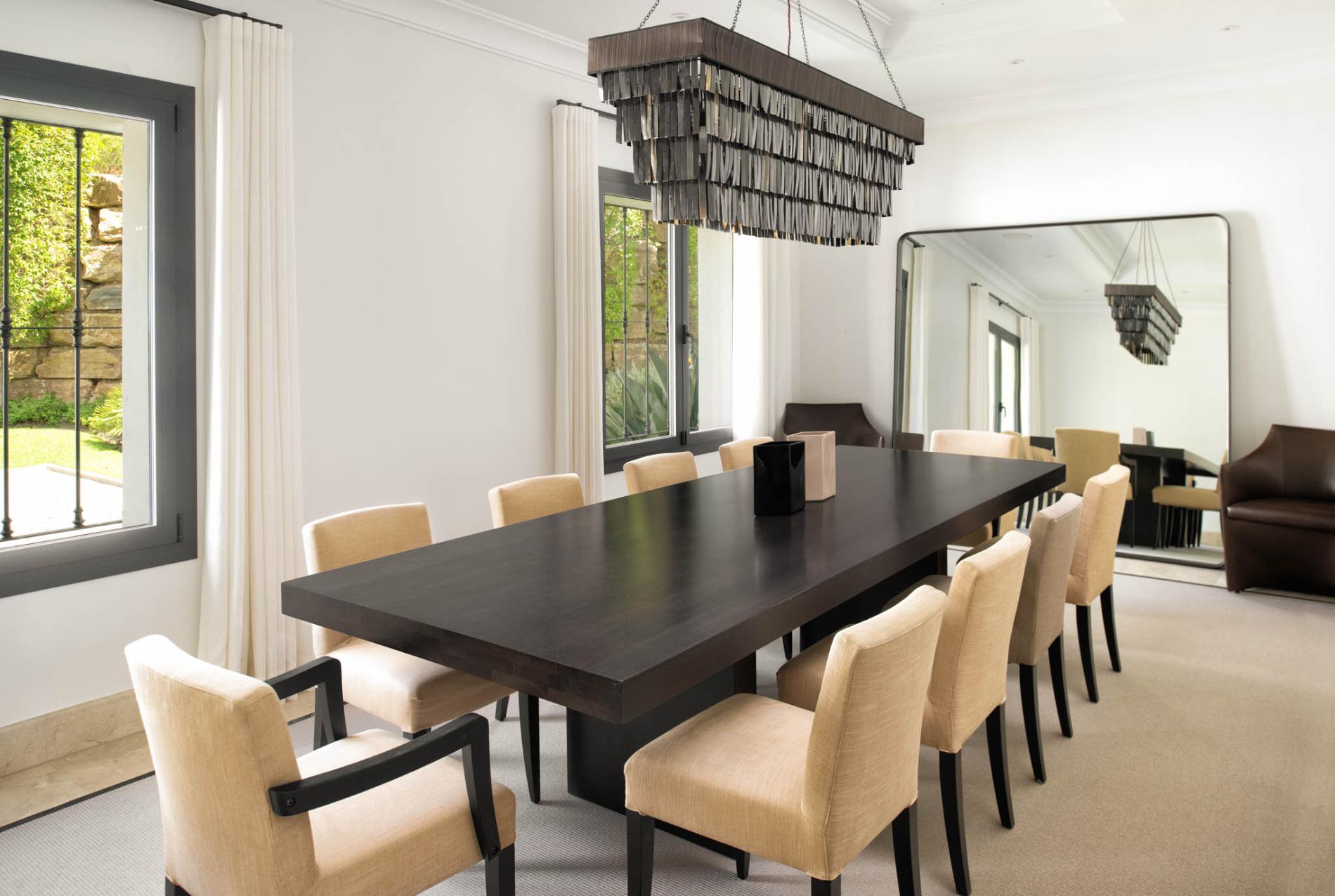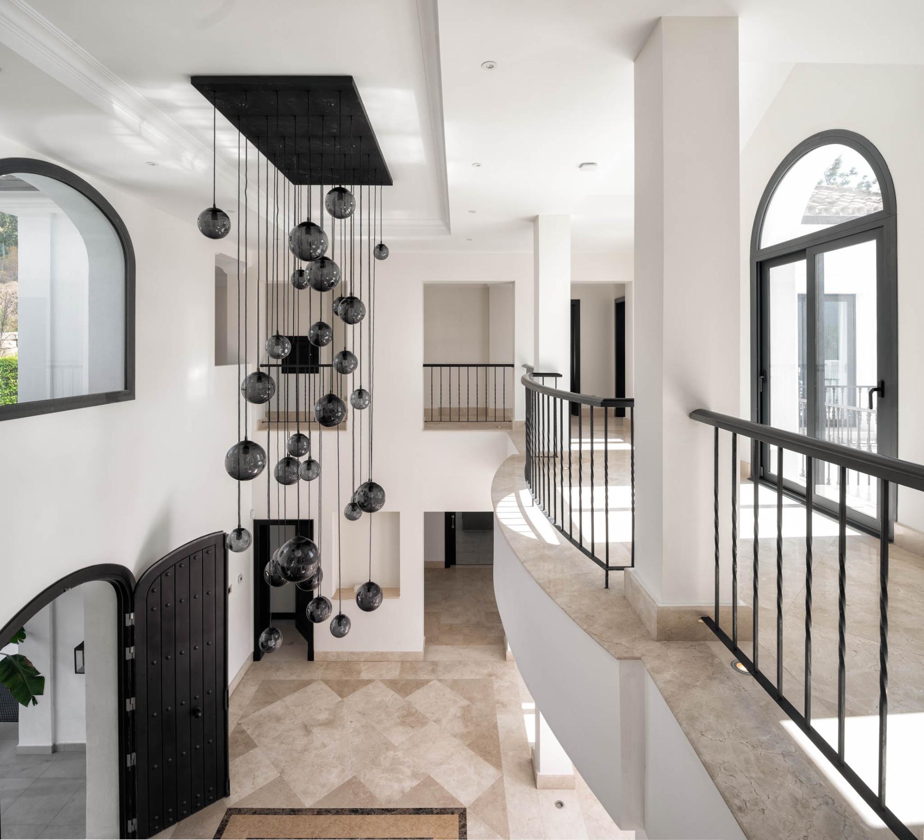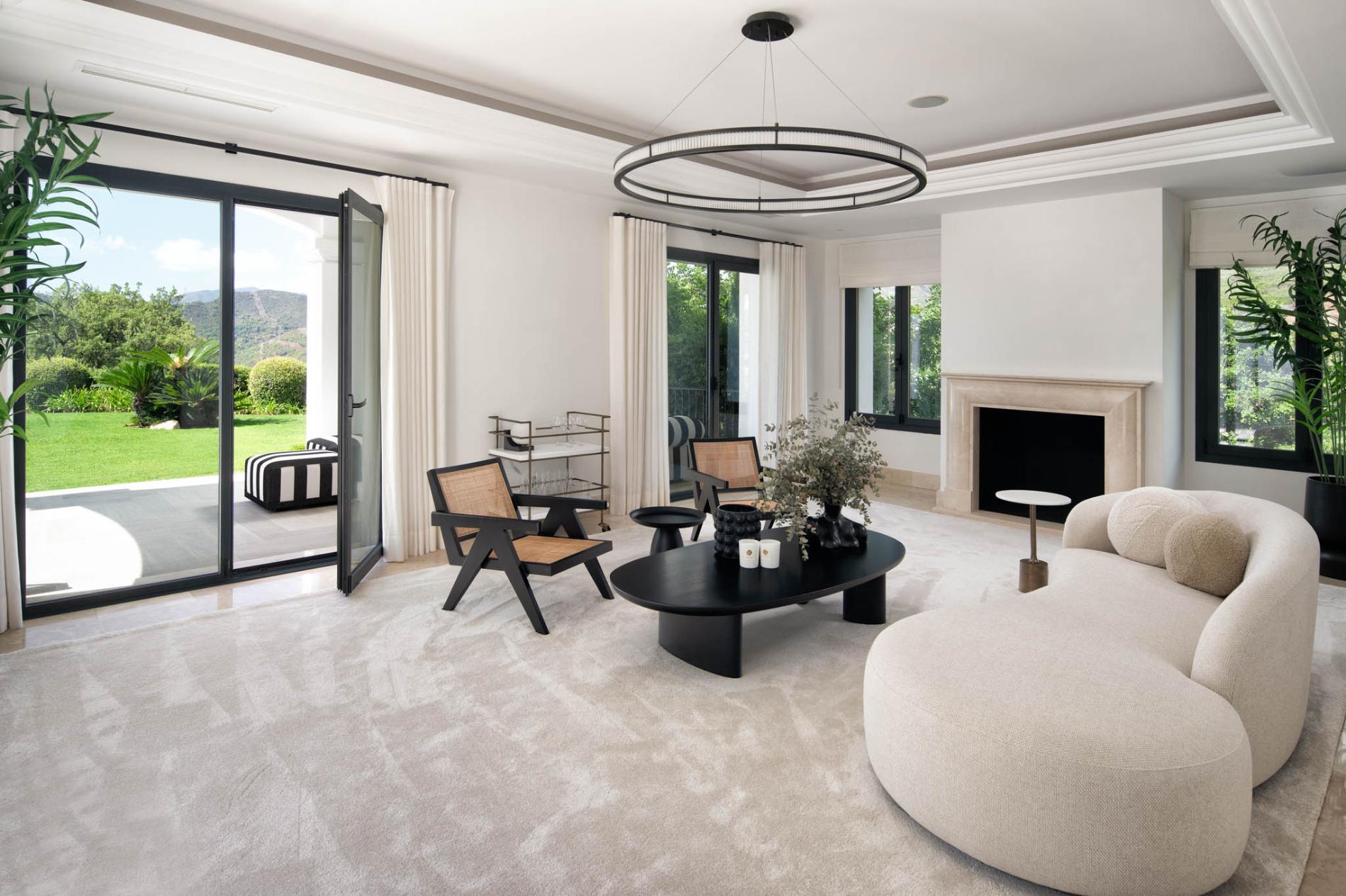 Access to the holiday villa is along an enchanting cobbled driveway, adorned with a central fountain — a perfect complement to the grand portico and elegant architecture. From the double height entrance hall, you can see straight through to the pool and spectacular mountain views beyond. The left wing of the luxury villa comprises a large bespoke kitchen with a central island, sleek units and mod cons, a bright and airy sitting room and a formal dining room with modern furniture, comfortable seating and a classic neutral colour palette. Large covered sundecks at the back of the house are furnished with plush seats where you can relax in the shade, dine alfresco and gaze at the stunning uninterrupted view.