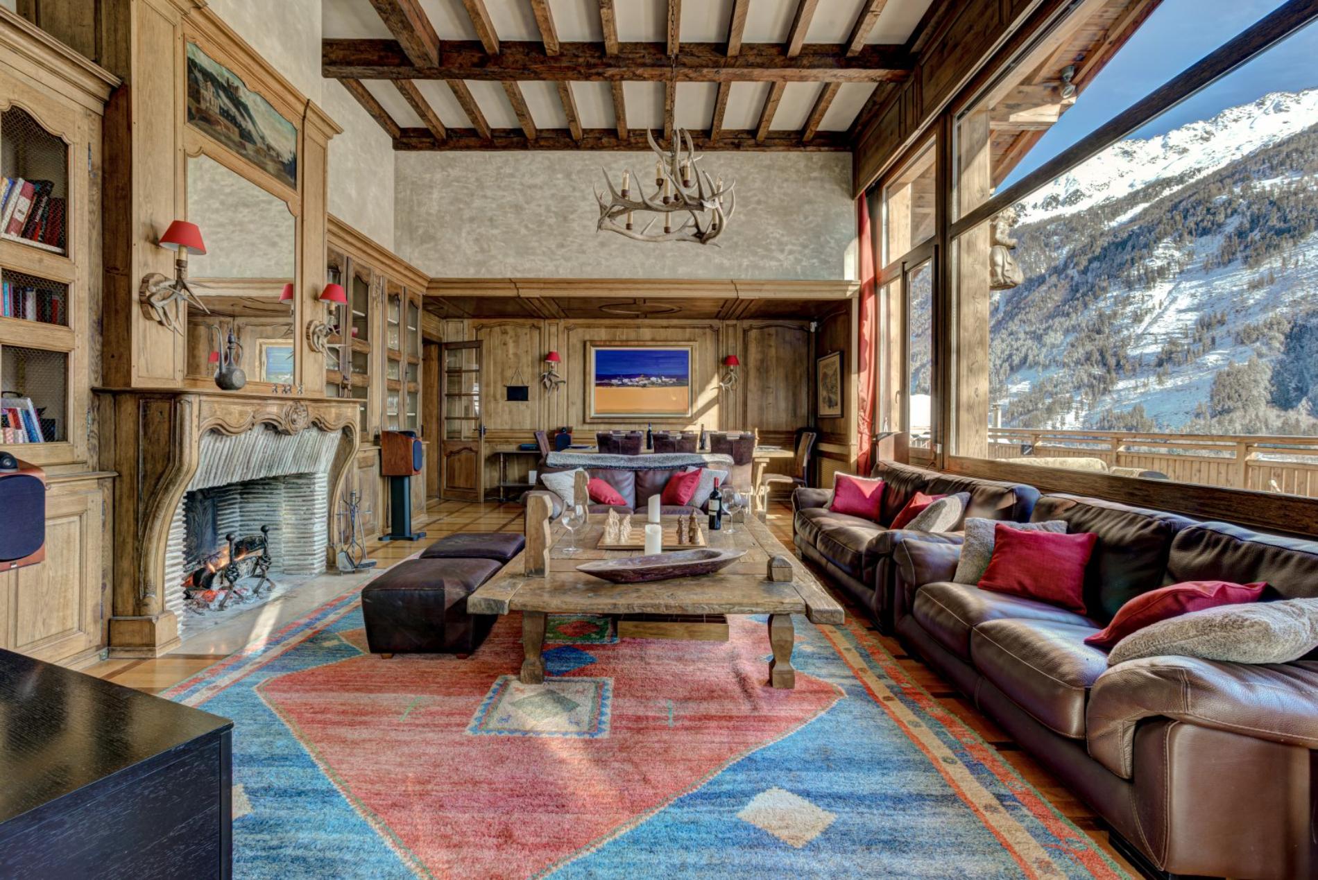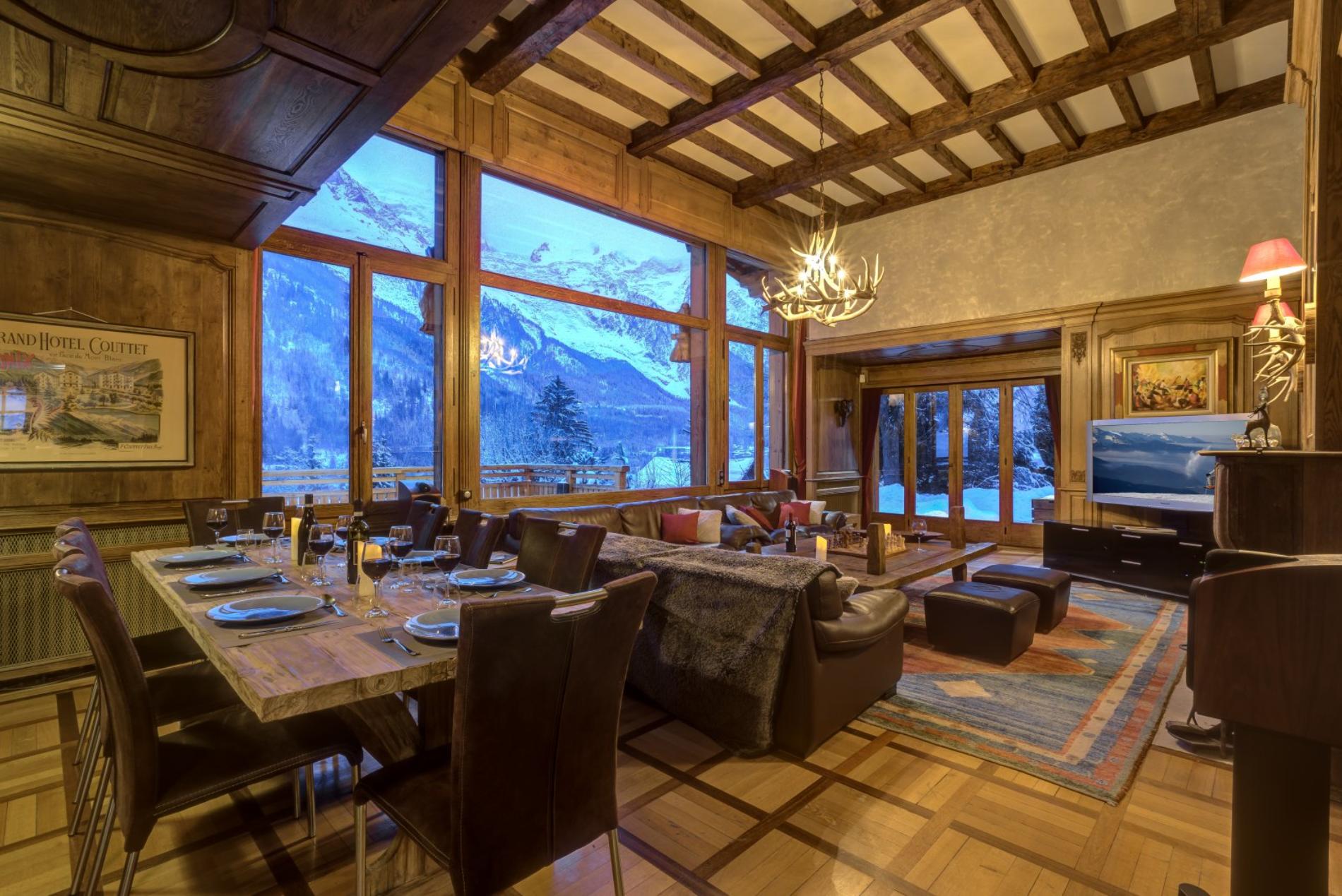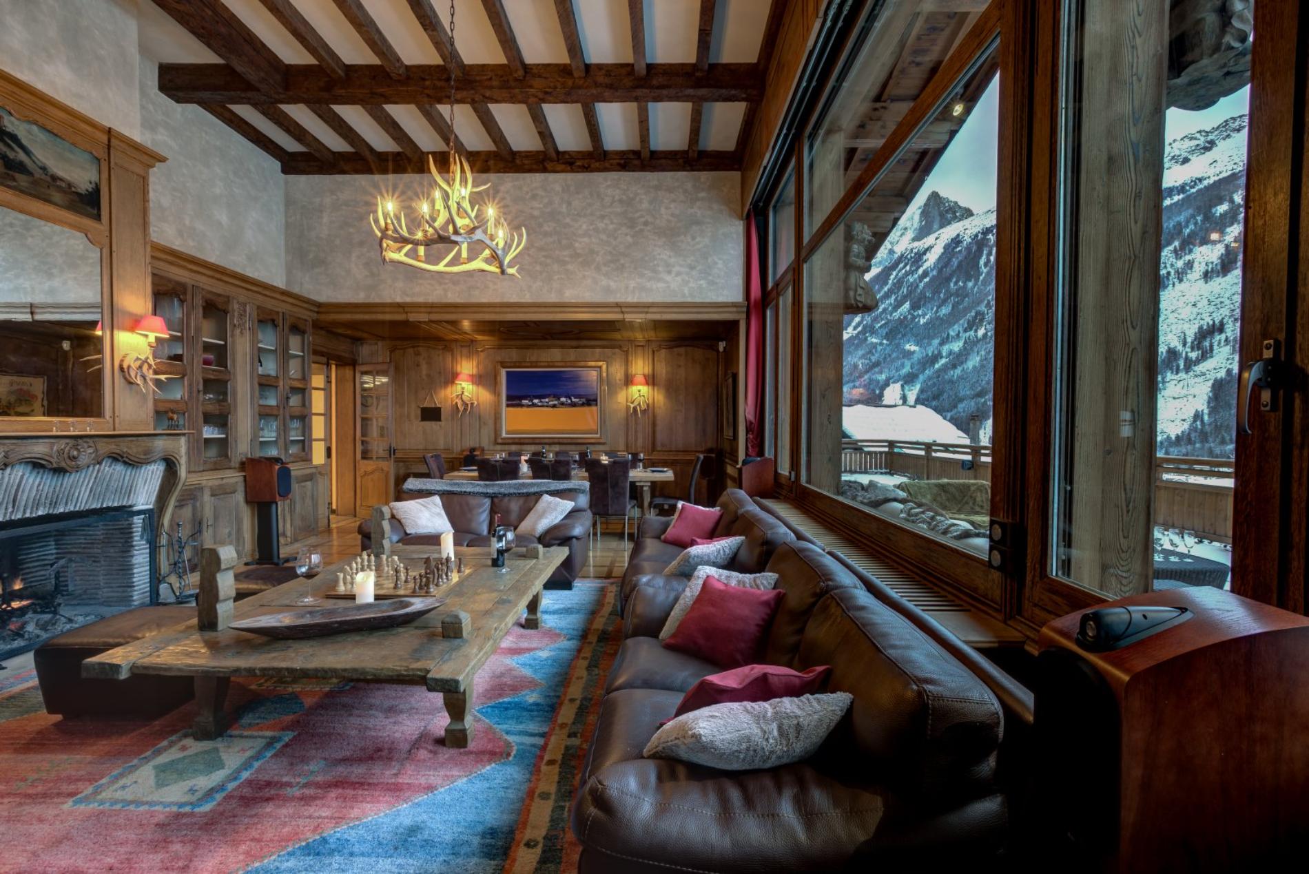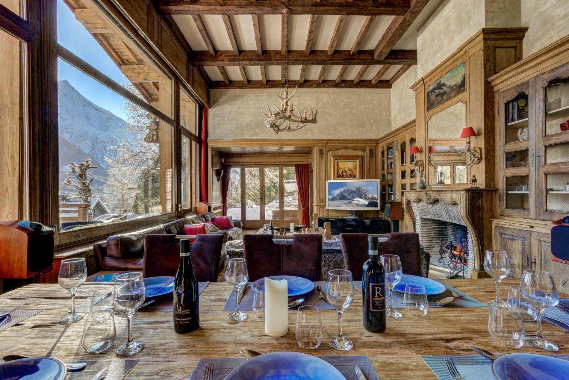 The living room has a wonderful open fire place, with large windows offering magnificent views directly up to Mt Blanc