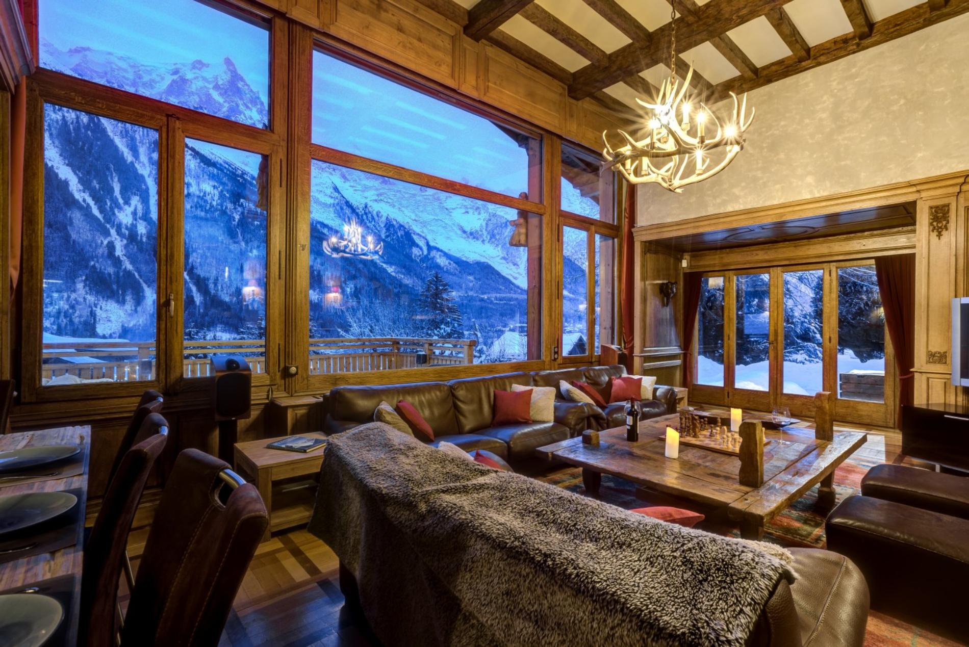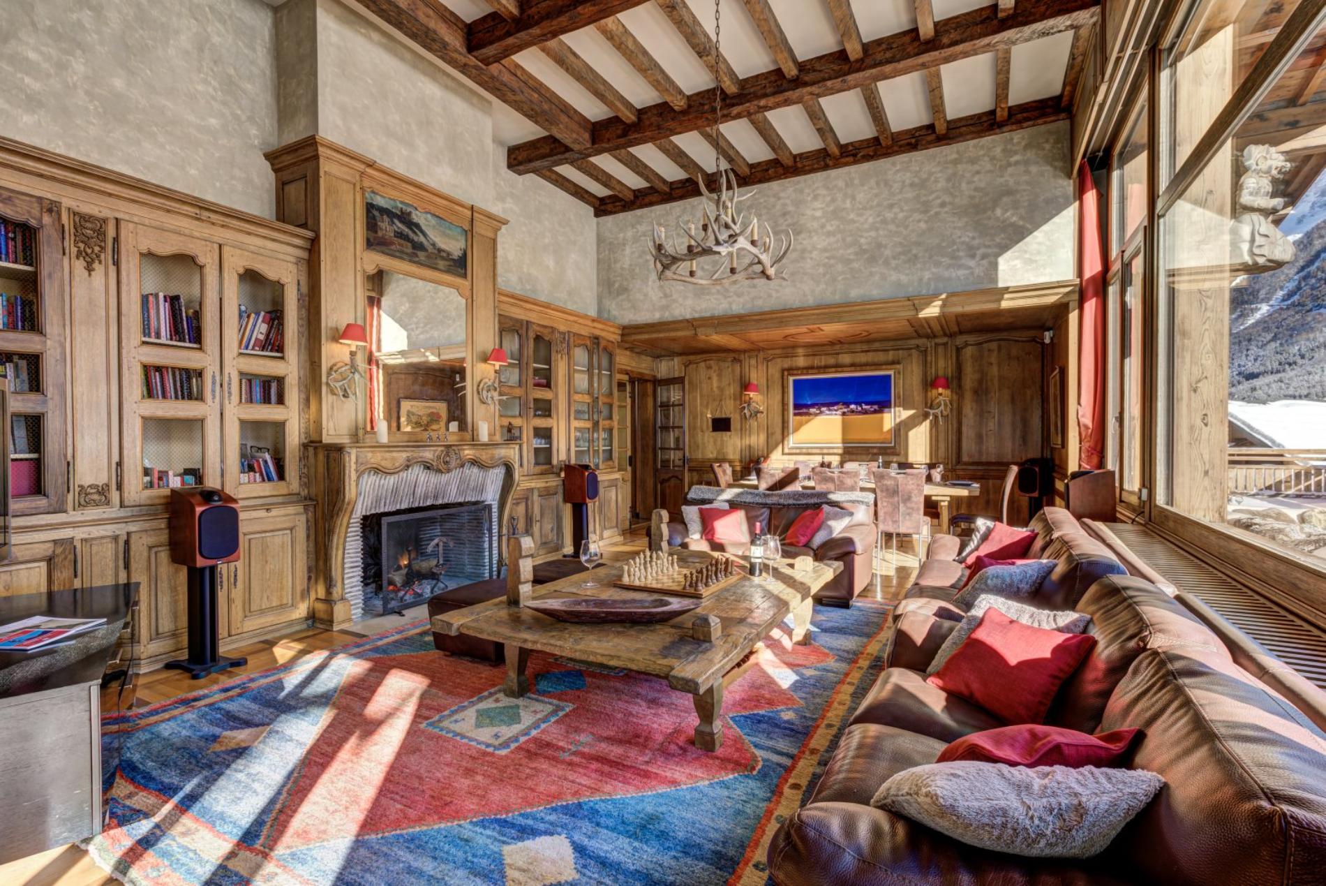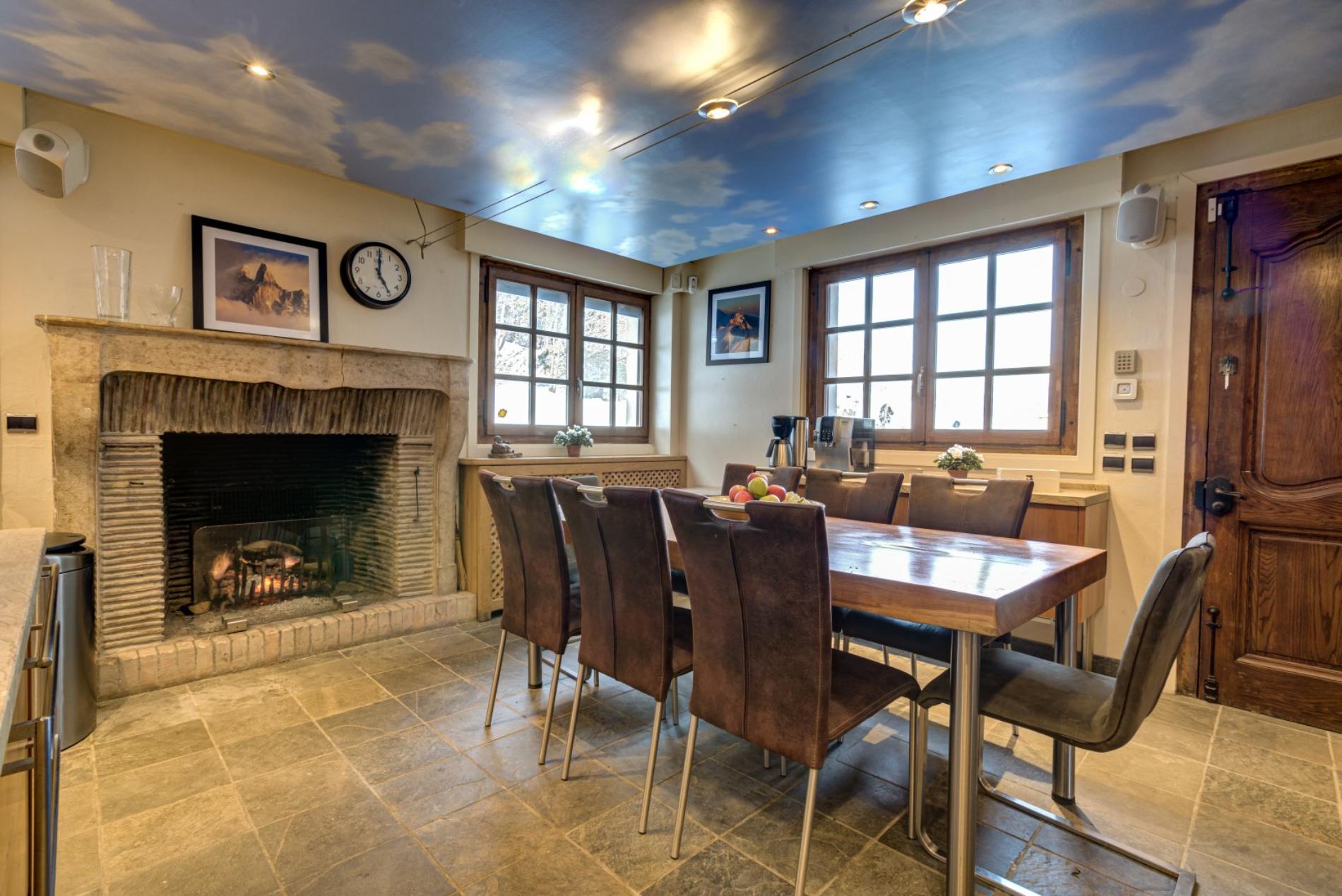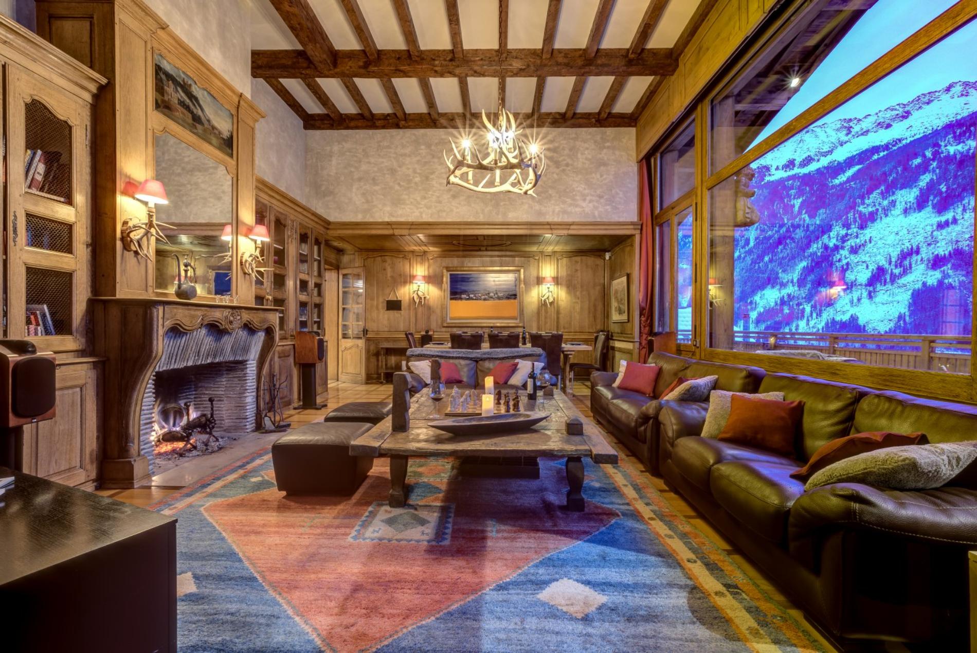 The living room has a wonderful open fire place, with large windows offering magnificent views directly up to Mt Blanc