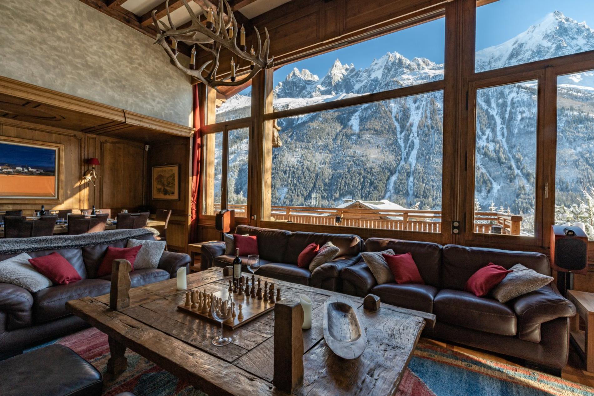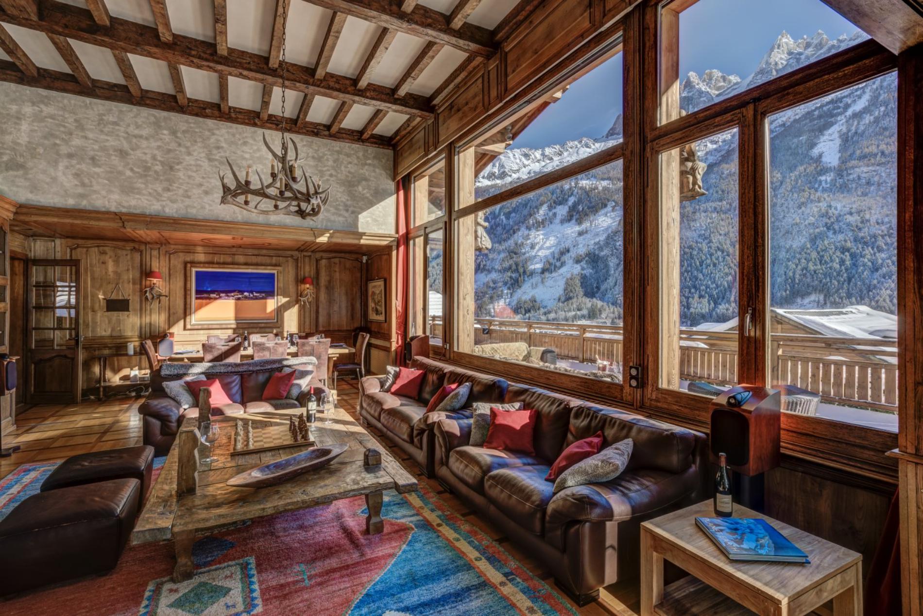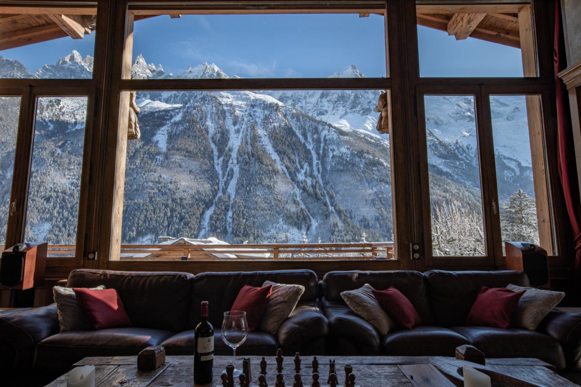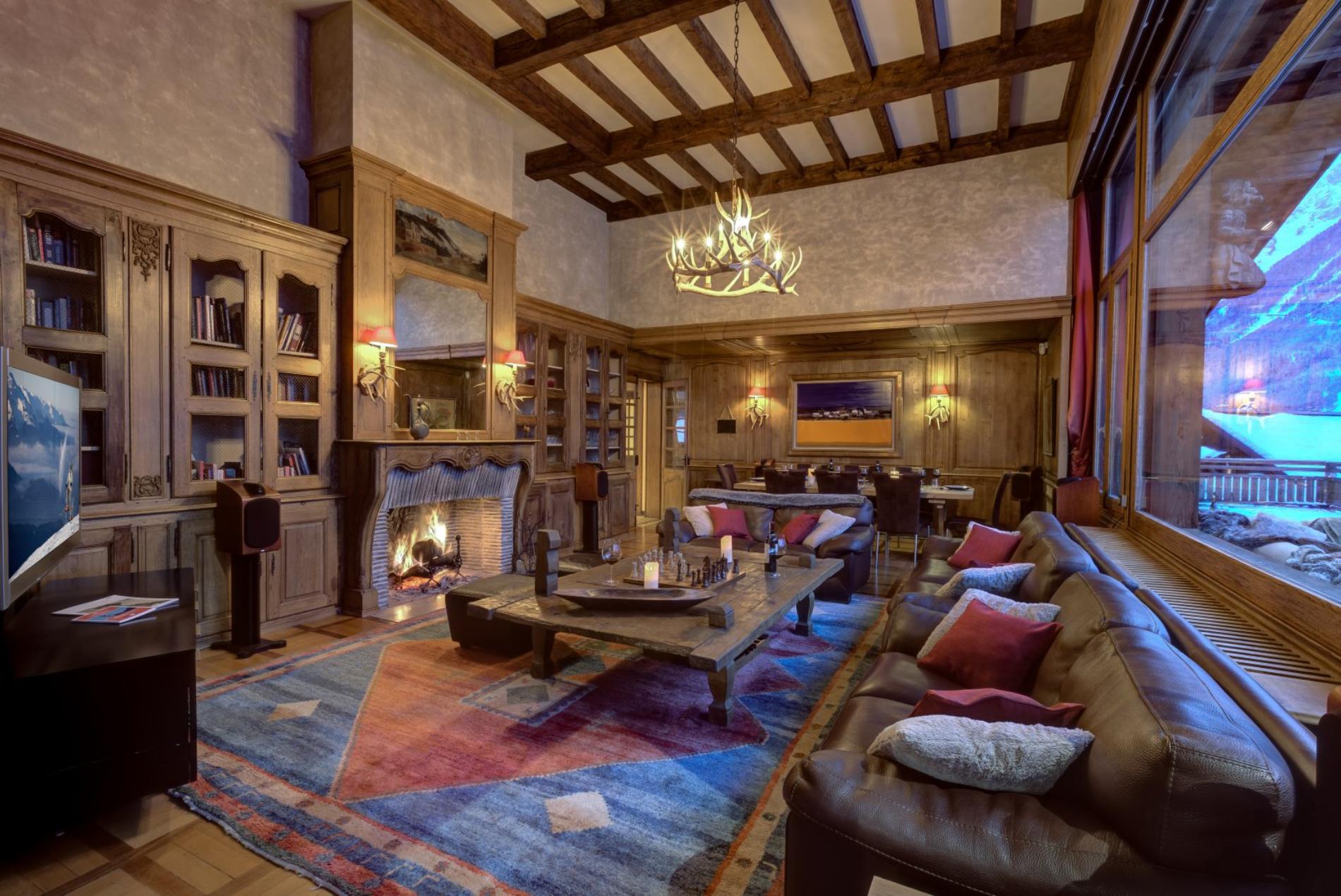 The living room has a wonderful open fire place, with large windows offering magnificent views directly up to Mt Blanc