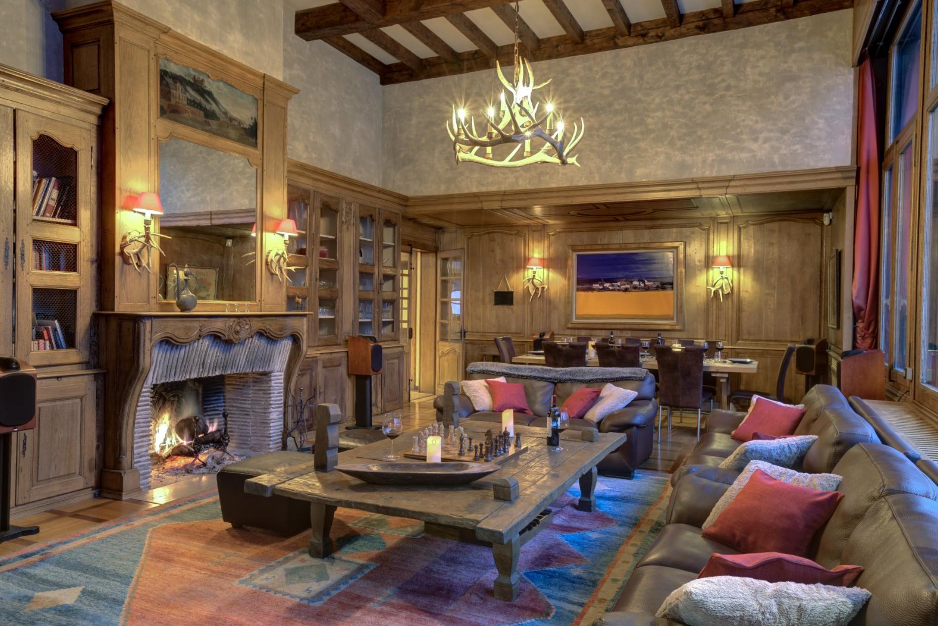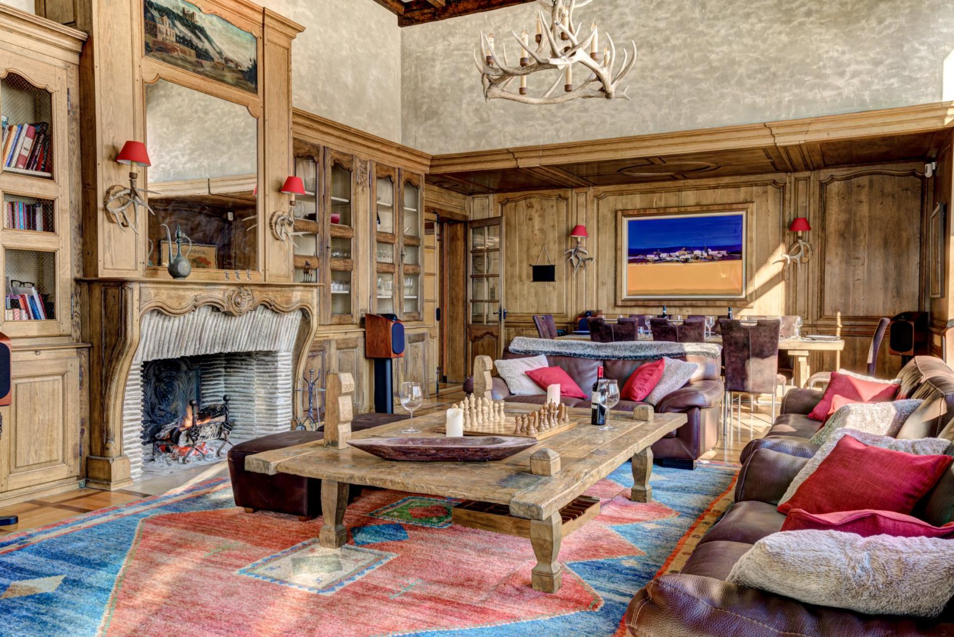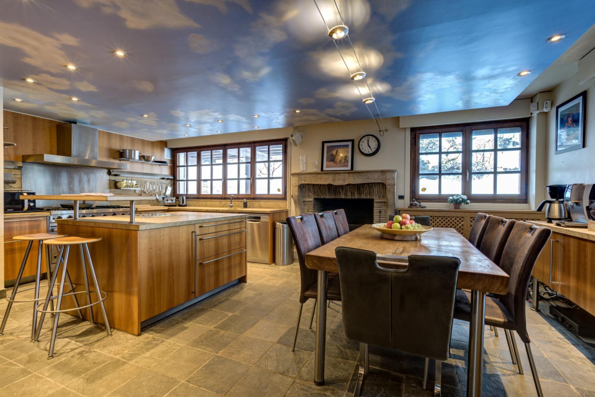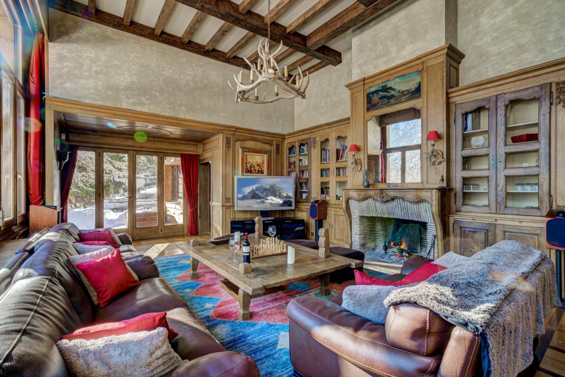 The living room has a wonderful open fire place, with large windows offering magnificent views directly up to Mt Blanc