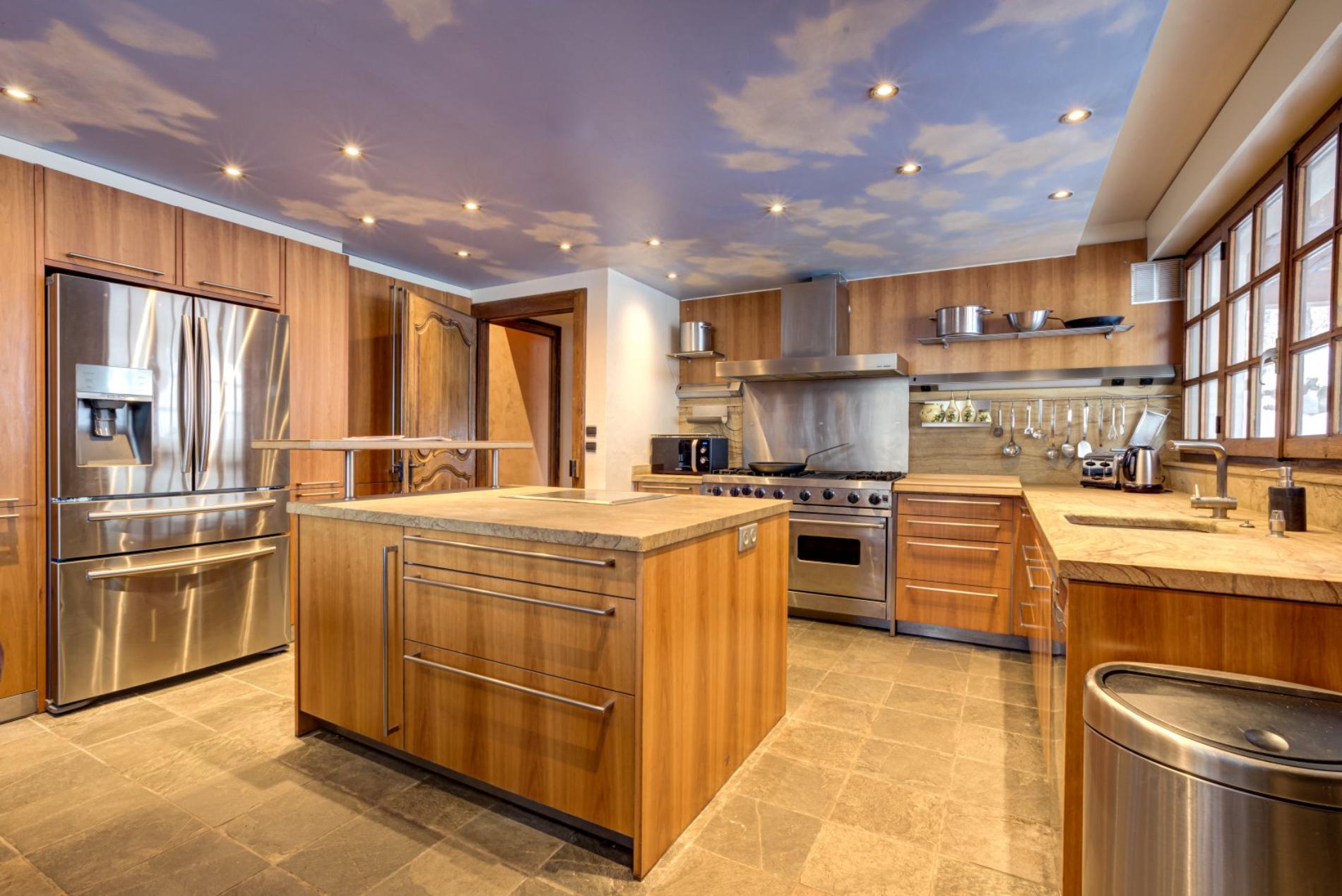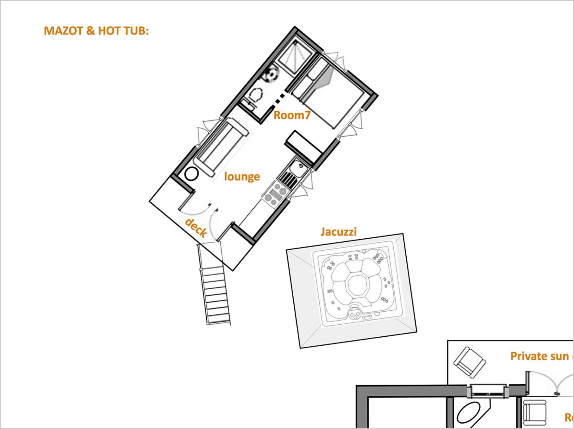 The kitchen area offers direct access to the hot tub and exterior mazot.