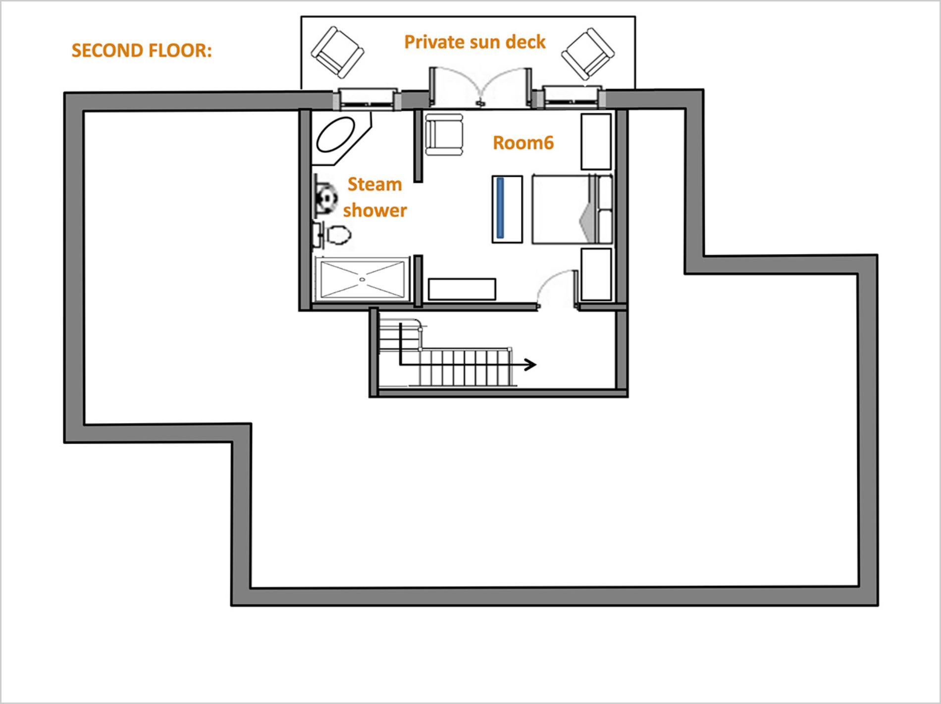Double bed with fire place and TV, bubble bath with steam shower and separate wc.