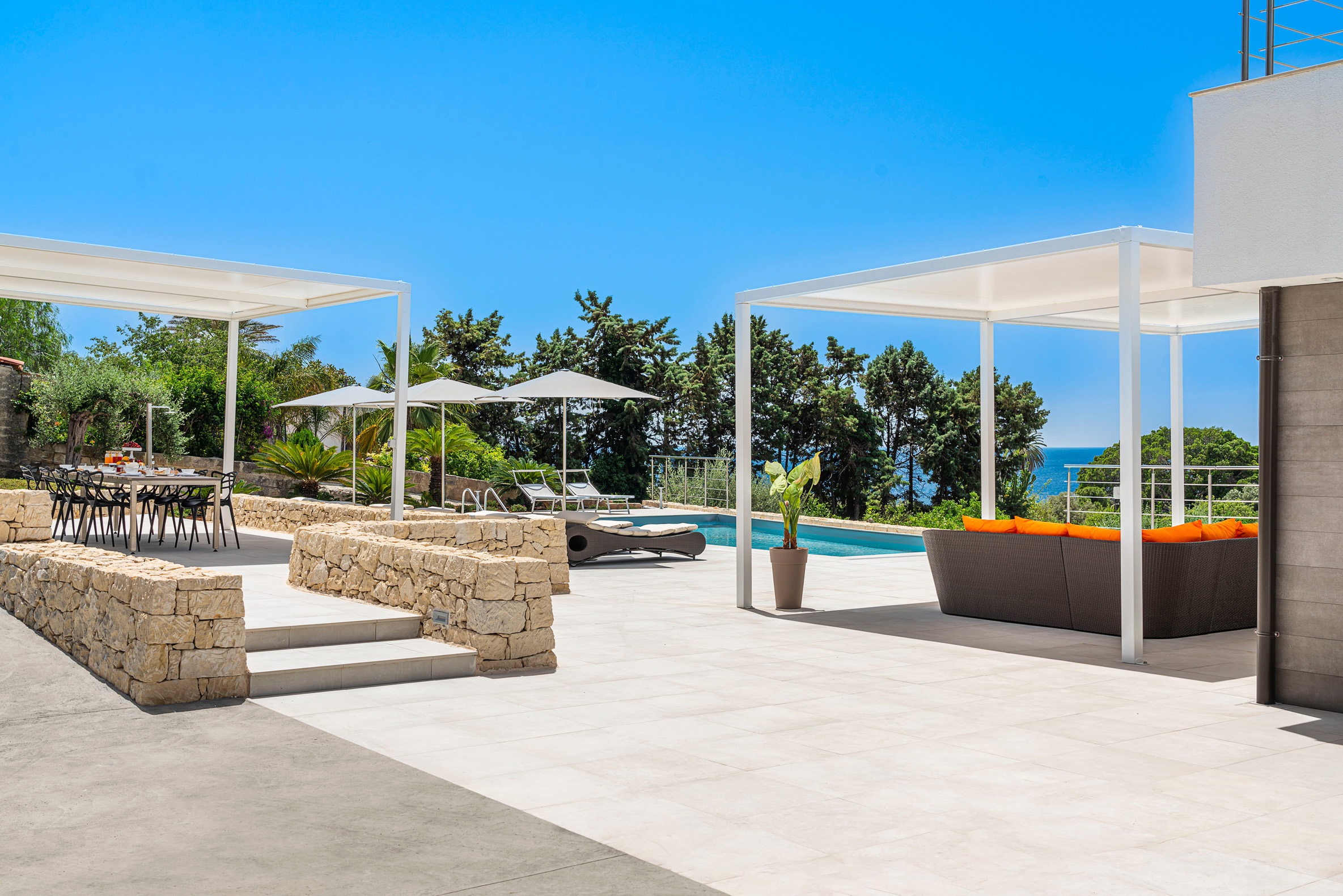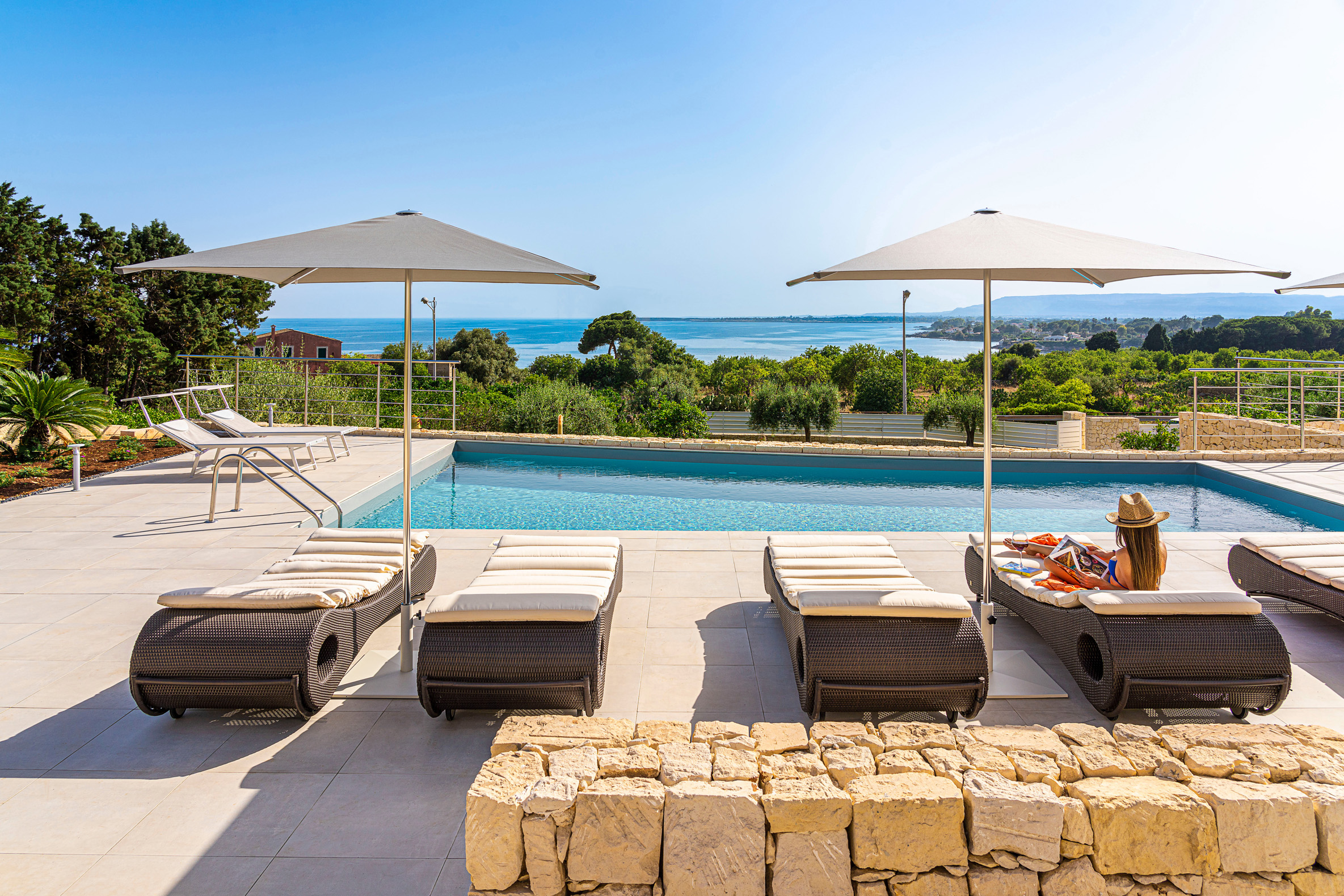 Villa Nina is a luxury villa with pool situated in the heart of the Plemmirio marine reserve, a few kilometres away from the historic centre of Syracuse. Set in a panoramic position, the property offers enchanting sea views, which can be enjoyed in total relaxation from its beautiful pool with solarium, its equipped terraces and garden.