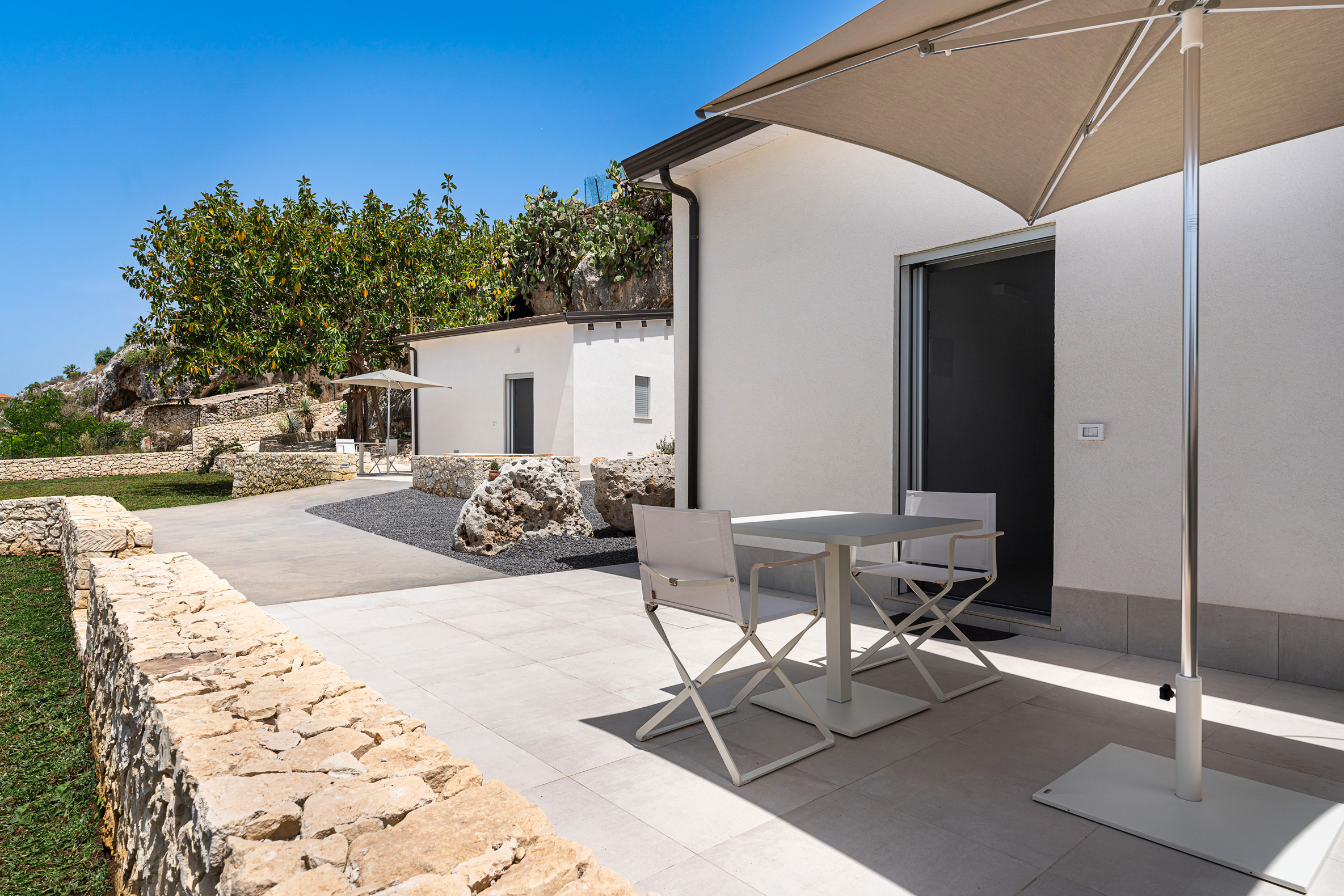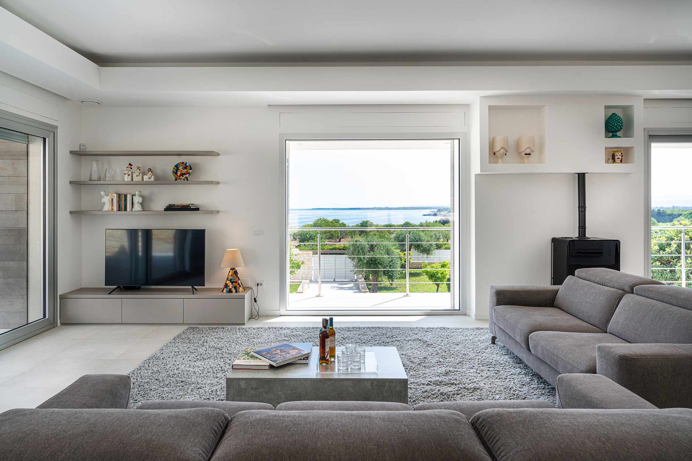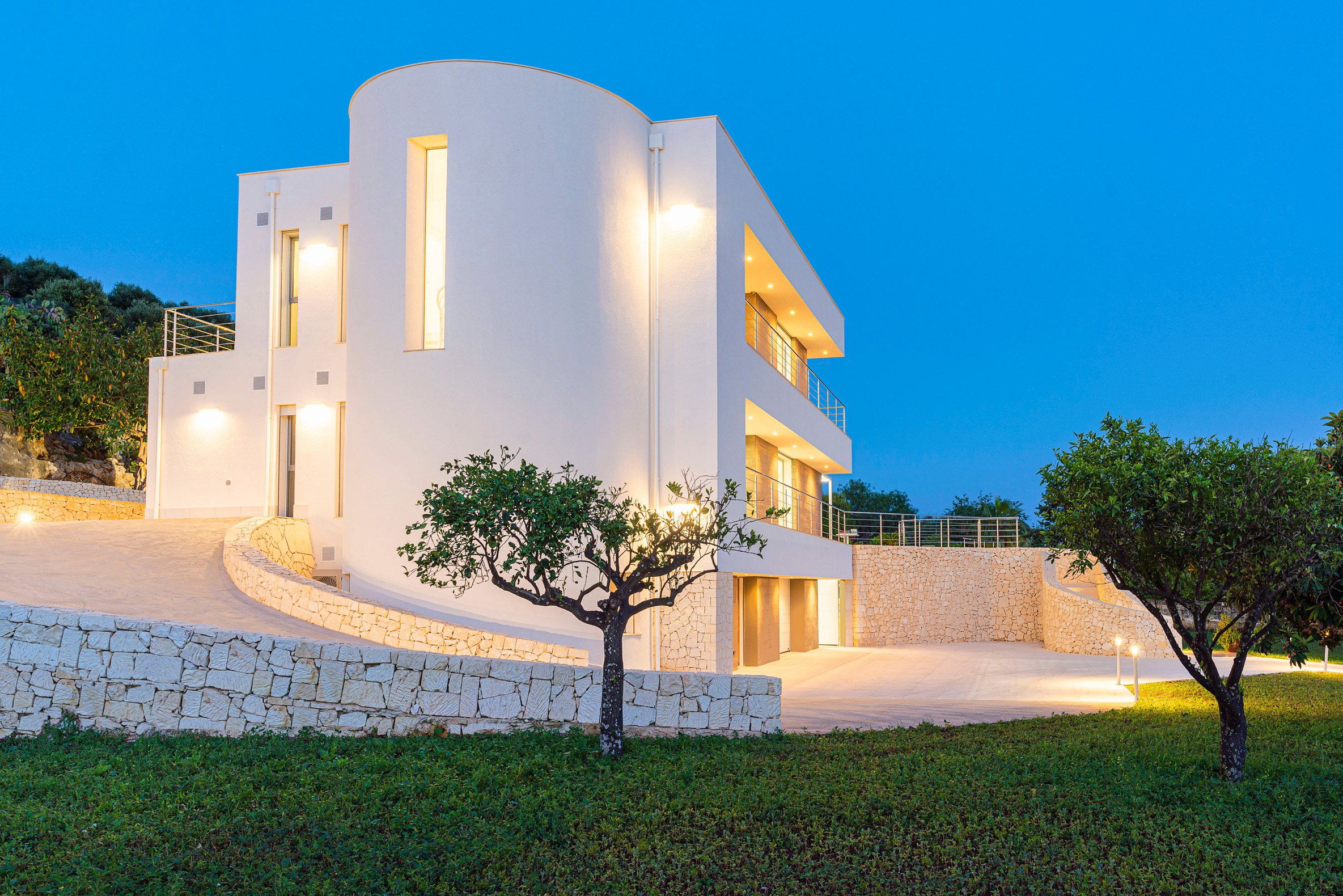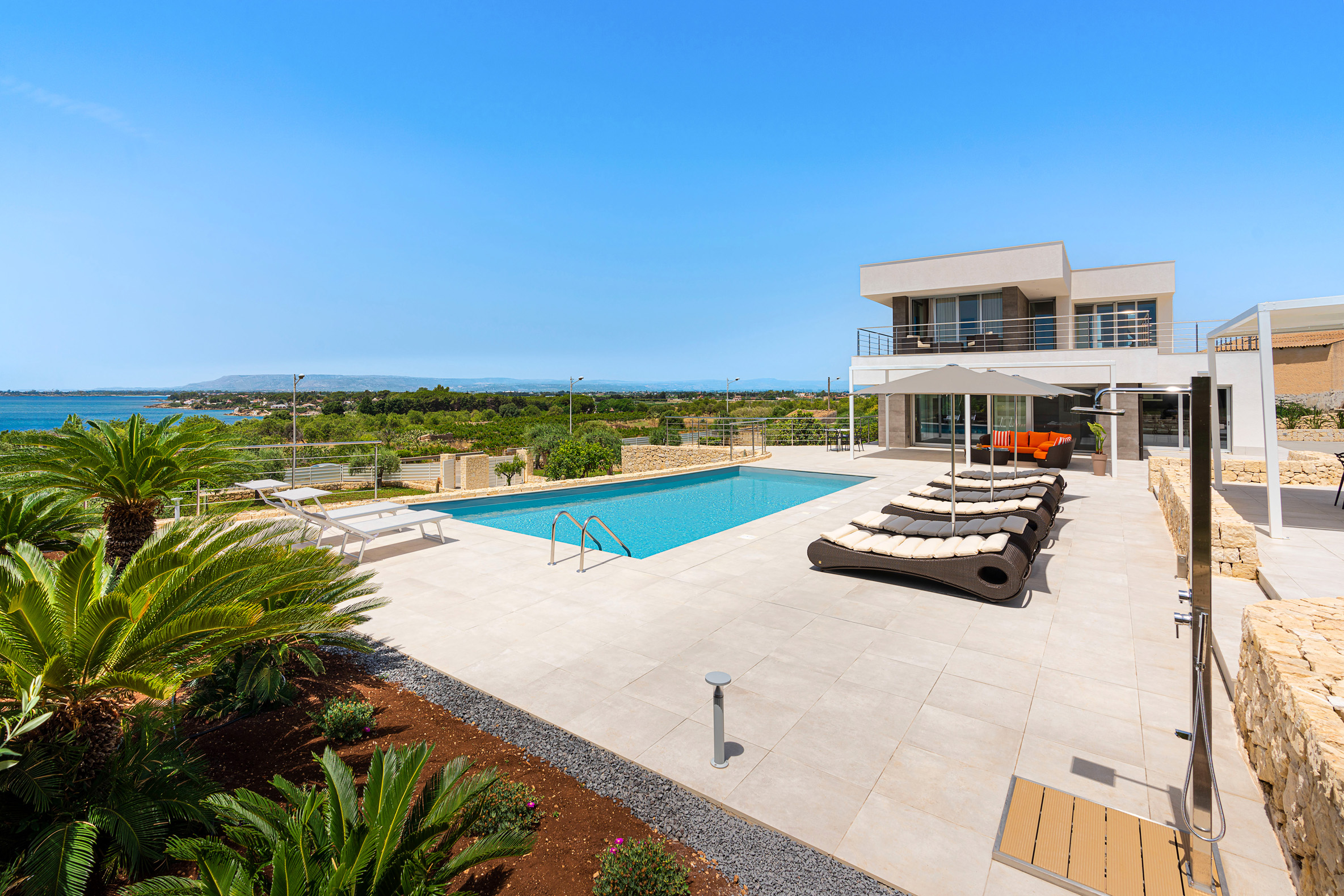 This contemporary style villa, newly built in 2022, boasts spacious interiors – with a surface area of over 400 square metres – and consists of a main house and two welcoming annexes. The exclusive saltwater swimming pool (chlorine-free) is heated. From the villa, that is just a few hundred meters from the cliffs and wonderful sea of the Plemmirio marine area, can be reached in a few minutes’ drive the evocative historic centre of Ortigia. In the vicinity can be visited the baroque towns of the Noto Valley, the nature reserves of Cavagrande del Cassibile and Vendicari, but also Catania, Mount Etna and Taormina.