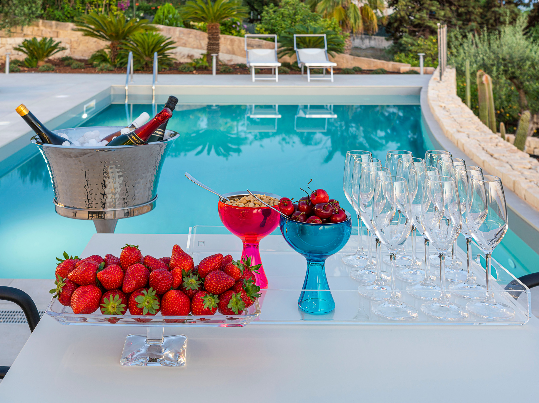 Bath linen: midweek change, Kitchen linen, Bed linen: midweek change, Pool towels: midweek change, Welcome basket: breakfast products; Kitchen, bathrooms and bedrooms cleaned: twice a week – 4 h