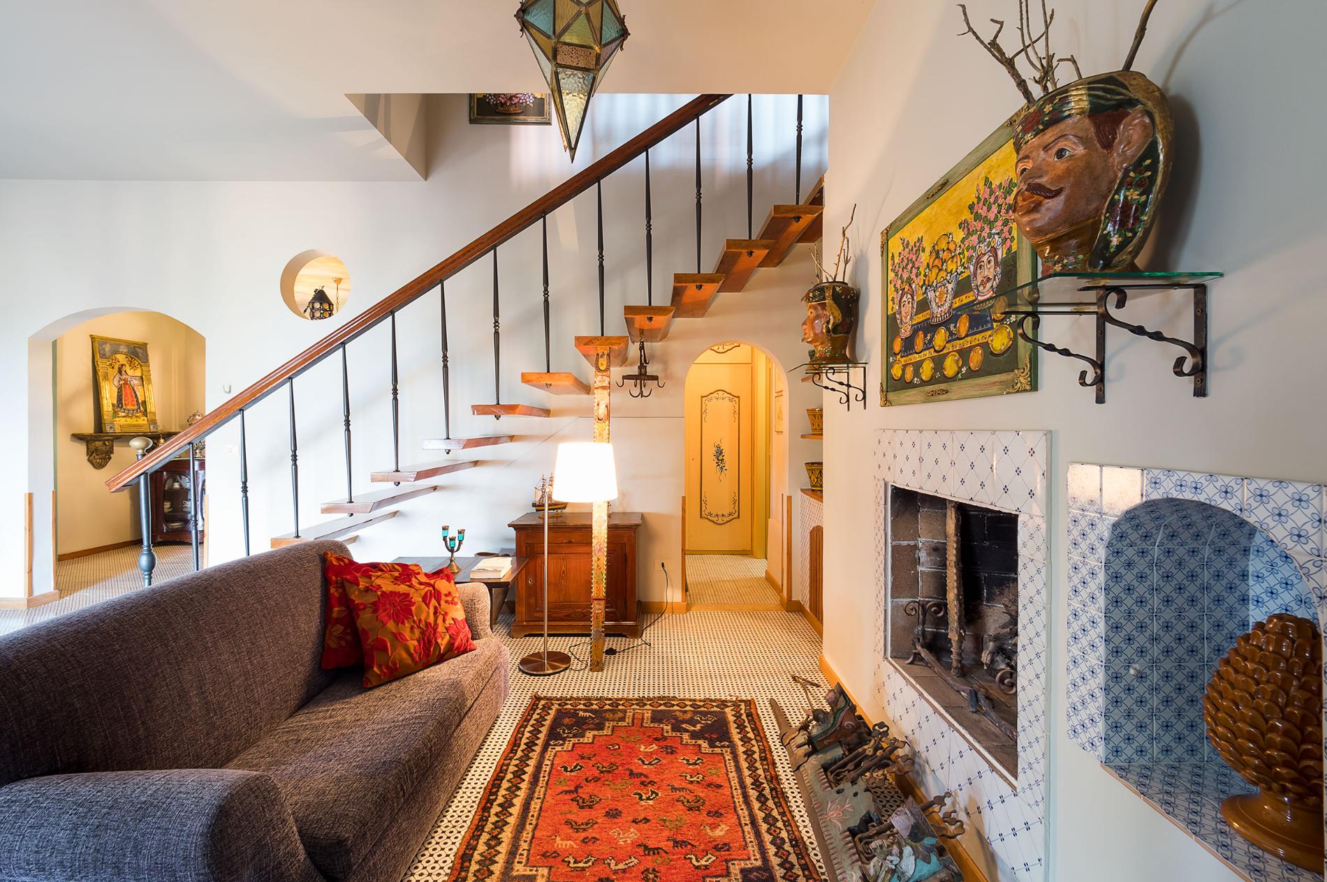 Spread over two levels, the villa comfortable interiors include on the ground floor a bedroom with an en-suite bathroom and a large living area with sitting room with TV, lounge with big screen and projector, study, dining room, kitchen and guest bathroom. From the living room two staircases lead to the first floor where there are four romantic bedrooms and four bathrooms.