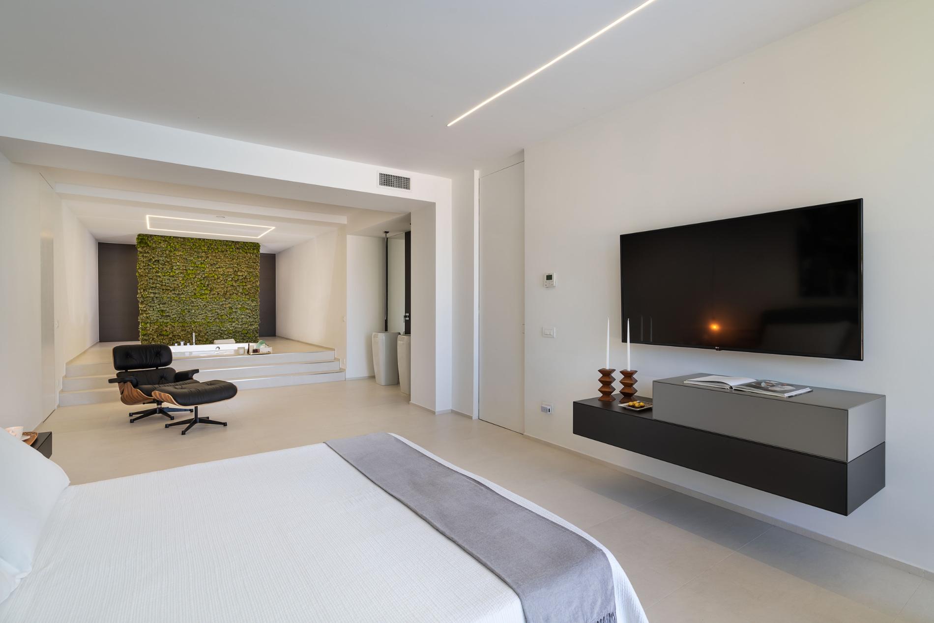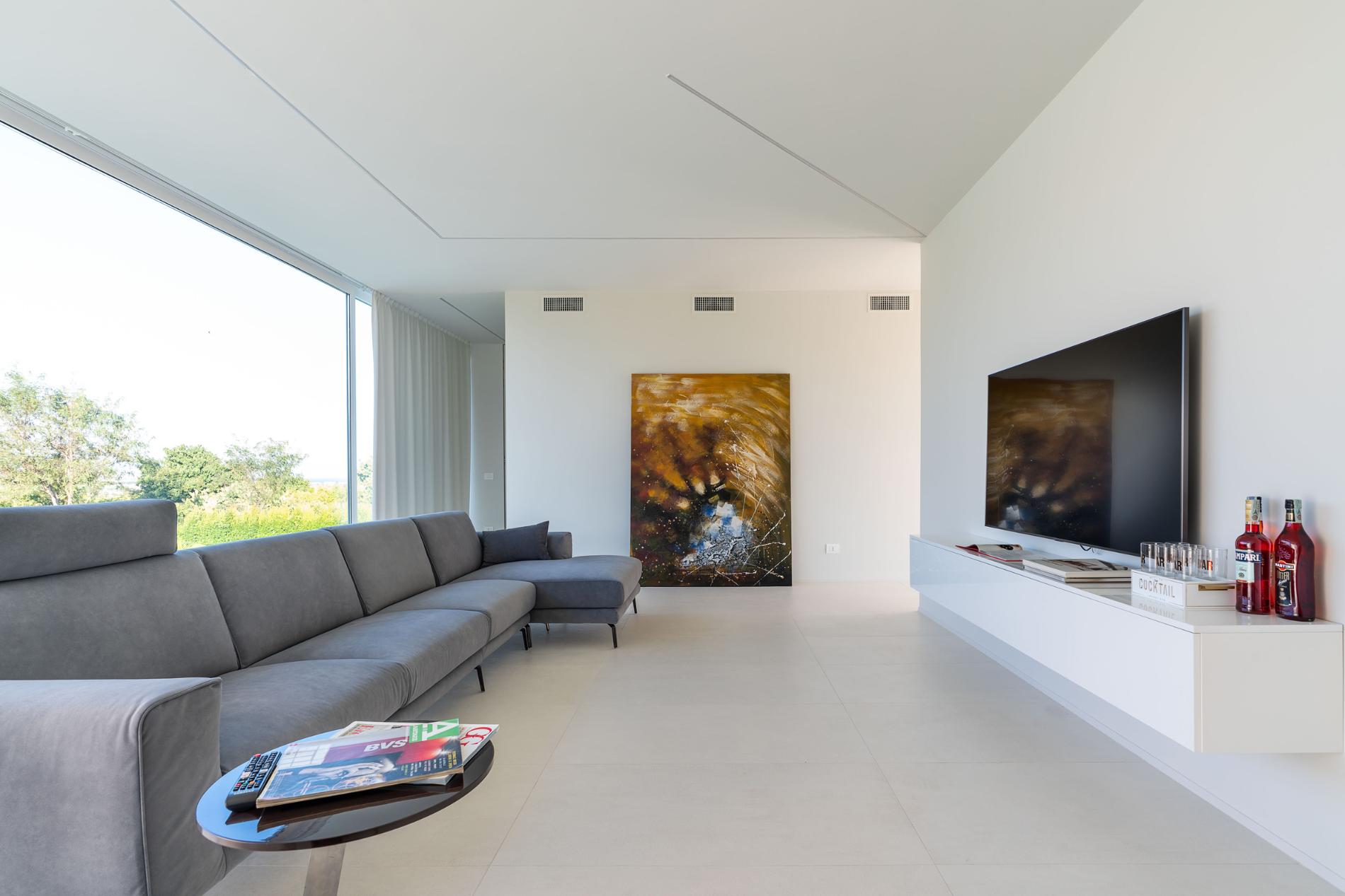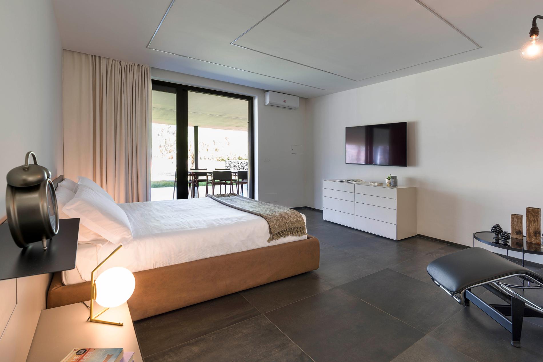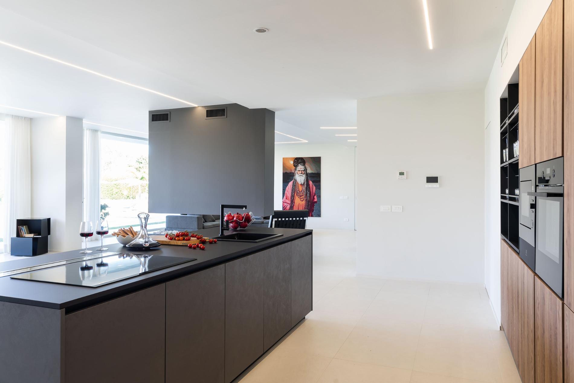 Set on two levels, this exclusive, newly built contemporary villa features bright, cosy interiors with large glass doors open onto the garden and the surrounding landscape.