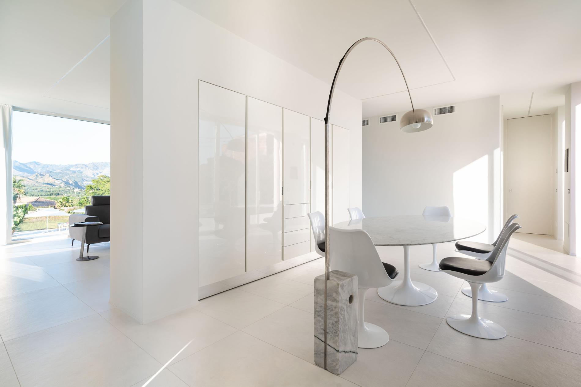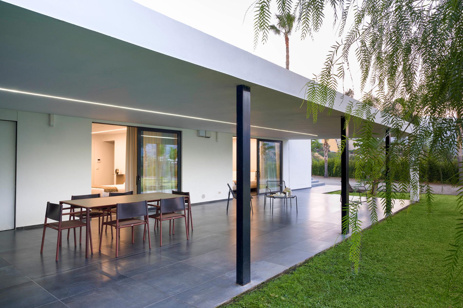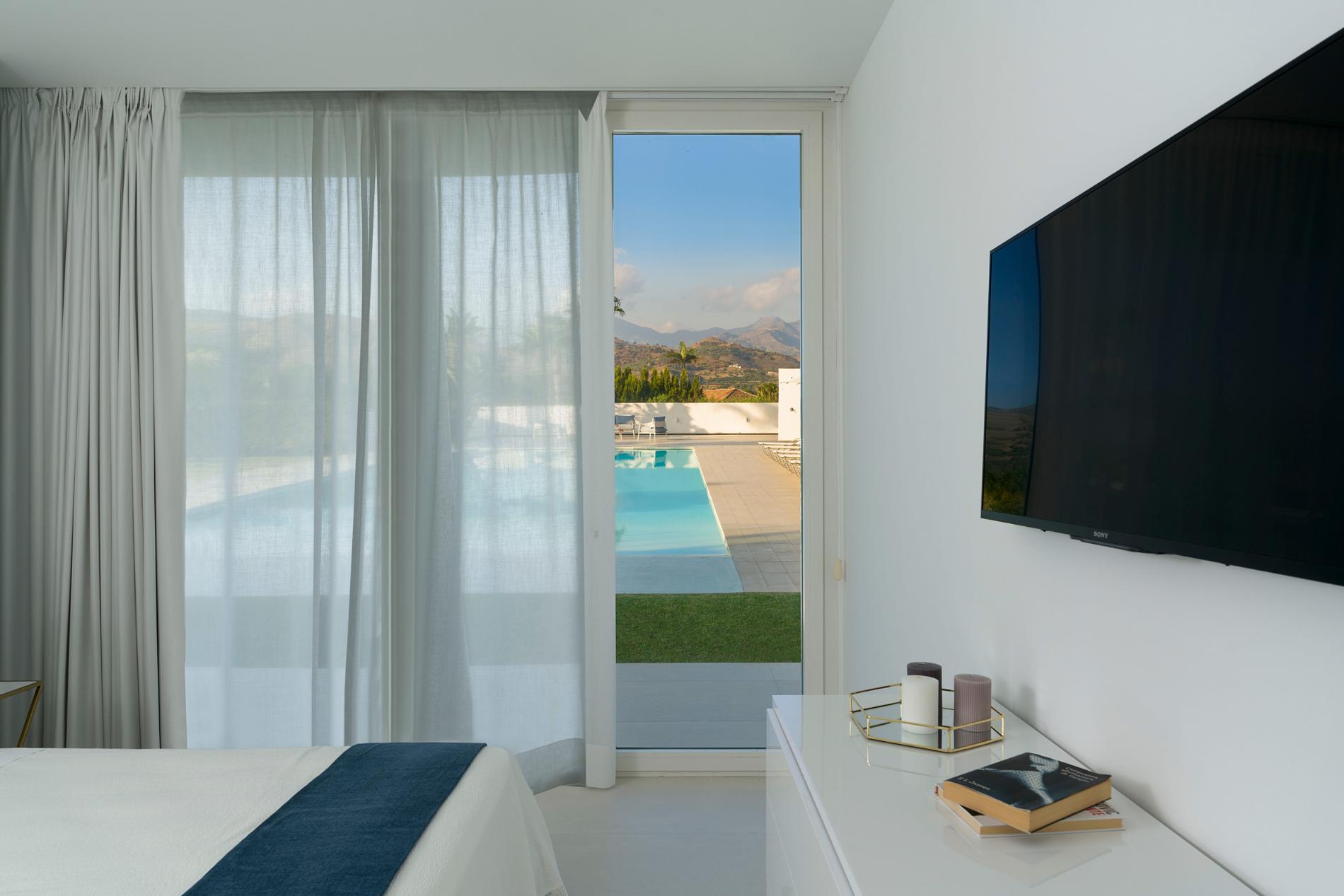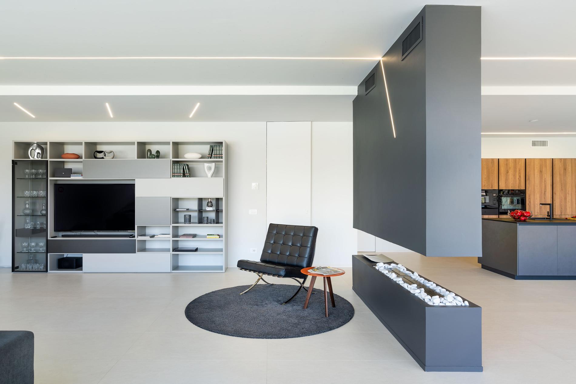 Set on two levels, this exclusive, newly built contemporary villa features bright, cosy interiors with large glass doors open onto the garden and the surrounding landscape.