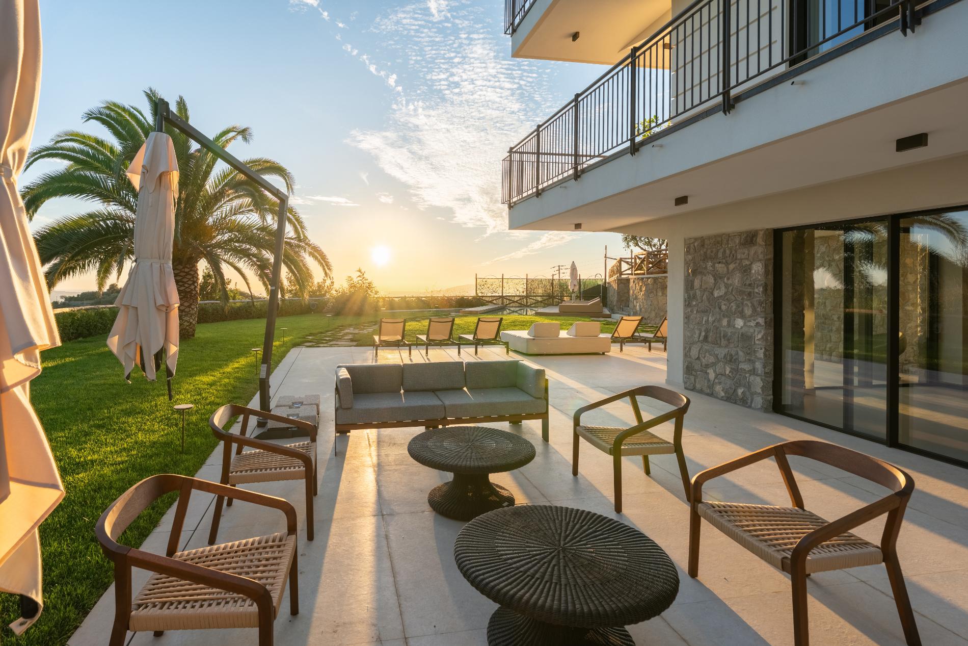 The entrance to Villa is via an uphill driveway with access through an electric gate and a pedestrian passageway. Upon arrival at the villa, we immediately find the covered parking area with an electric charging station and a large porch in a panoramic position with an outdoor relaxation area furnished with sofas and umbrellas. To the side of the villa is the pool area with a relaxation area and sunbathing areas, as well as an outdoor kitchen with barbecue.