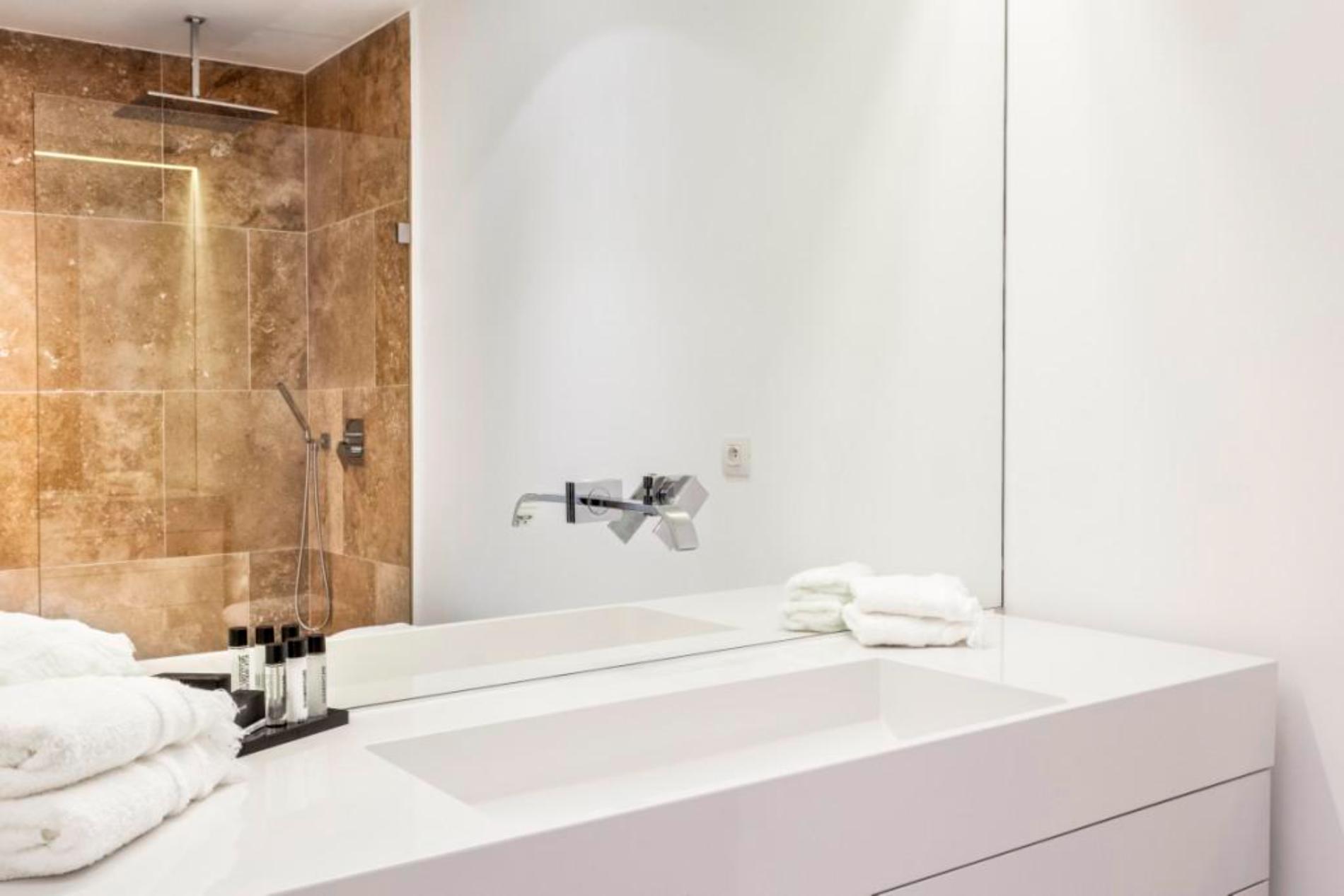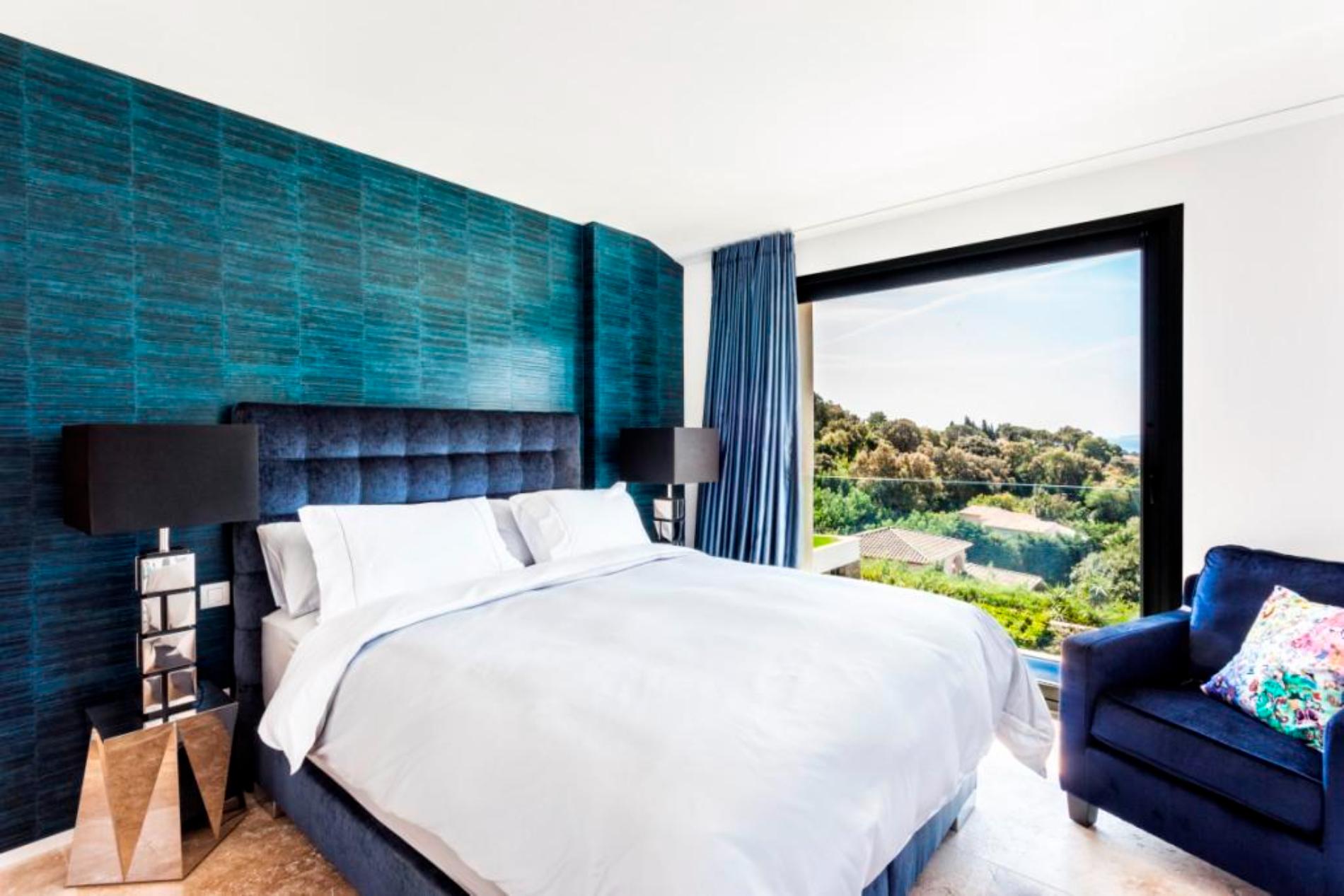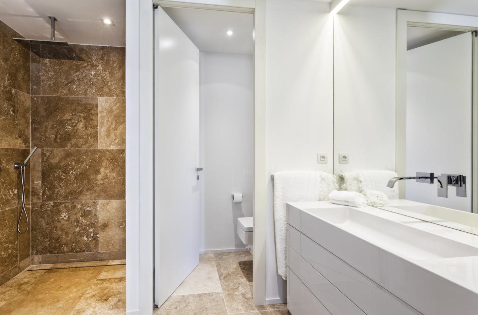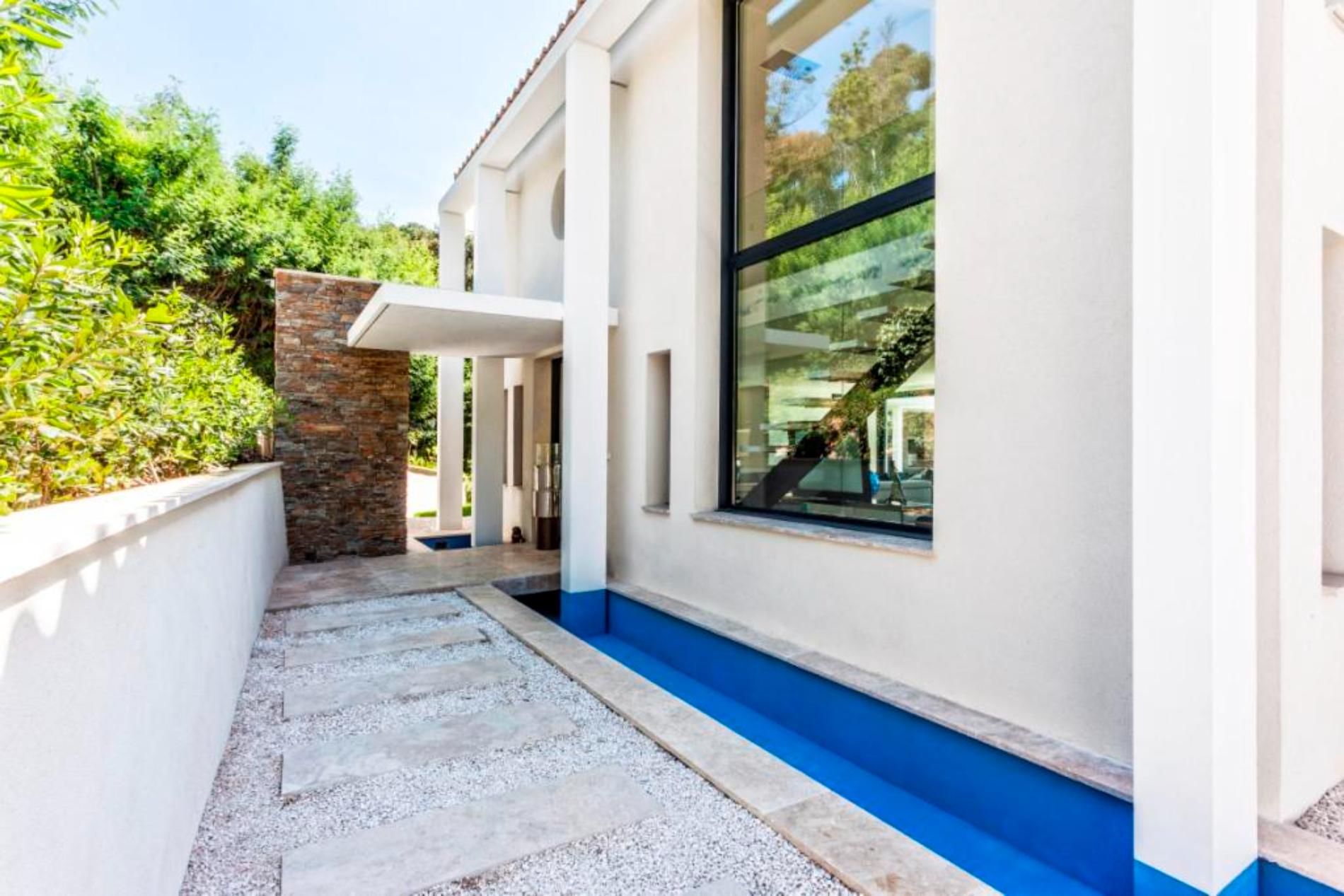 On the first floor is a huge master bedroom with a fireplace, shower and bathtub and two other bedrooms with bathrooms. All rooms have an amazing ocean view and open onto a terrace with sunbeds. On the lower floor you can find a cinema room, two more bedrooms (one with a huge patio with an olive tree) and a laundry room.