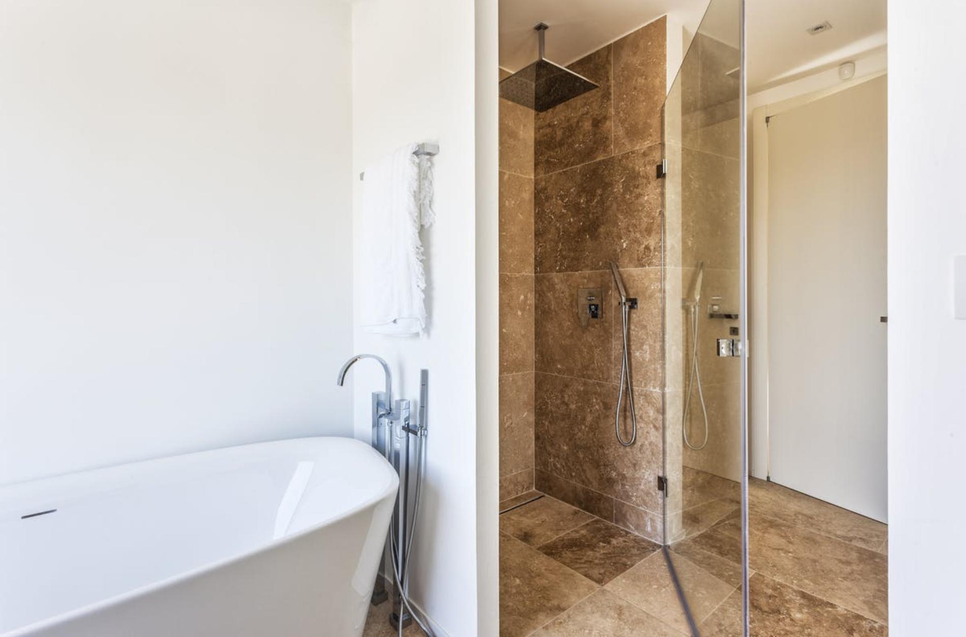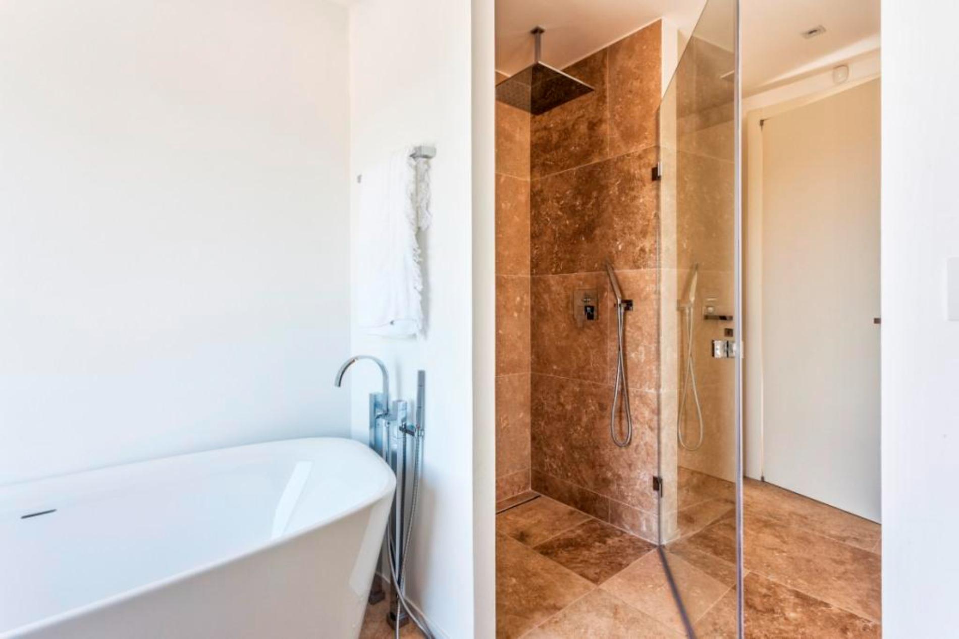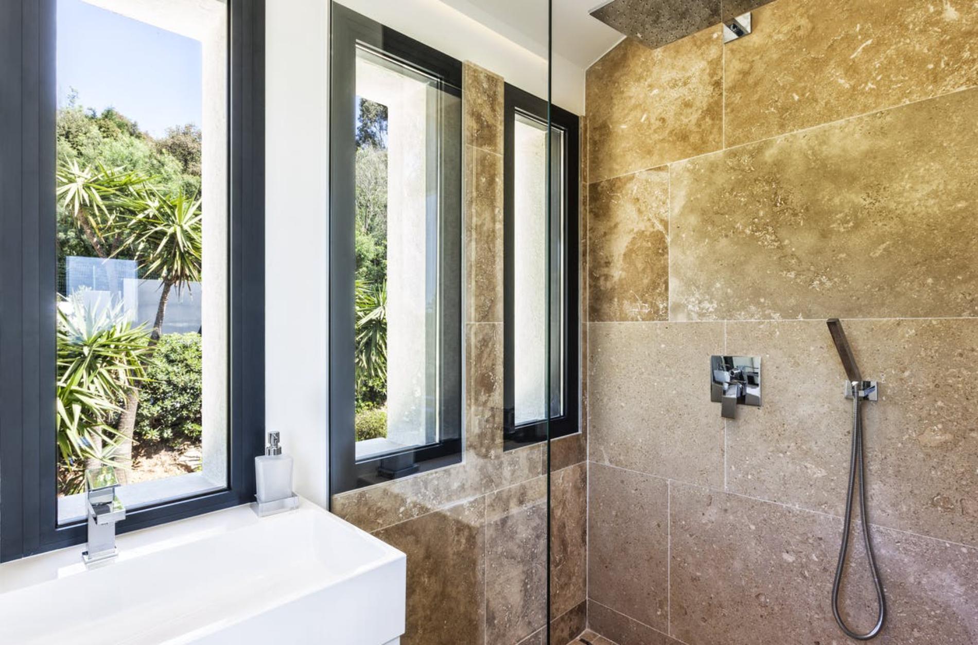 The outside space is equally beautiful and consists of a heated infinity pool and a huge jacuzzi. The pool house is equipped with a barbecue and the huge wooden table sets free the most wonderful view on the ocean and the Golden Islands.