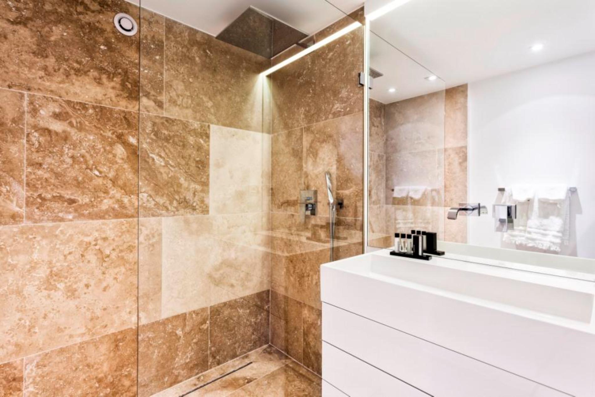 The spacious 3-level Villa St. Tropez has 5 bedrooms or 10 bnedrooms option. The ground floor consists of an entry hall and a bathroom, a huge living room with fireplace, a dining room, a salon and a large open and fully equipped kitchen.