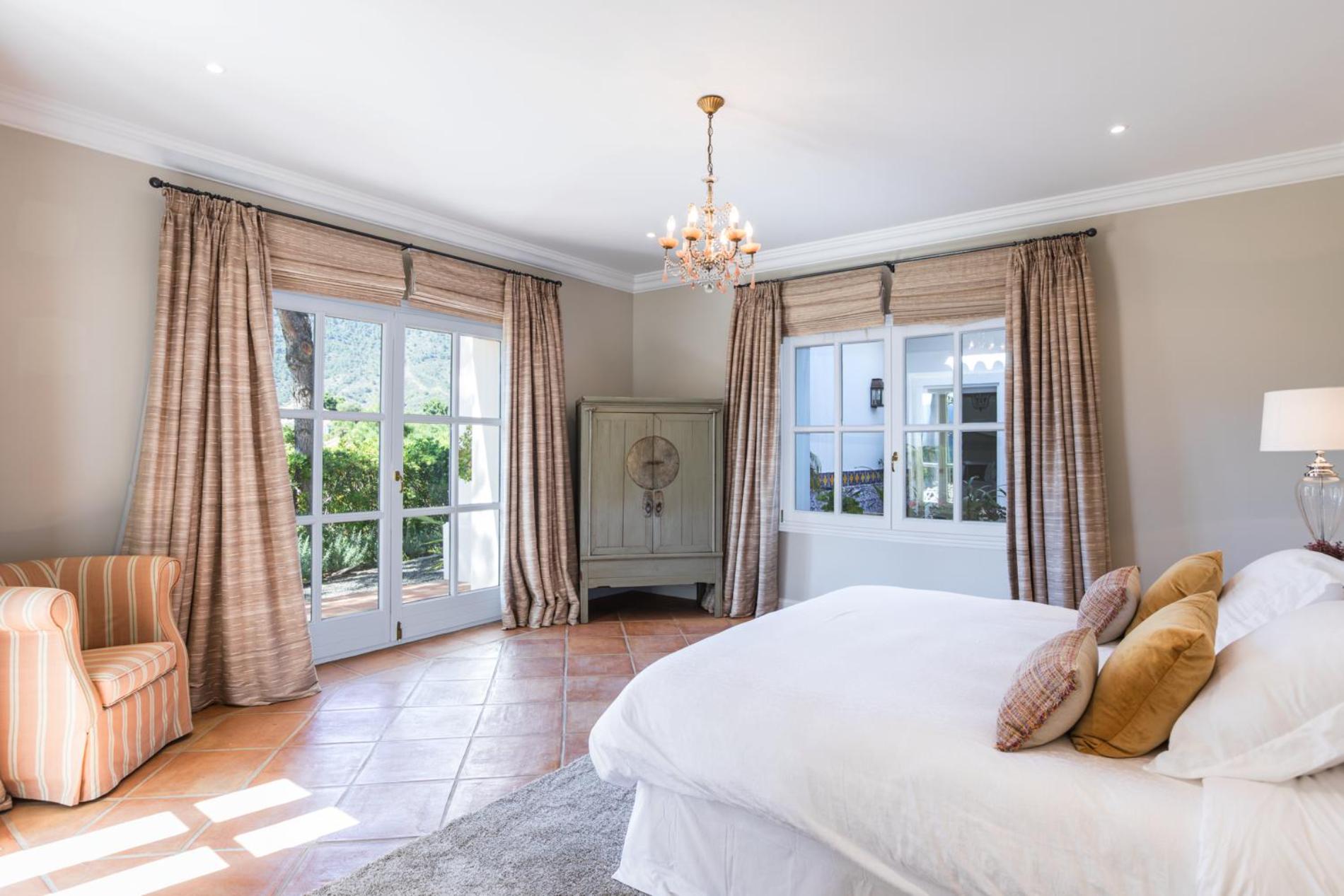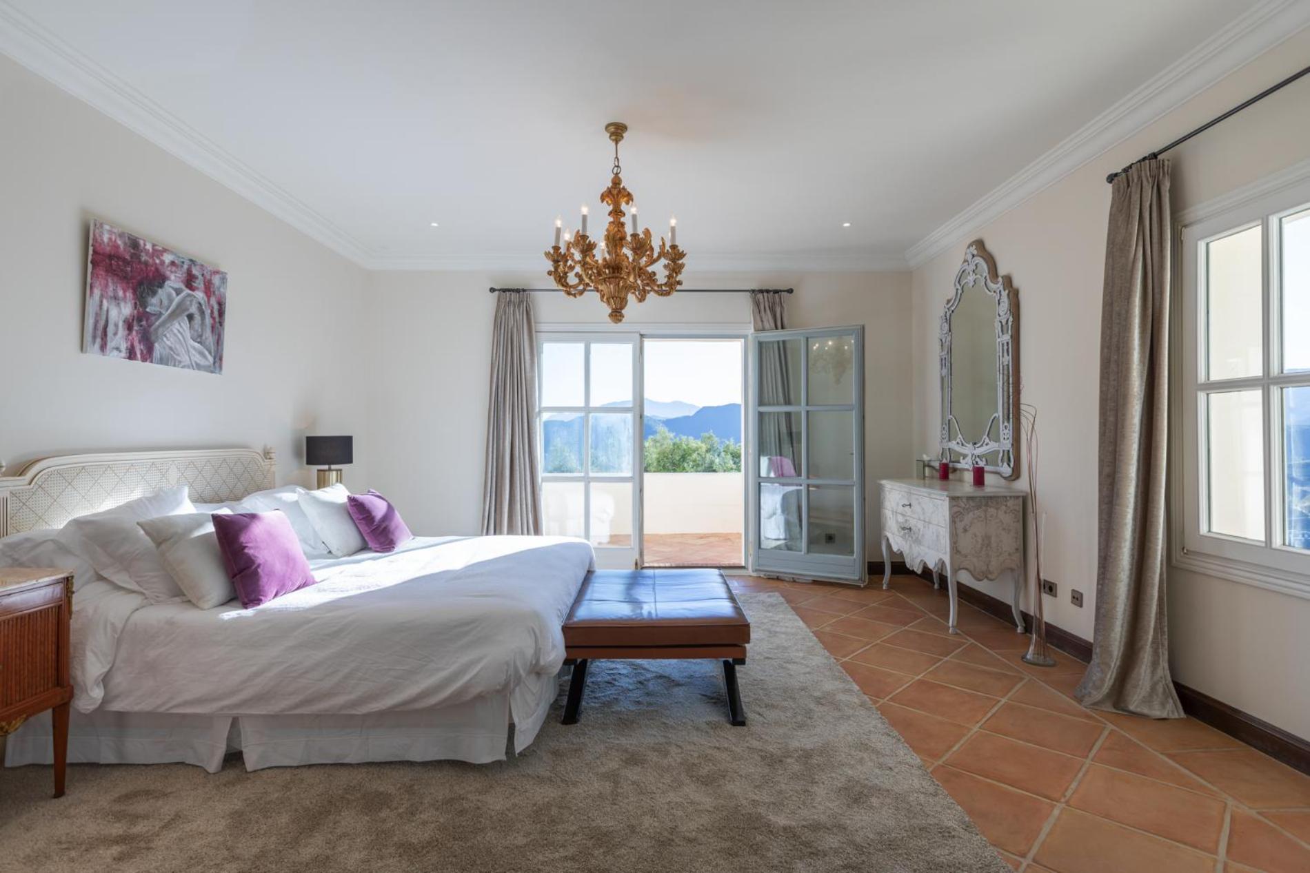 Bedroom 1 – Master Suite I: king size bed, ensuite bathroom with walk-in shower and whirlpool bath, TV, private terrace overlooking pool and mountains