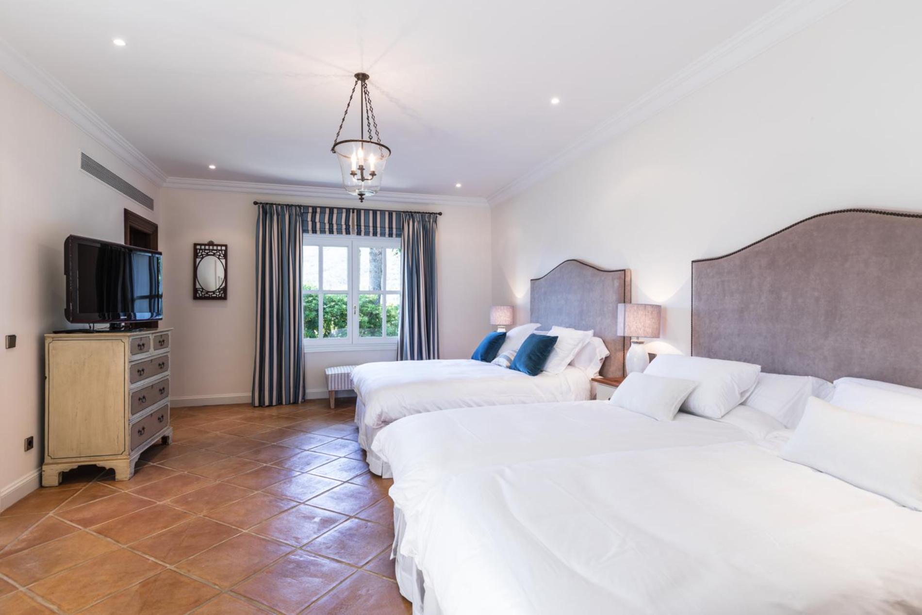 Bedroom 4: queen size bed and twin beds, ensuite bathroom with walk-in shower and bath, garden views