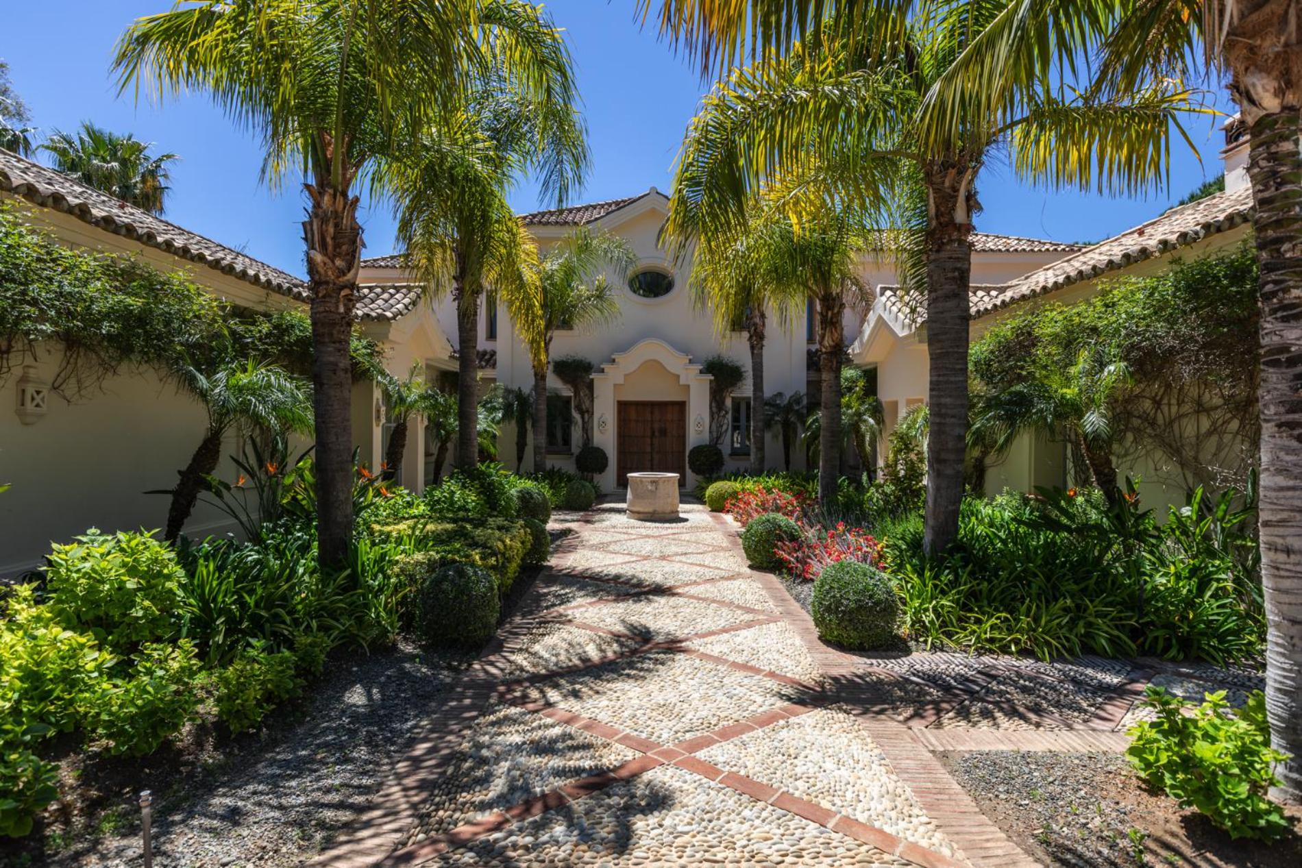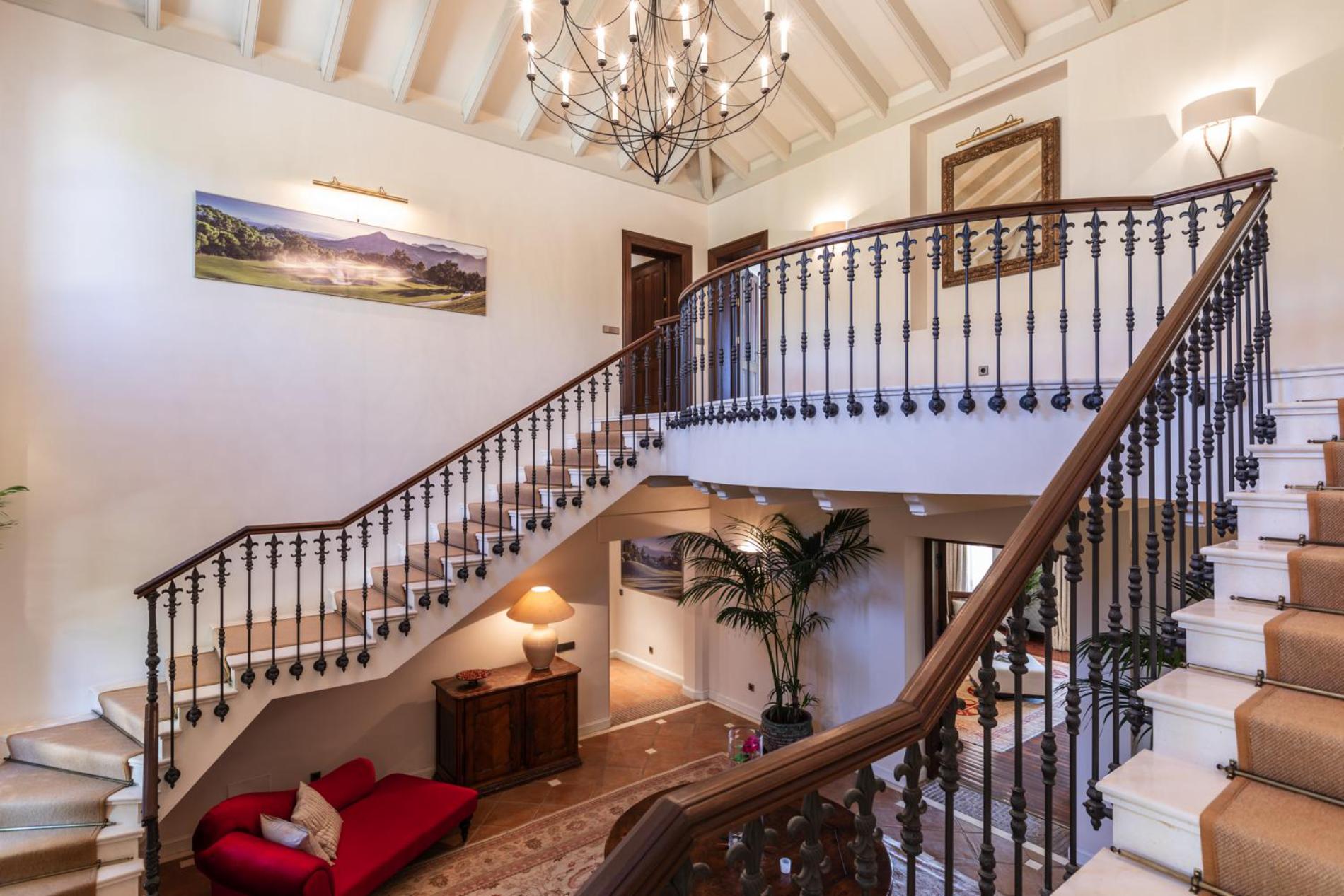Entering the gated residence, the palm trees stand to attention as you make your way into the magnificent double height entrance hall, with its beautiful vaulted ceiling, ornate double staircase, candle-style chandelier and antique furniture.