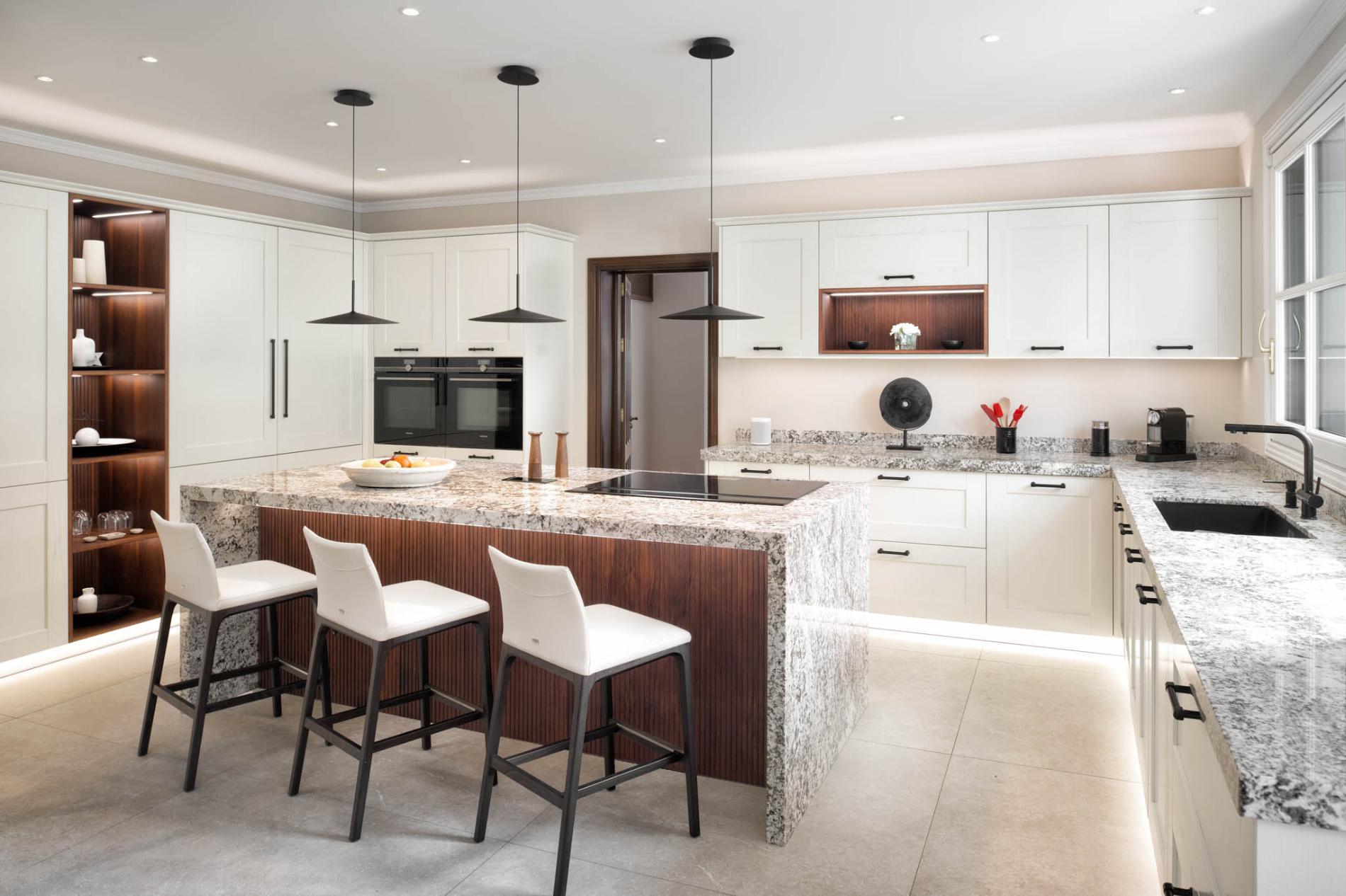 The large shaker-style kitchen is fully equipped with top brand appliances and has a breakfast bar and patio doors leading to the garden
