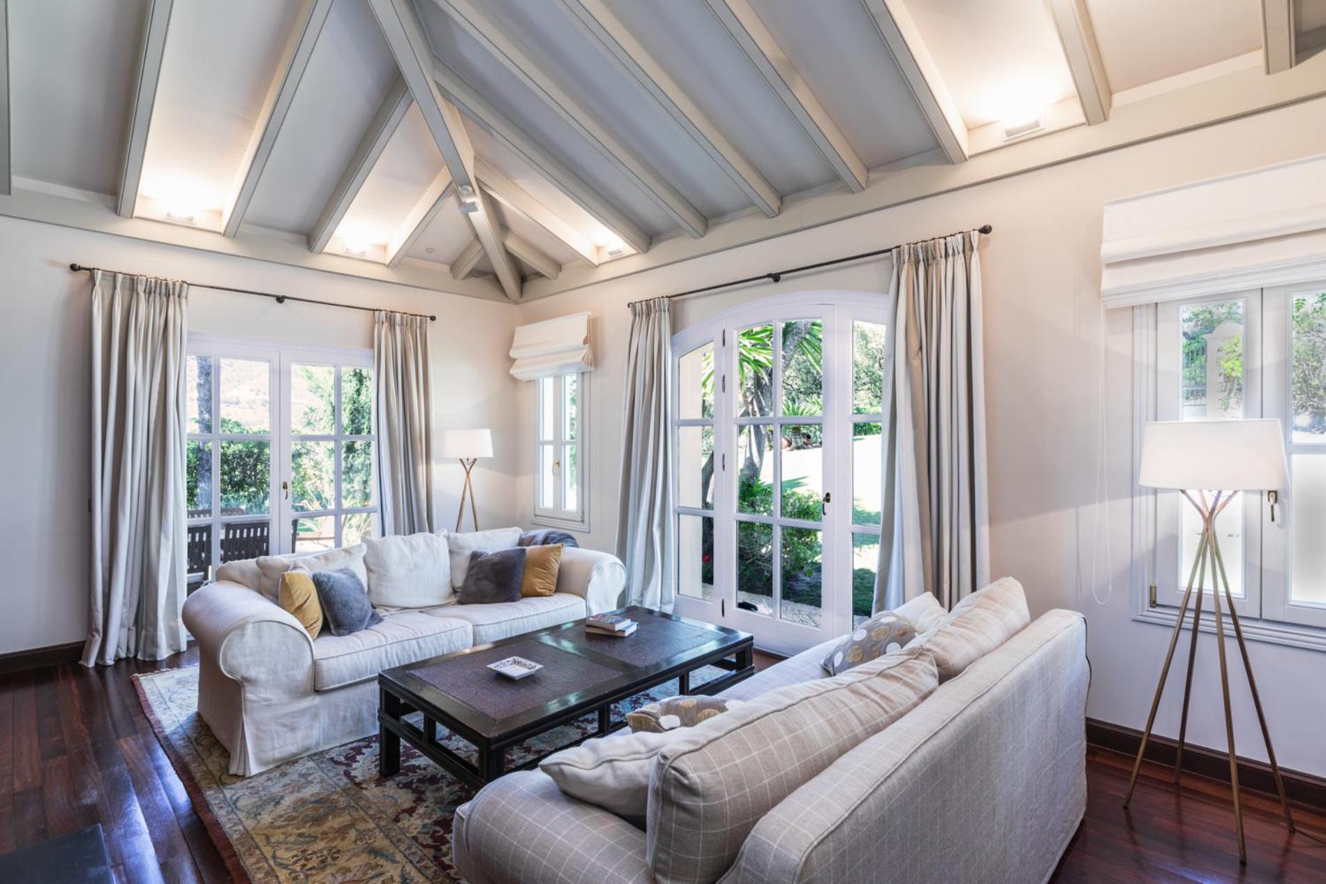 Dark wood doors lead into a classically furnished living room, with polished wooden floors and an inviting open hearth. From here, French doors open onto a covered outdoor lounge area, where you can relax on cosy wicker chairs and daybeds and marvel at the picture-perfect view.
