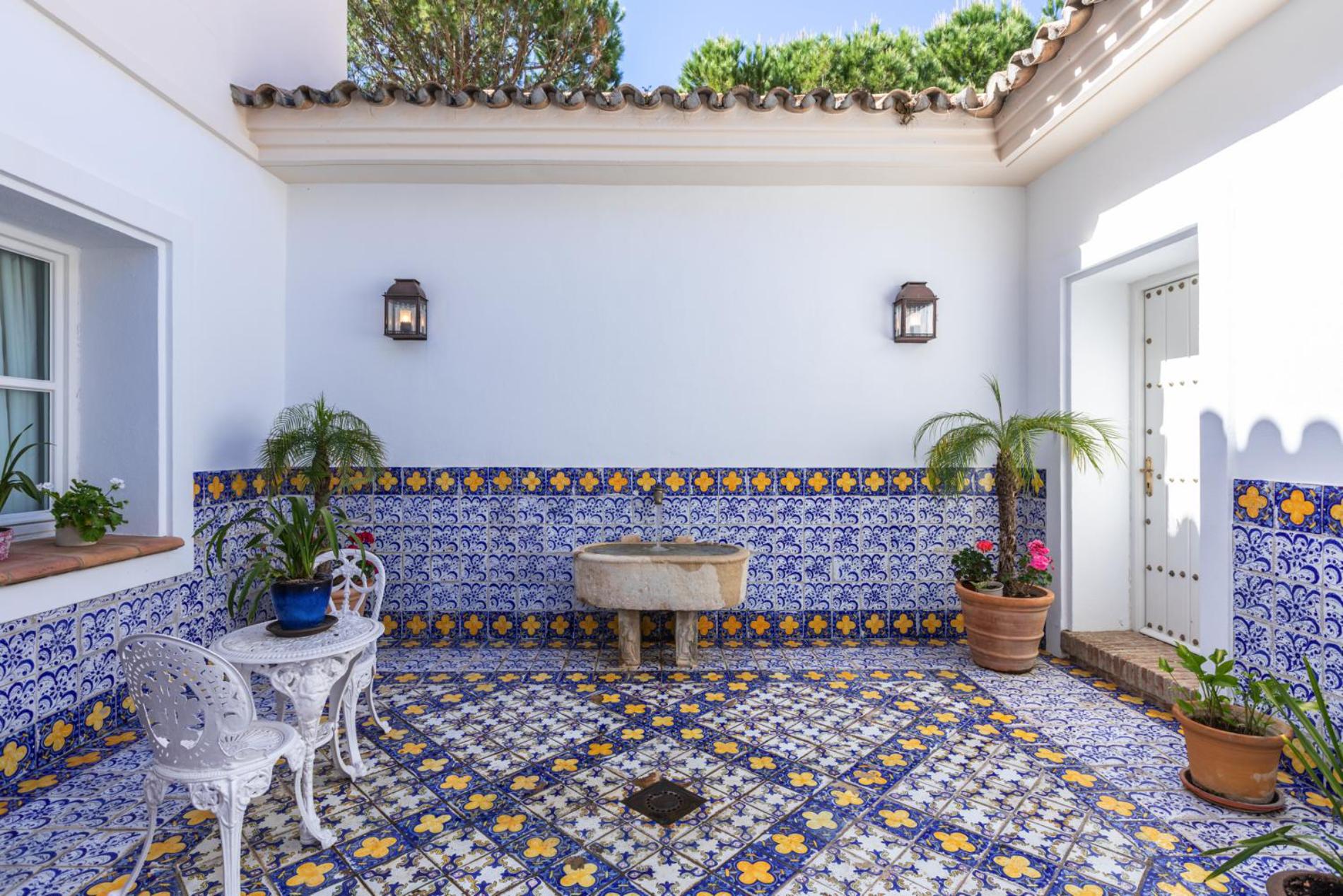 The vaulted ceiling and antique style continue into the formal dining room and the library/TV room, both with French doors leading to the garden. Off the library, there is the enchanting Andalusian patio, with traditional patterned tiles and a charming water feature adding an extra layer of charm to this wonderful home.