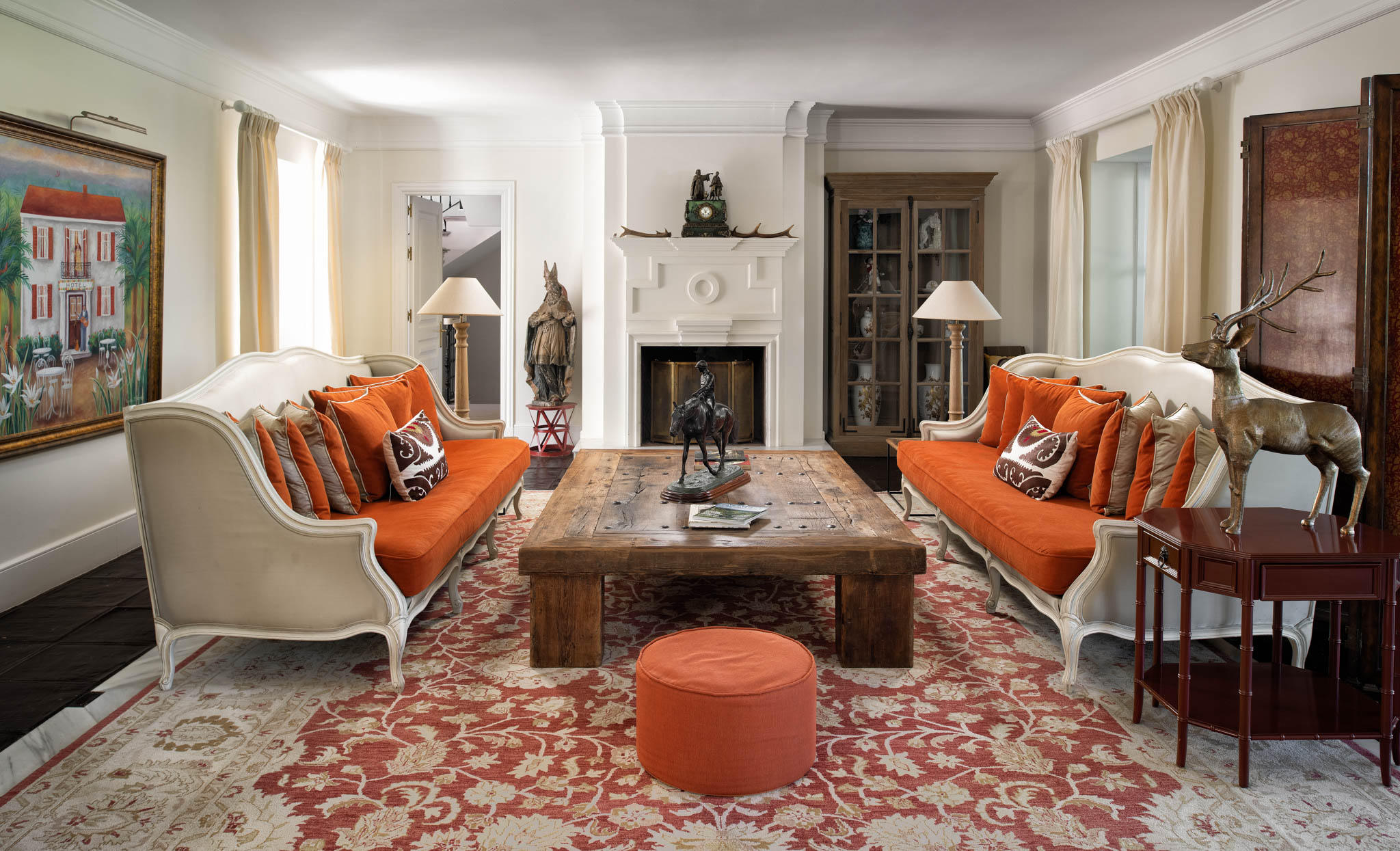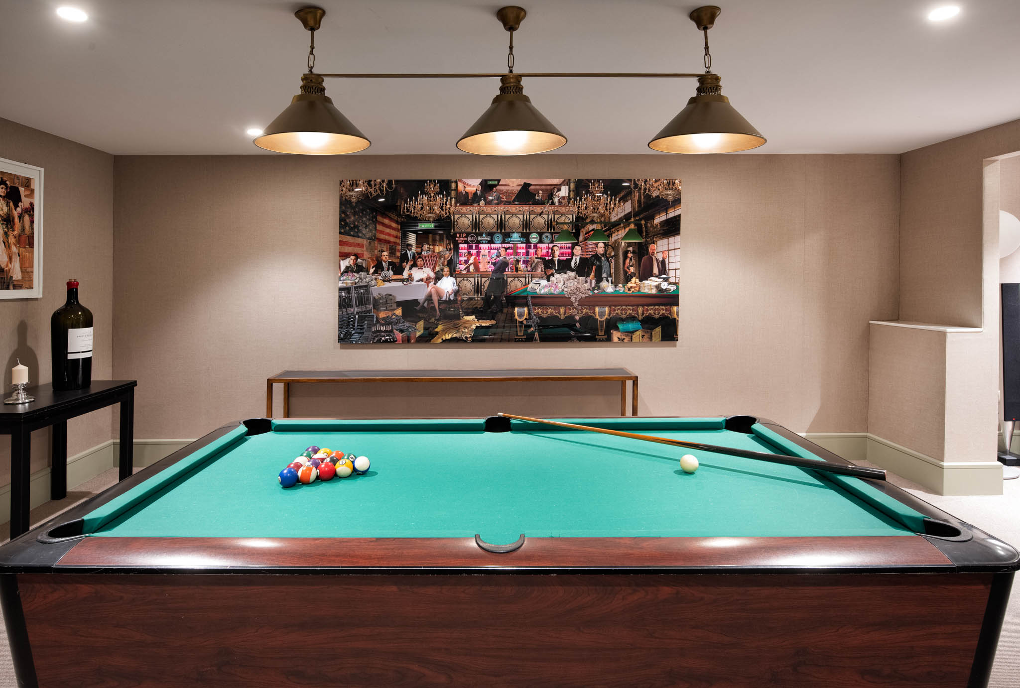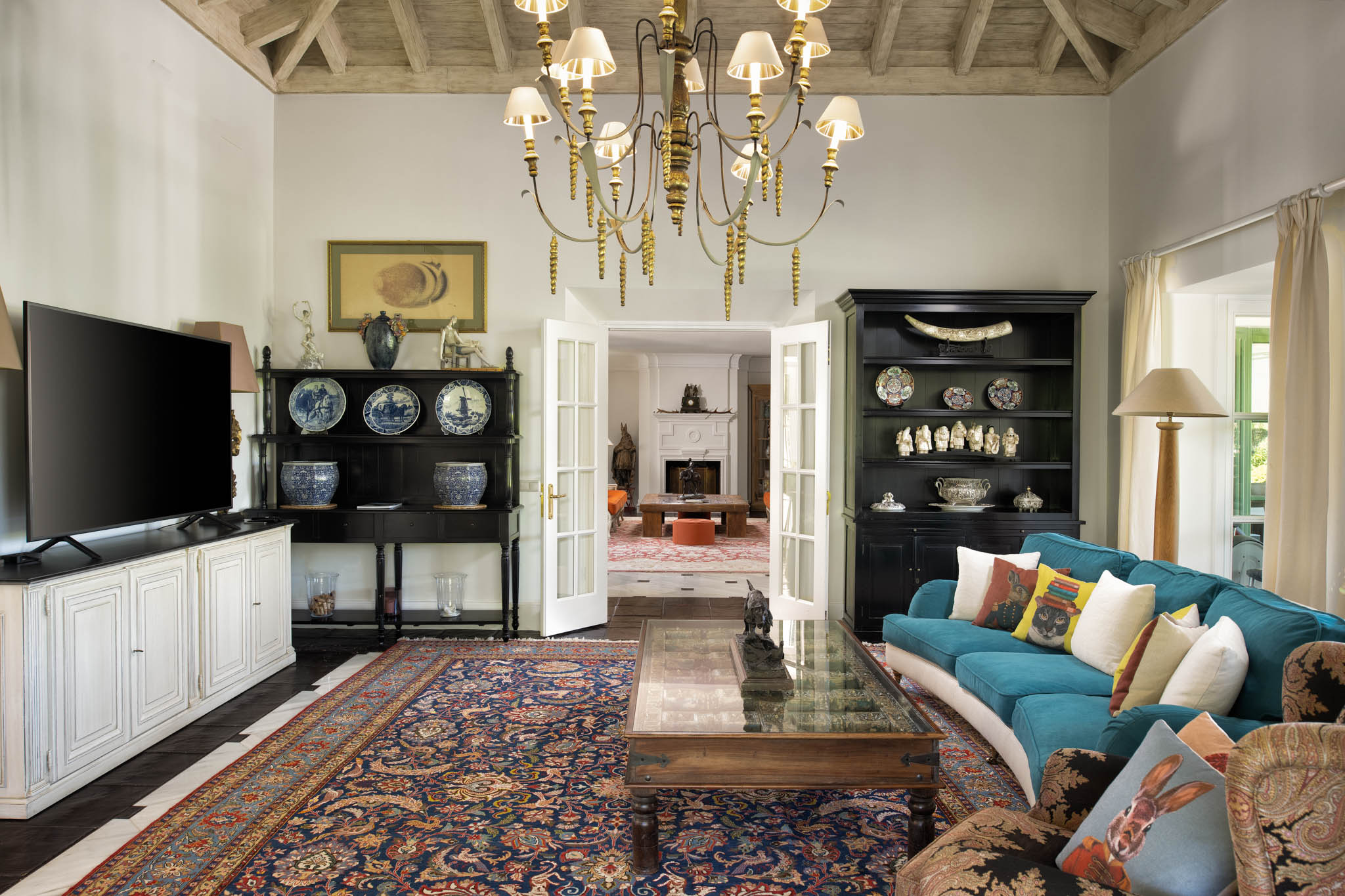 The ground floor comprises several spacious living and dining areas. There is a formal living room with an inviting open fireplace, Queen Anne high back sofas and antique wooden furniture which feeds into the first of two dining rooms. A second casual sitting room, a TV room and an office-cum-library provide more than enough space to relax or socialise.