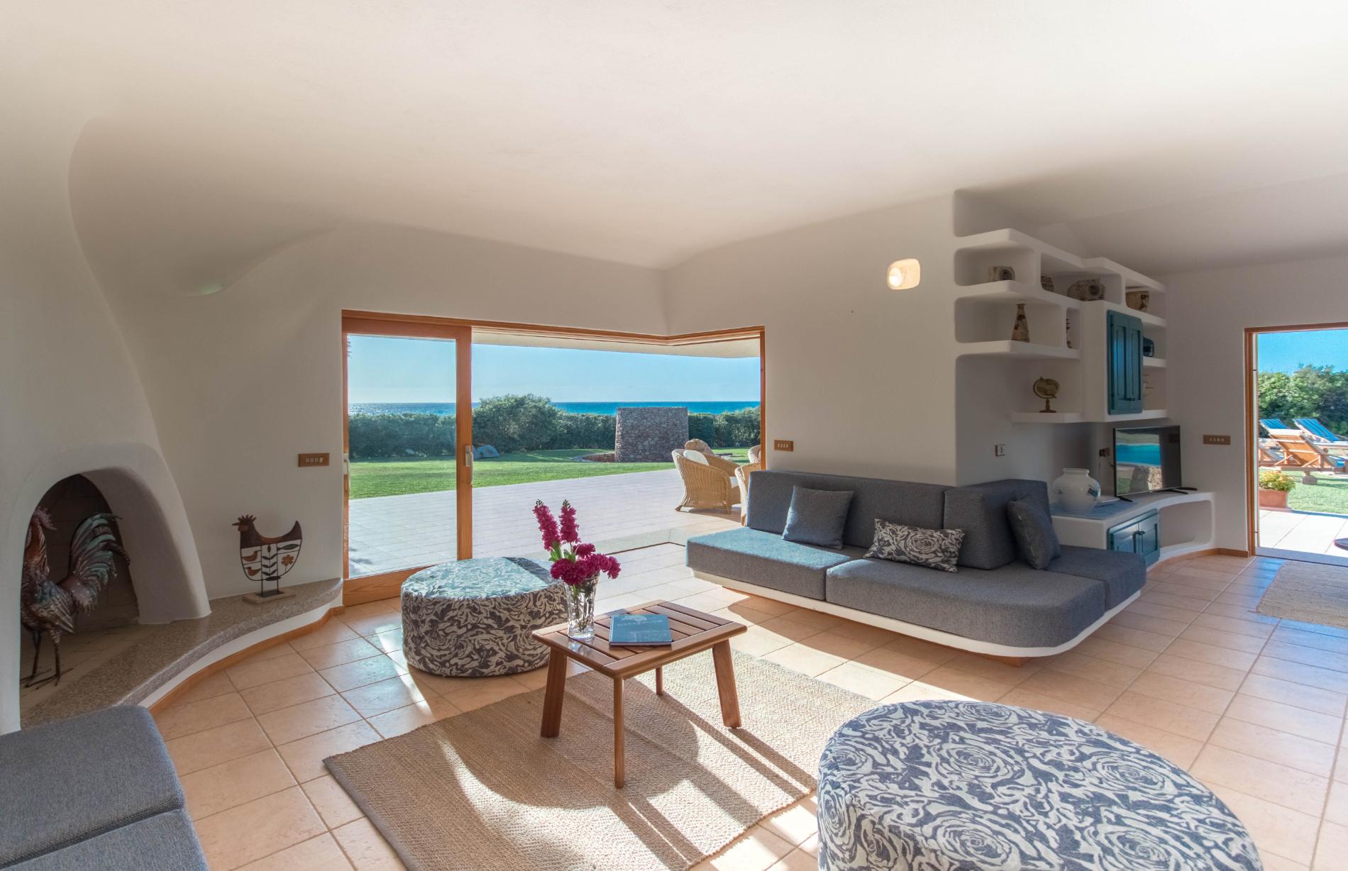 The villa extends over 1000 m2 of land and is only 30 meters from the white sandy beach. The eclectic, bulb shaped pool is filled with sea water and measures 100 m2. The garden is equipped with comfortable sun beds, wicker chairs and sofas on which to relax and enjoy the beautiful sunsets over the sea. Courtyard with dining area with barbecue and solarium with beautiful sea views.