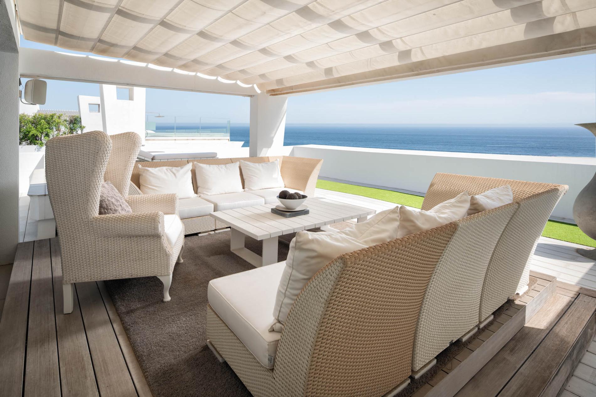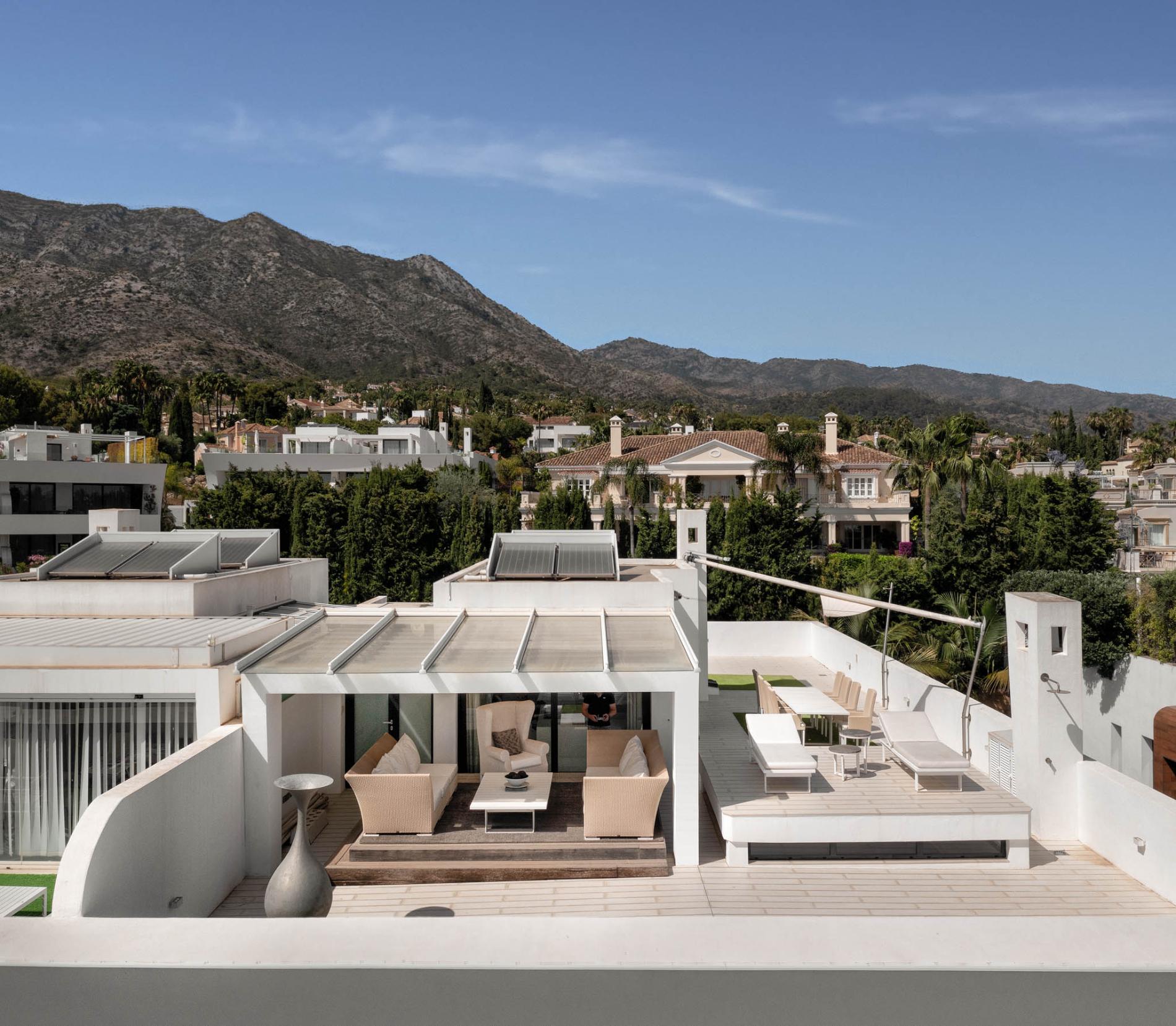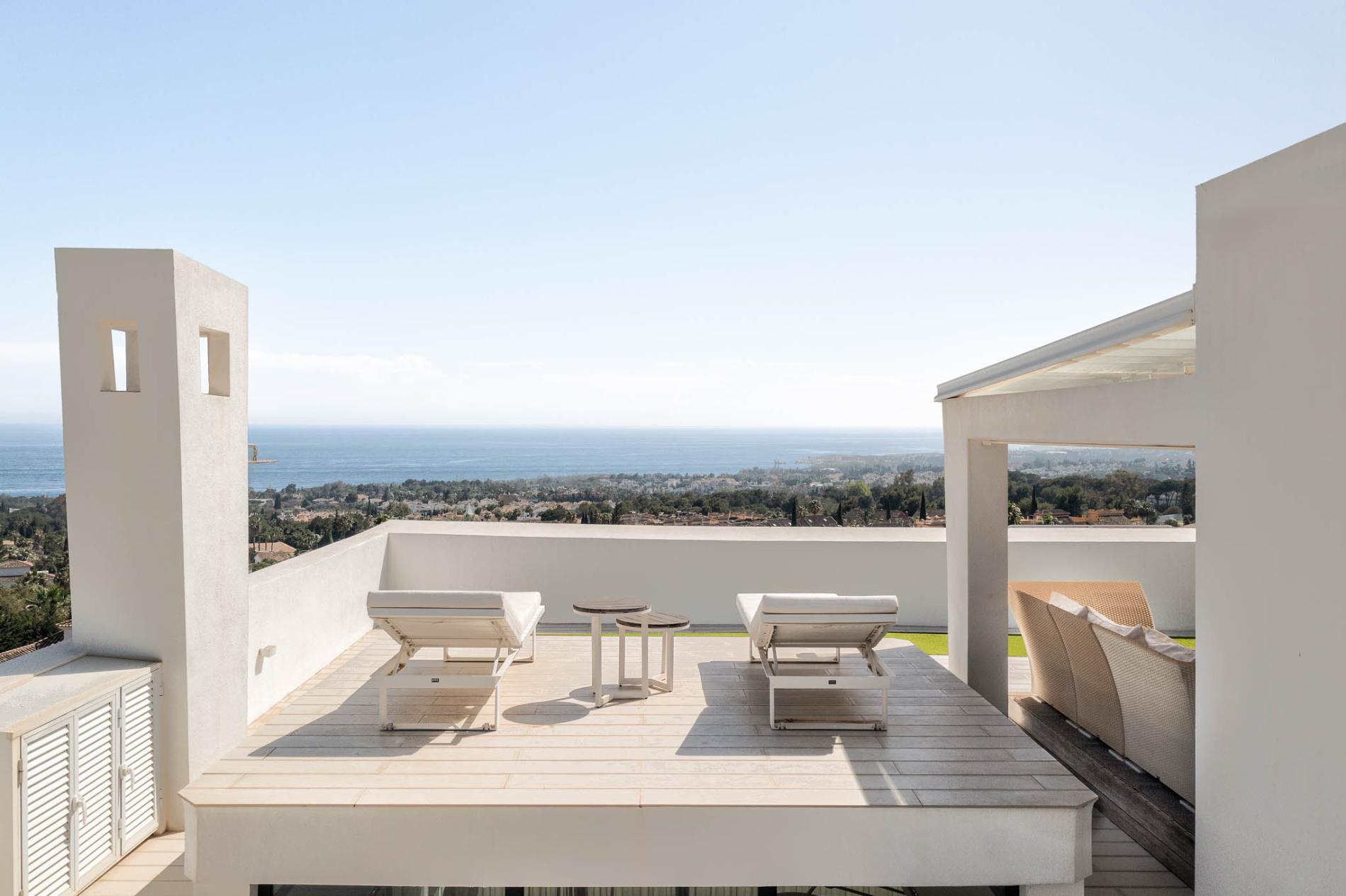 When you step out onto the terrace, you will immediately be surprised by one of the best sea views you can find in Marbella. Each corner offers a private seating area with its own privacy. The main terrace is connected to the living room where there is a staircase leading to the roof terrace.