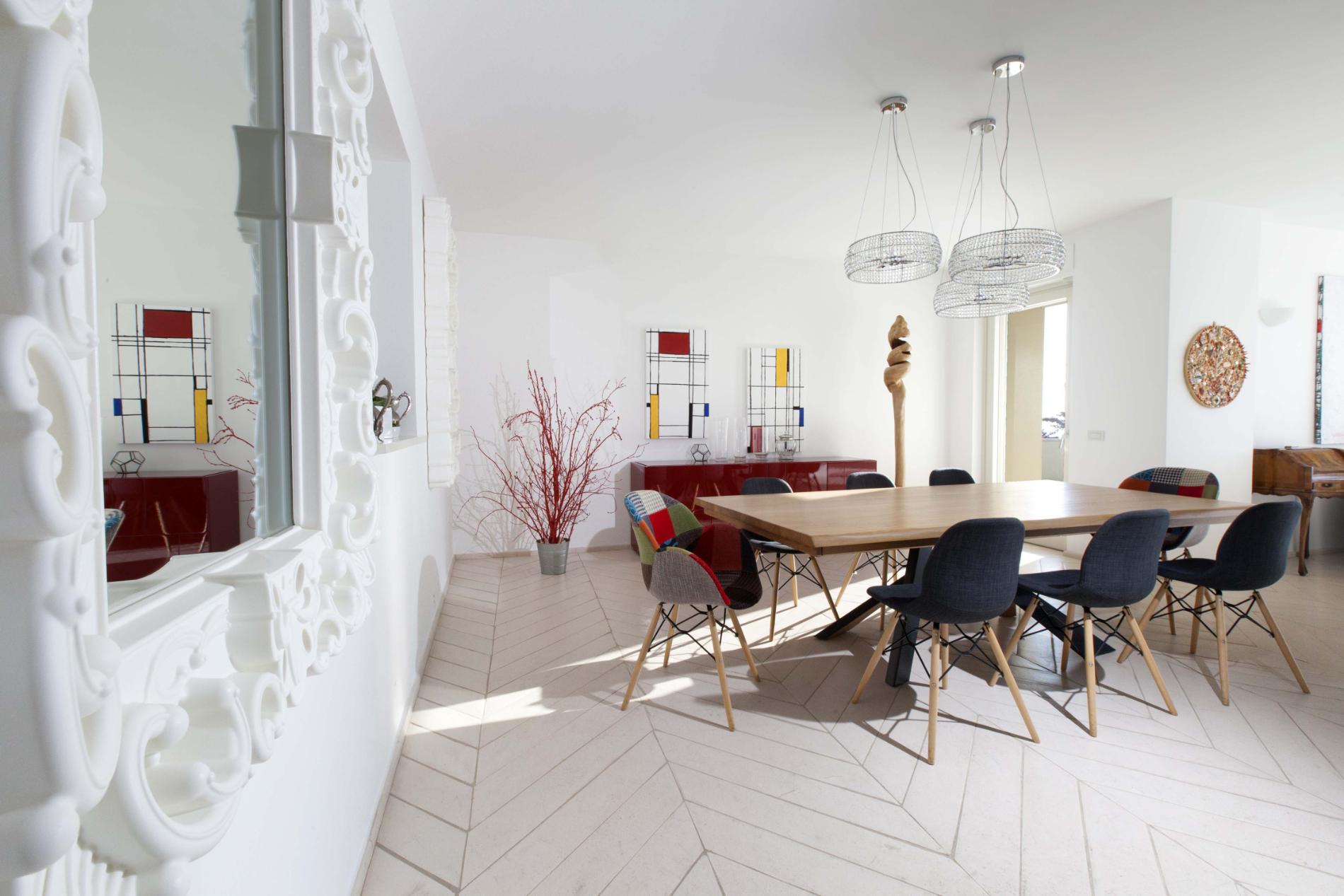 On the second floor, the second open plan living area comprises a professional style kitchen which is ideal for catering for large groups, with a double American style fridge. Beyond the kitchen, the huge room comprises two separate lounge seating spaces and a dining area, all elegantly furnished and filled with contemporary art works. The living room has double doors out to the terrace.
