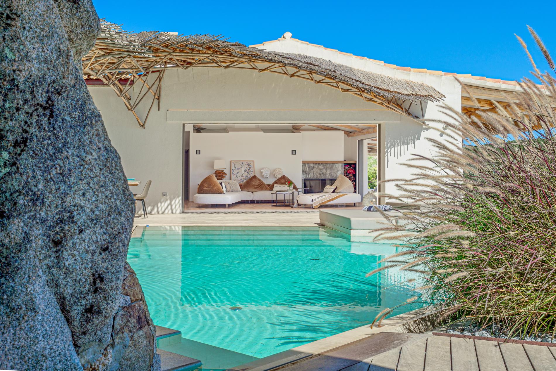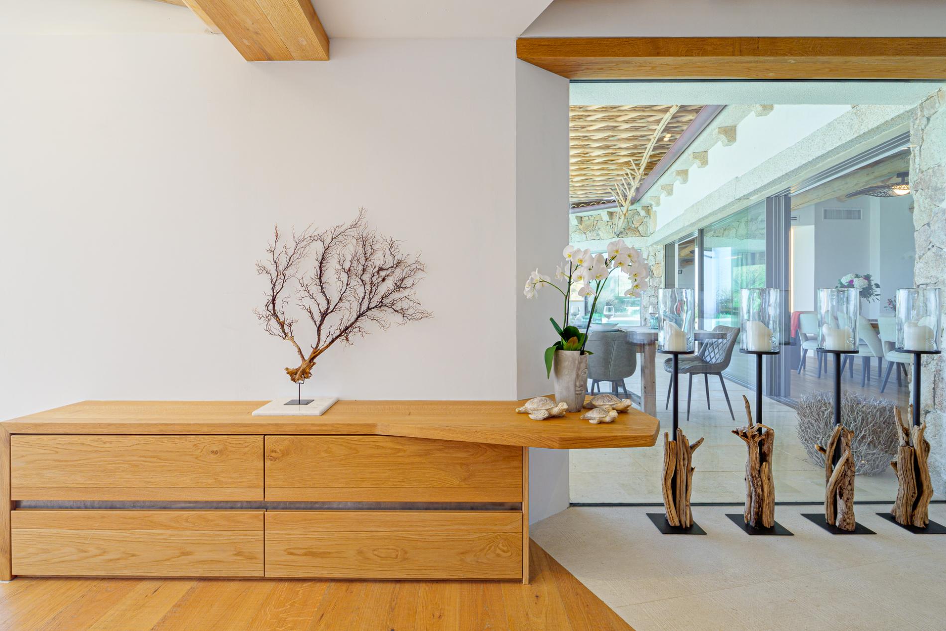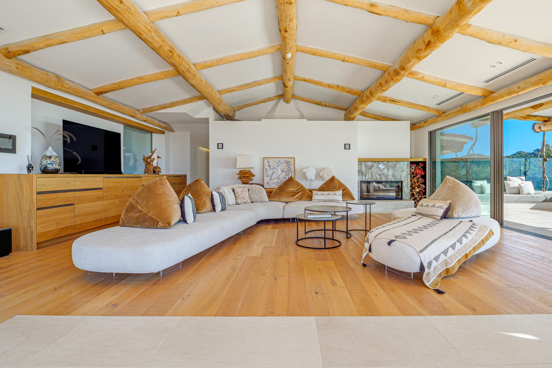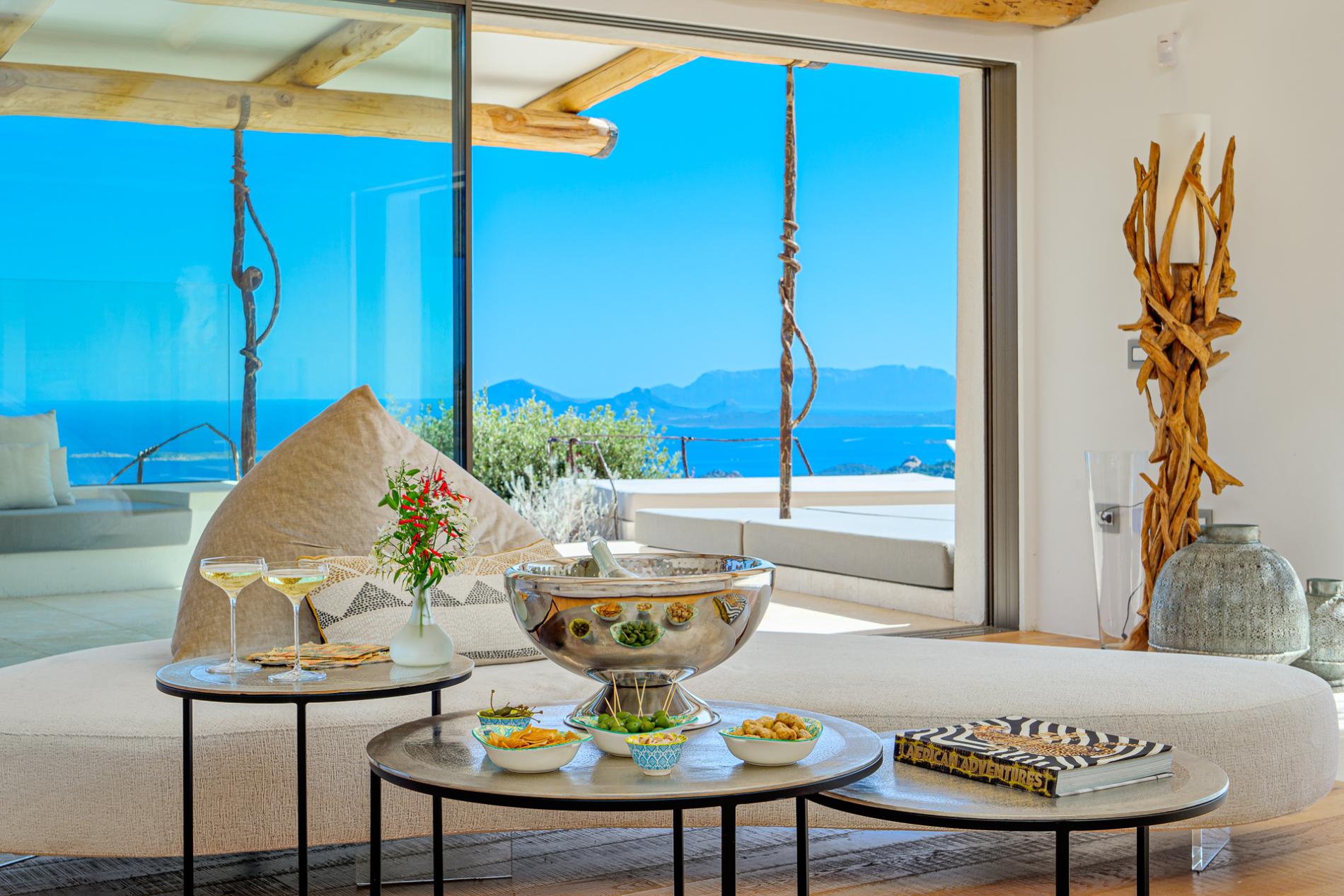 The villa is thoughtfully designed to highlight natural light and maximize seamless indoor-outdoor living. Four spacious, sunlit bedrooms, each with an ensuite bathroom, accommodate up to 8 guests, along with an additional guest bathroom. The panoramic living area, framed by floor-to-ceiling sliding glass doors that open entirely on two sides, connects effortlessly to the pool and covered terrace. This space, featuring a cozy fireplace and TV, offers stunning views extending to Tavolara Island and Cala di Volpe Bay.