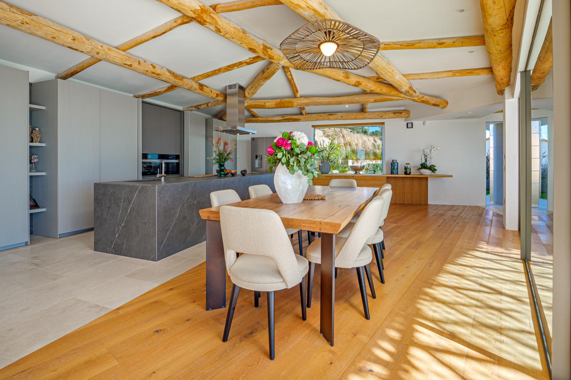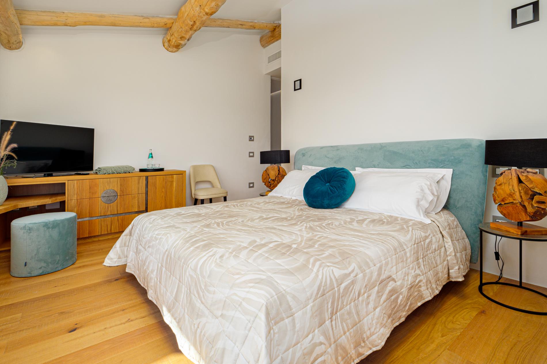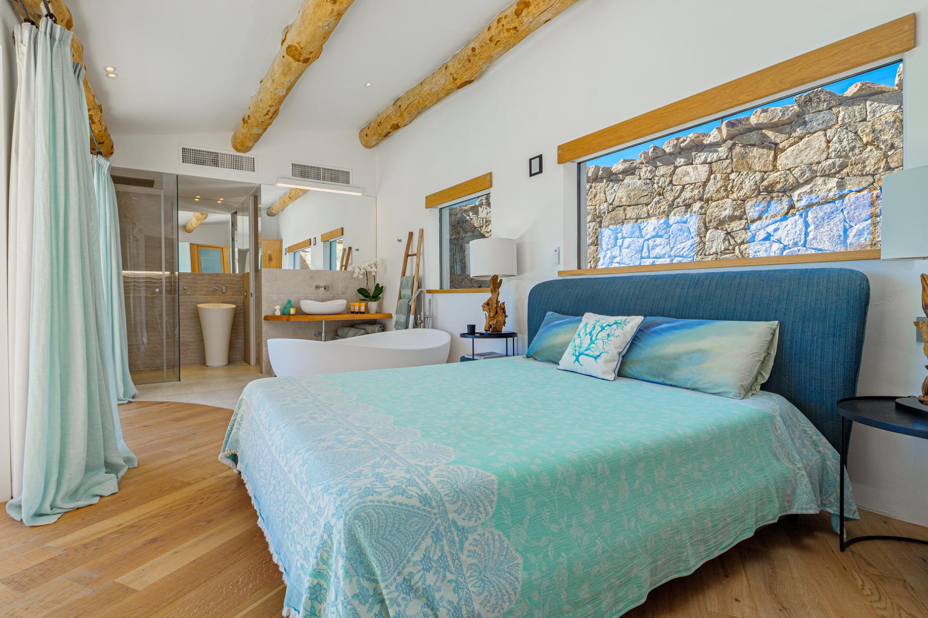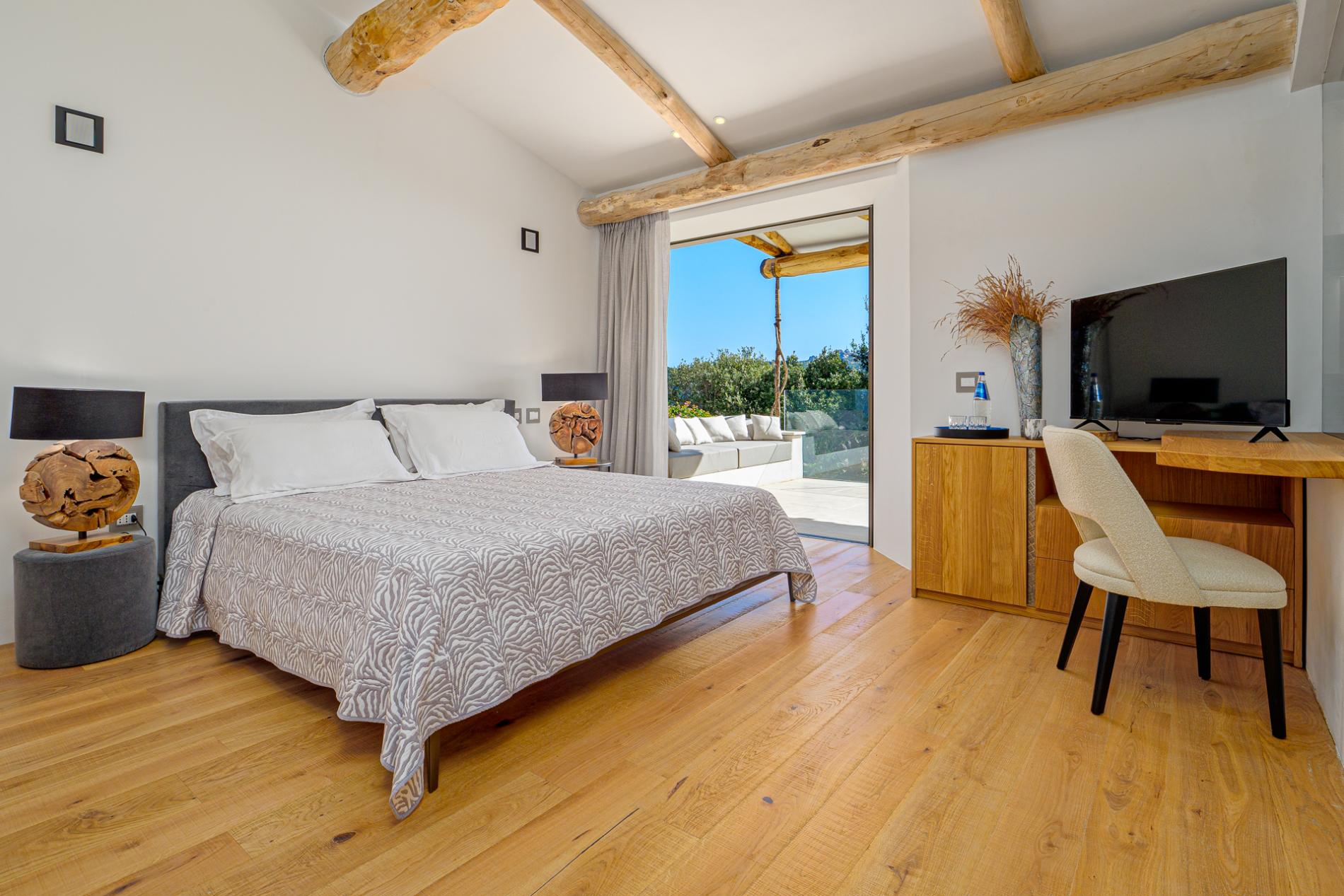At the heart of the villa is the ultra-modern island kitchen, fully equipped with high-end appliances and open to the dining area. From here, guests have easy access to the traditional covered terrace by the pool—ideal for alfresco dining and relaxing in the fresh sea breeze. Every interior element is custom-crafted with exquisite attention to detail, creating an atmosphere that merges luxury with a welcoming sense of home.