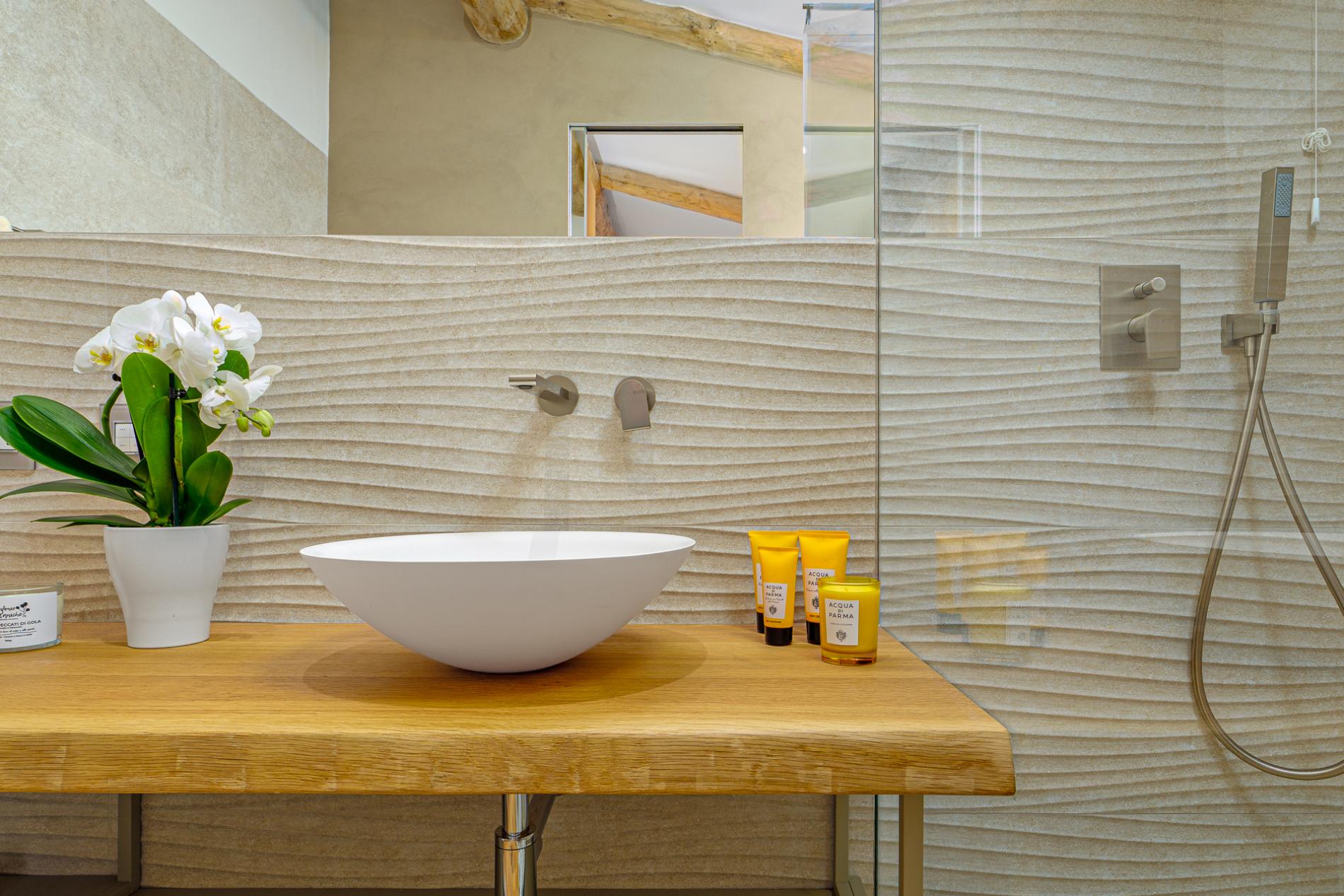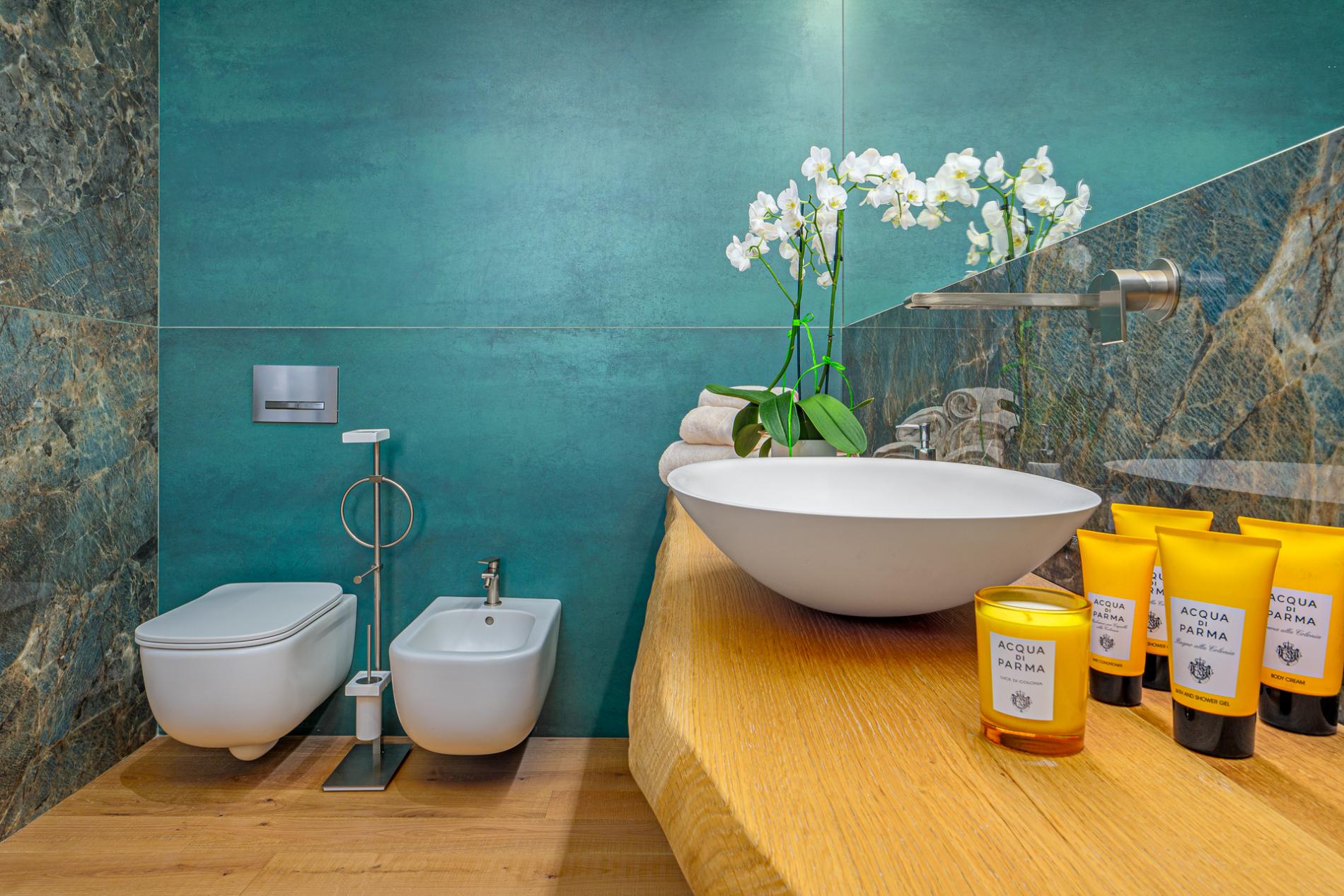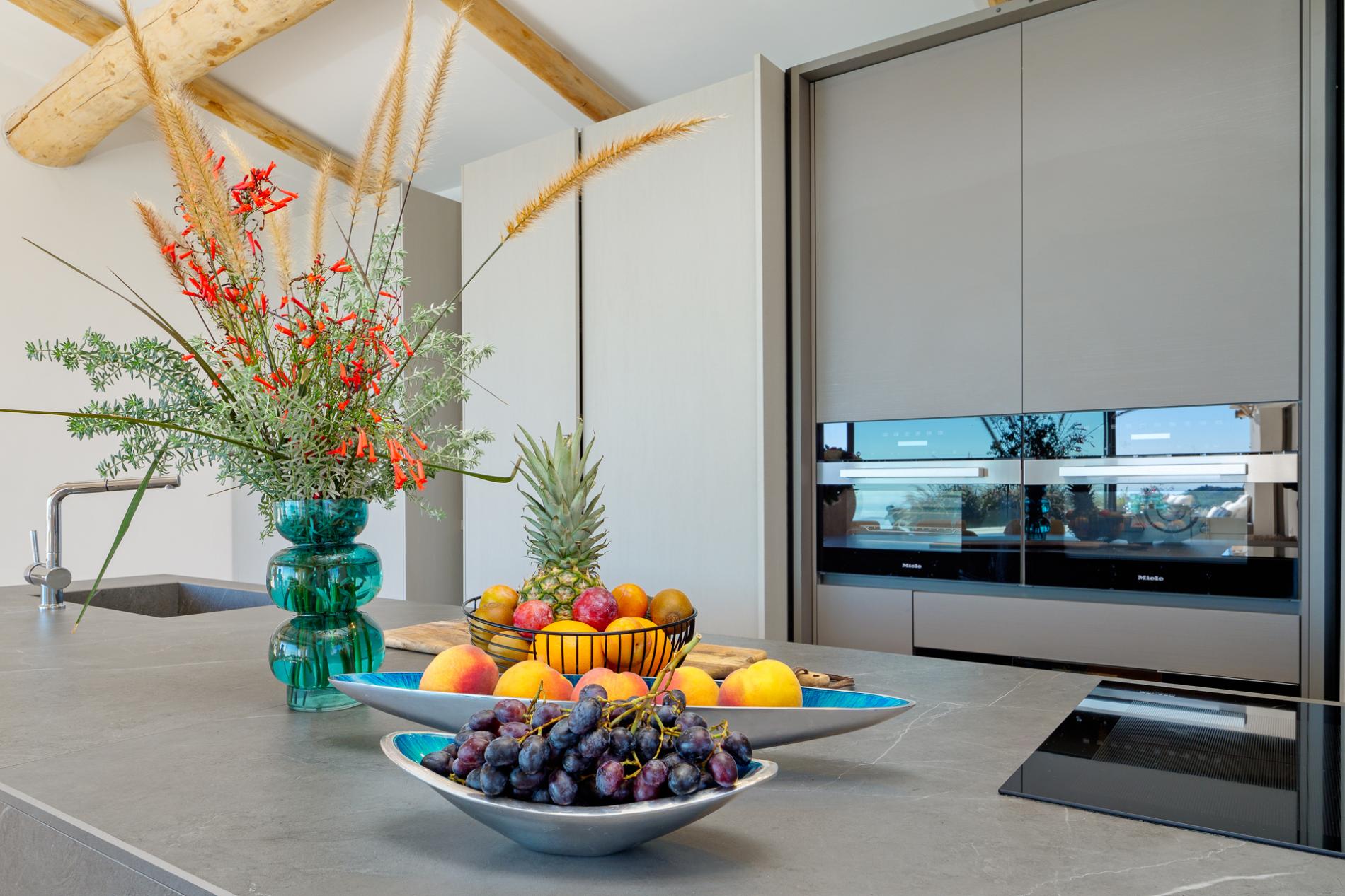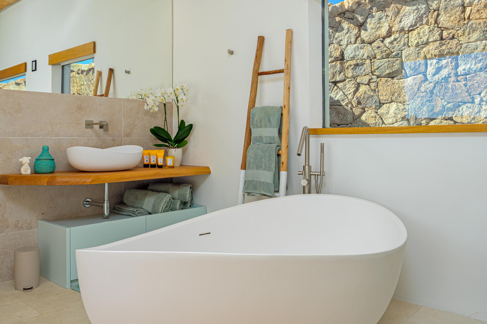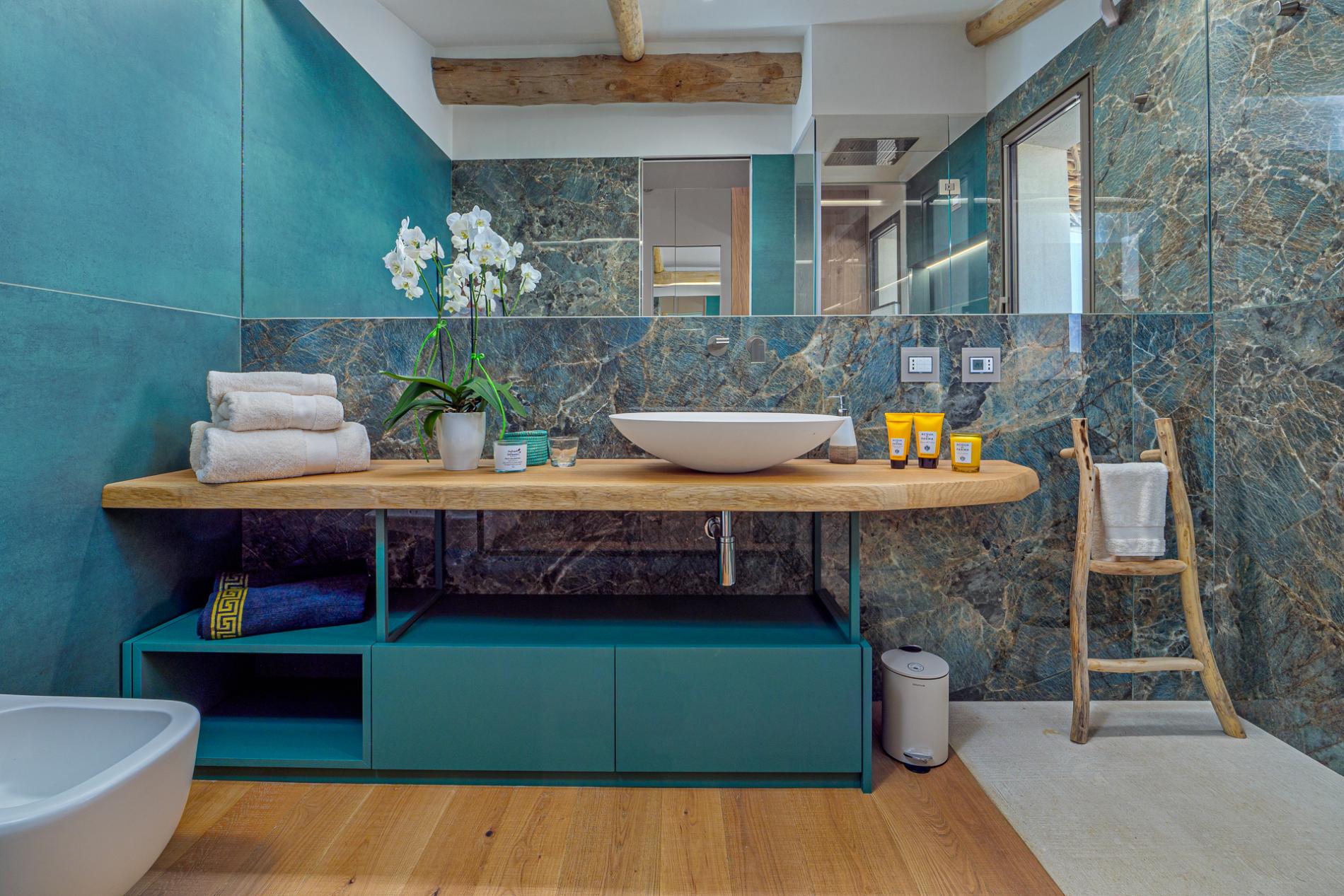 At the heart of the villa is the ultra-modern island kitchen, fully equipped with high-end appliances and open to the dining area. From here, guests have easy access to the traditional covered terrace by the pool—ideal for alfresco dining and relaxing in the fresh sea breeze. Every interior element is custom-crafted with exquisite attention to detail, creating an atmosphere that merges luxury with a welcoming sense of home.