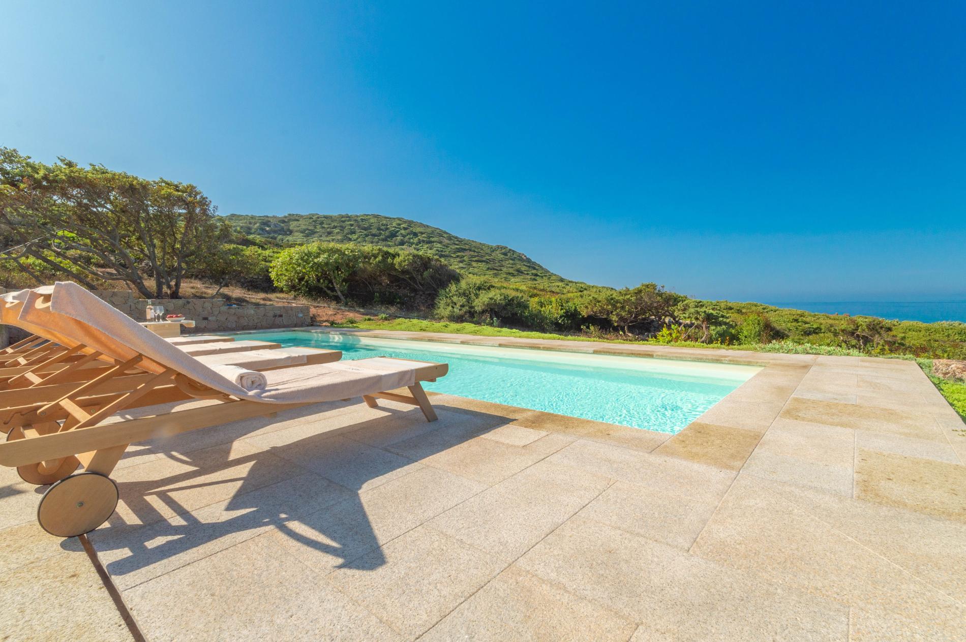 The eclectic, bulb shaped pool is filled with sea water and it measures 100 m2. The garden is equipped with comfortable sun beds, wicker chairs and sofas, on which itis possible to relax and to enjoy the beautiful sunsets over the sea.