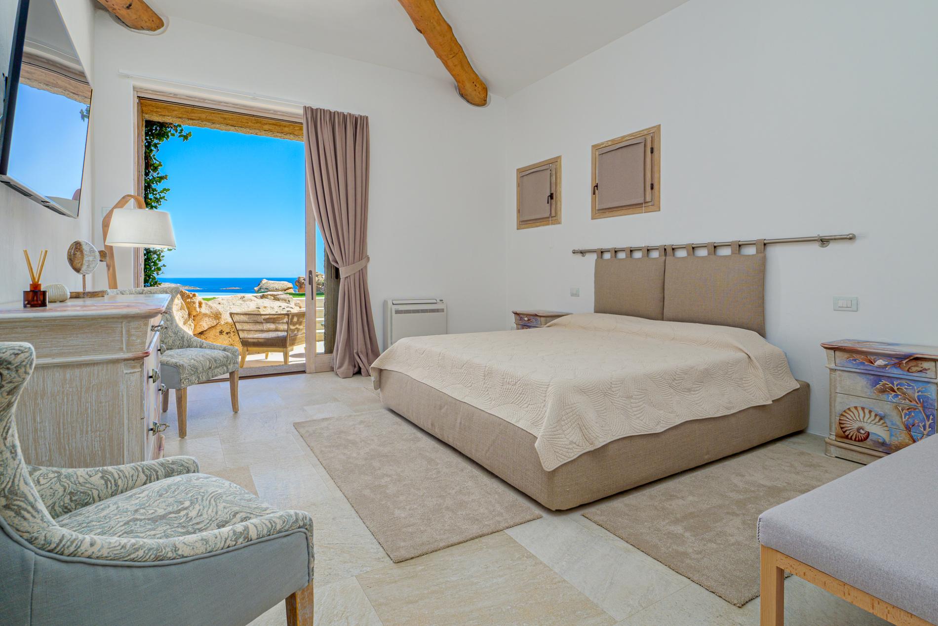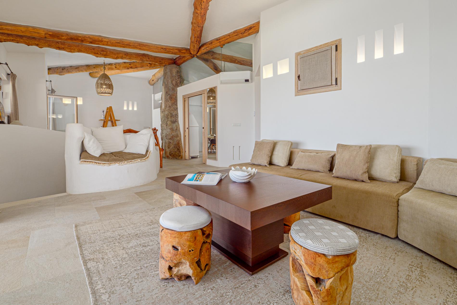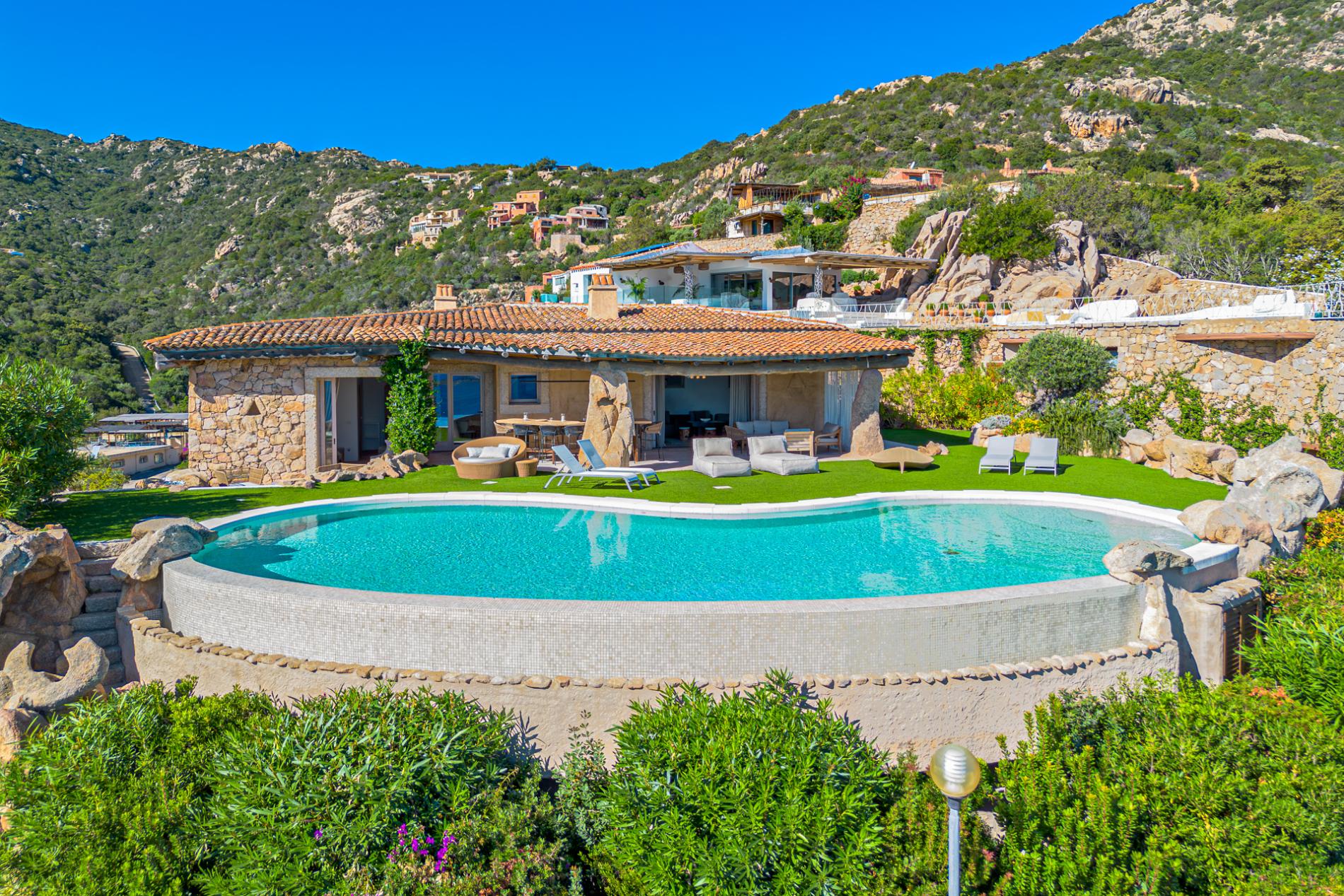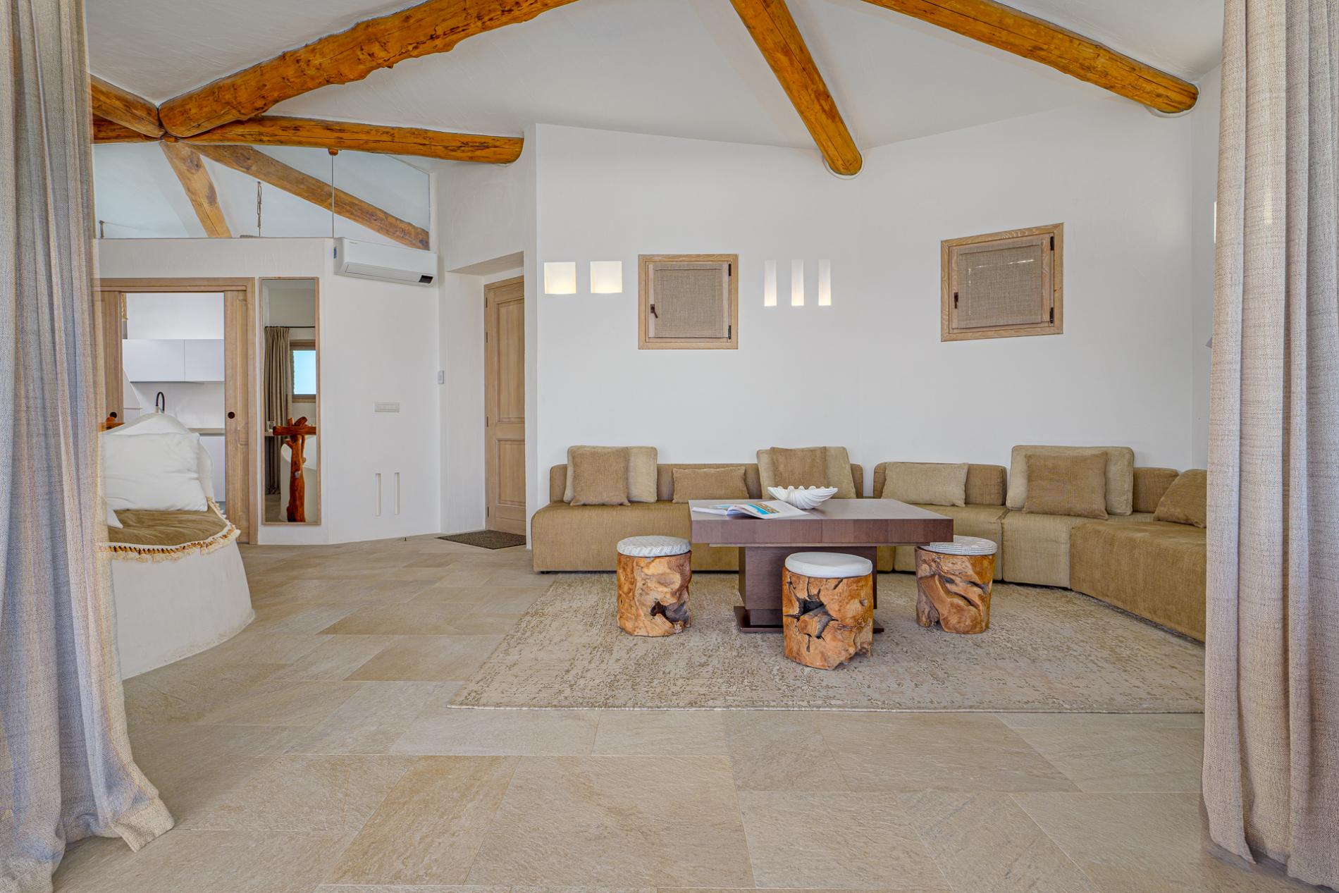 Villa Mabelle has precious character and furnishings and develops over two floors. 5 bedrooms, 7 toilets. Including 1 private apartment with a live-in maid. This Villa is a fabulous example of how great Sardinian design is, the brightness of the white walls, the chestnut roofs supported by monoliths, rocks and juniper set in the wall create a unique and scenographic environment with natural light and harmonious shape.