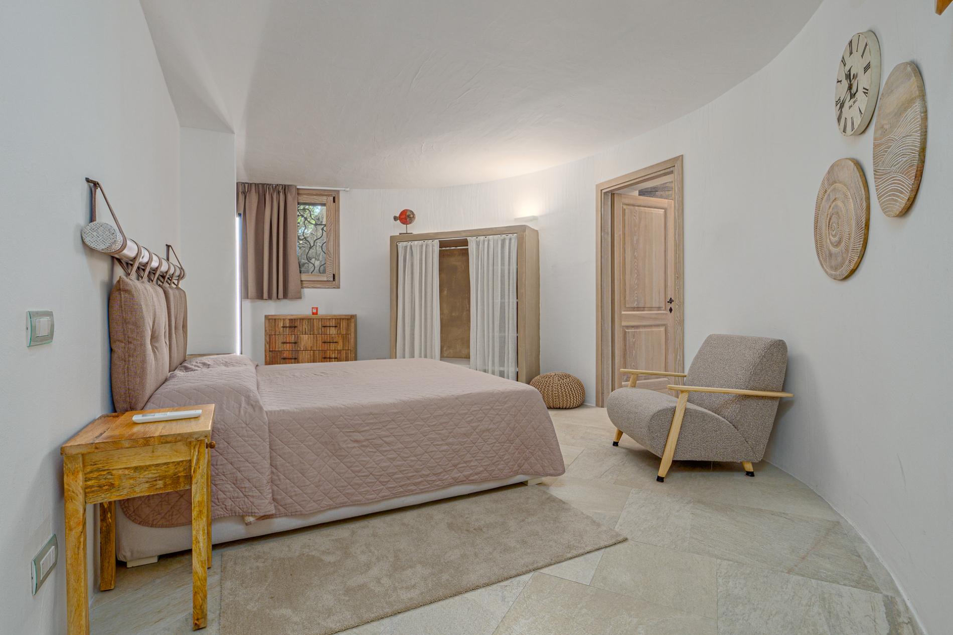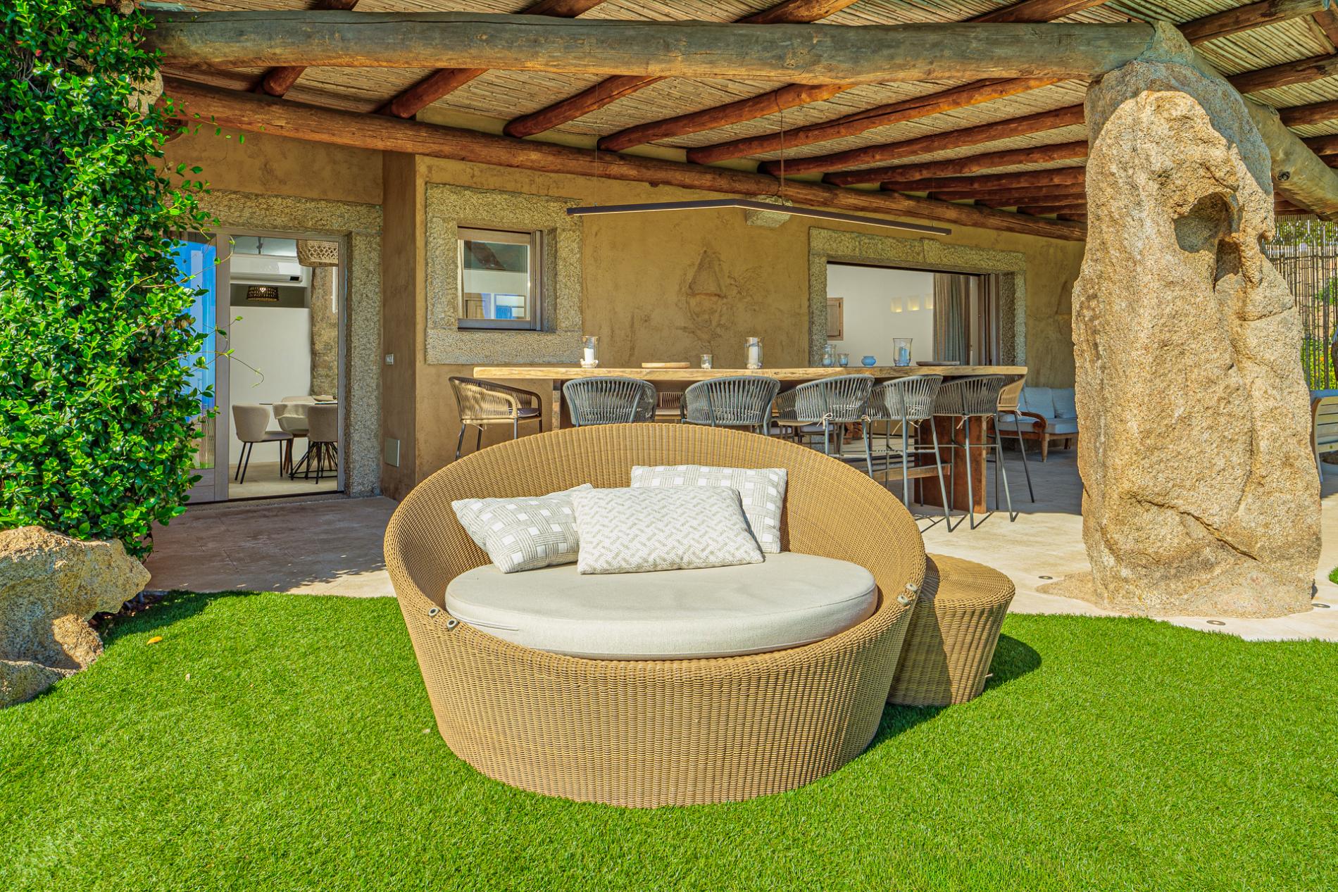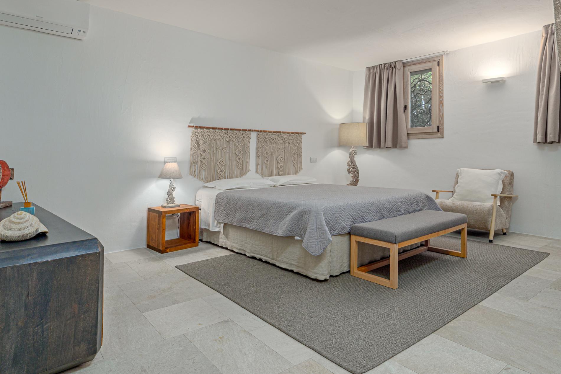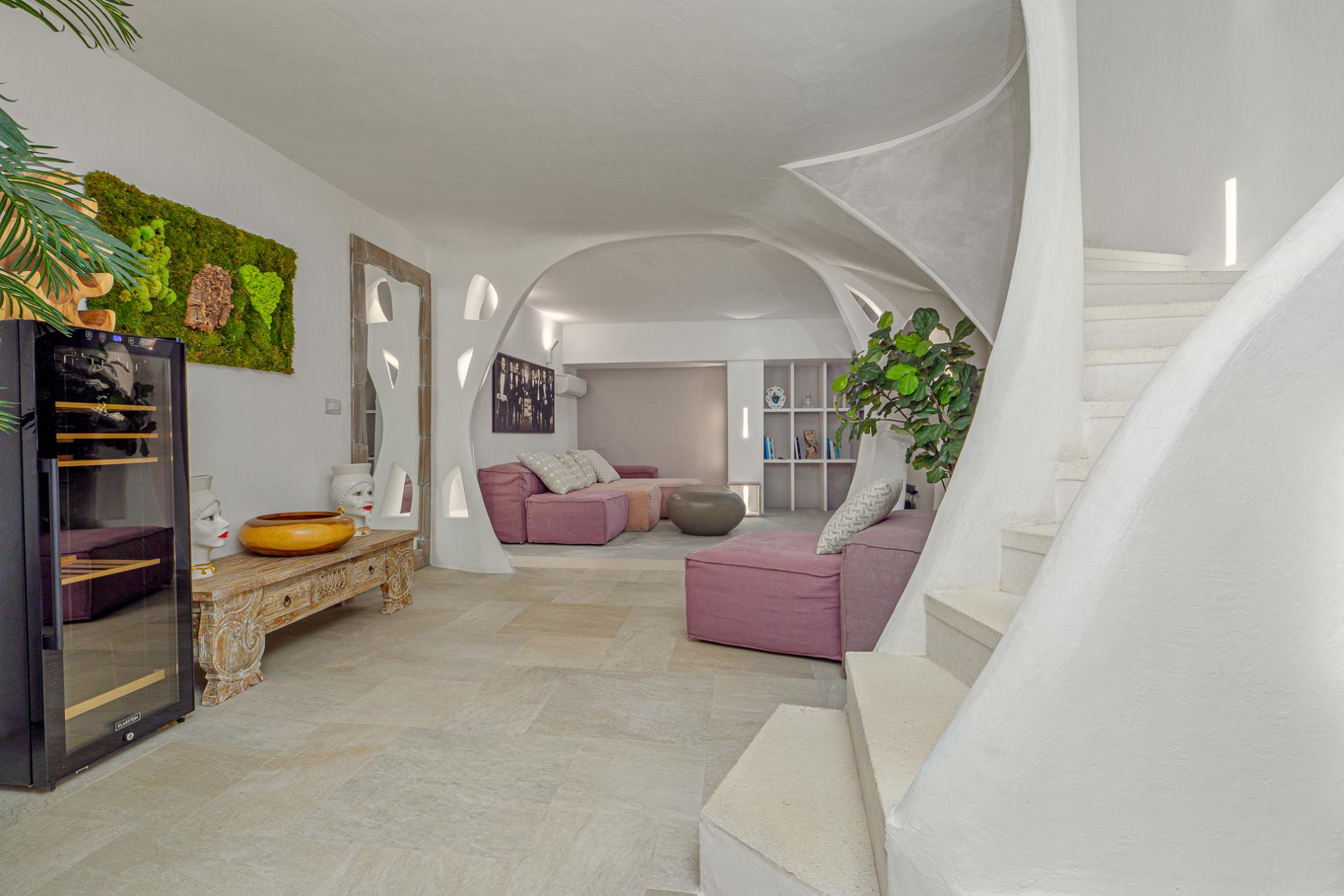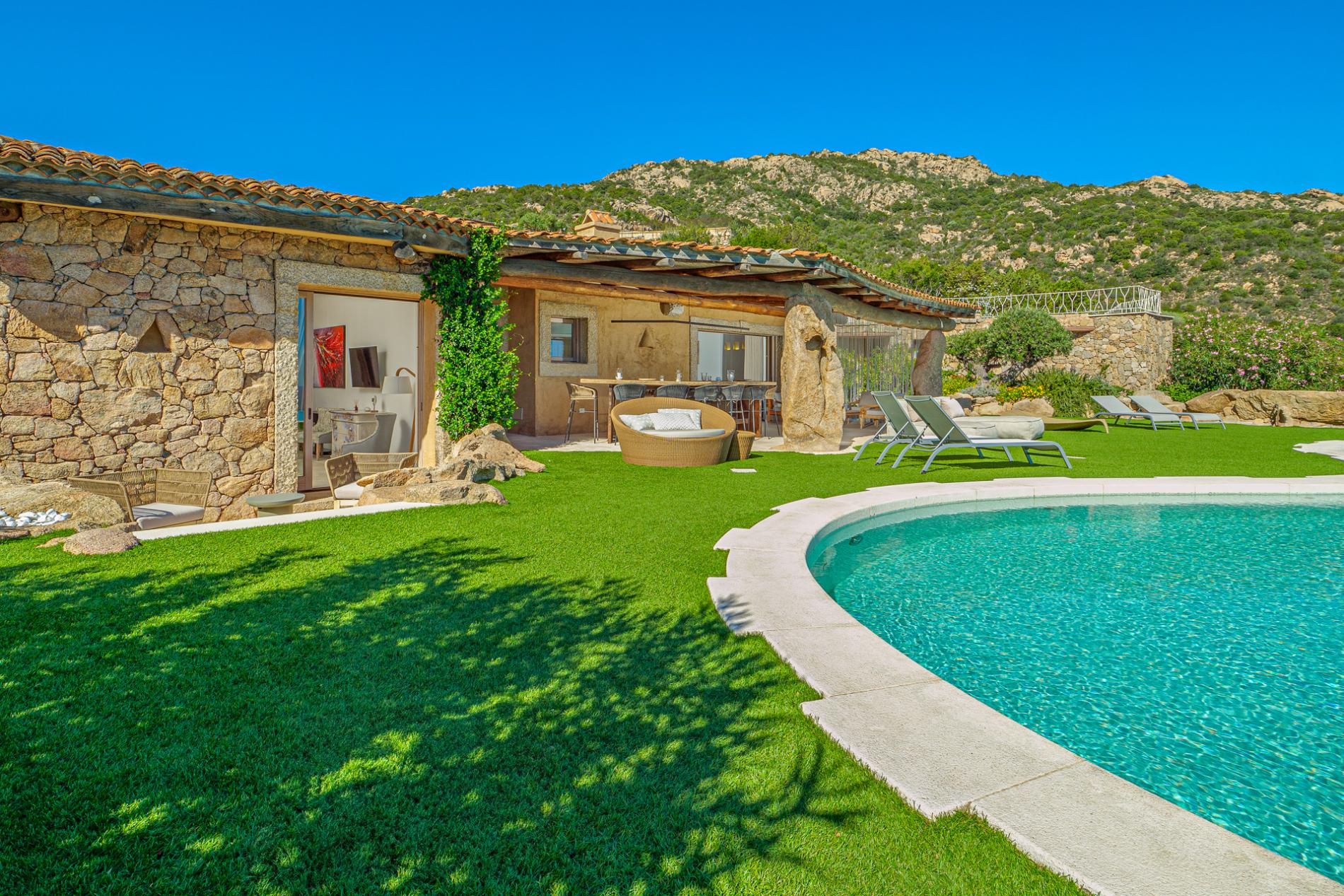 Villa Mabelle has precious character and furnishings and develops over two floors. 5 bedrooms, 7 toilets. Including 1 private apartment with a live-in maid. This Villa is a fabulous example of how great Sardinian design is, the brightness of the white walls, the chestnut roofs supported by monoliths, rocks and juniper set in the wall create a unique and scenographic environment with natural light and harmonious shape.
