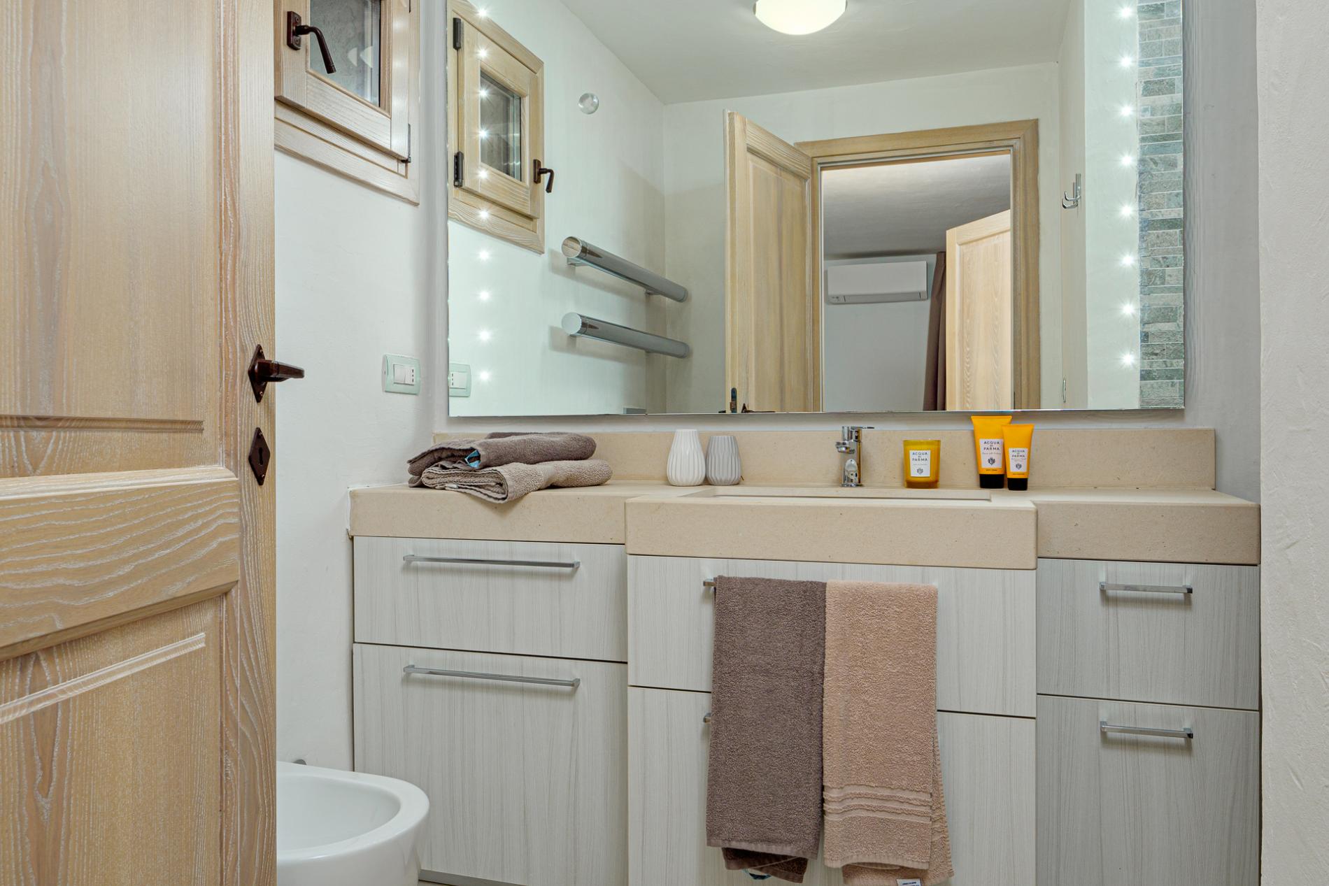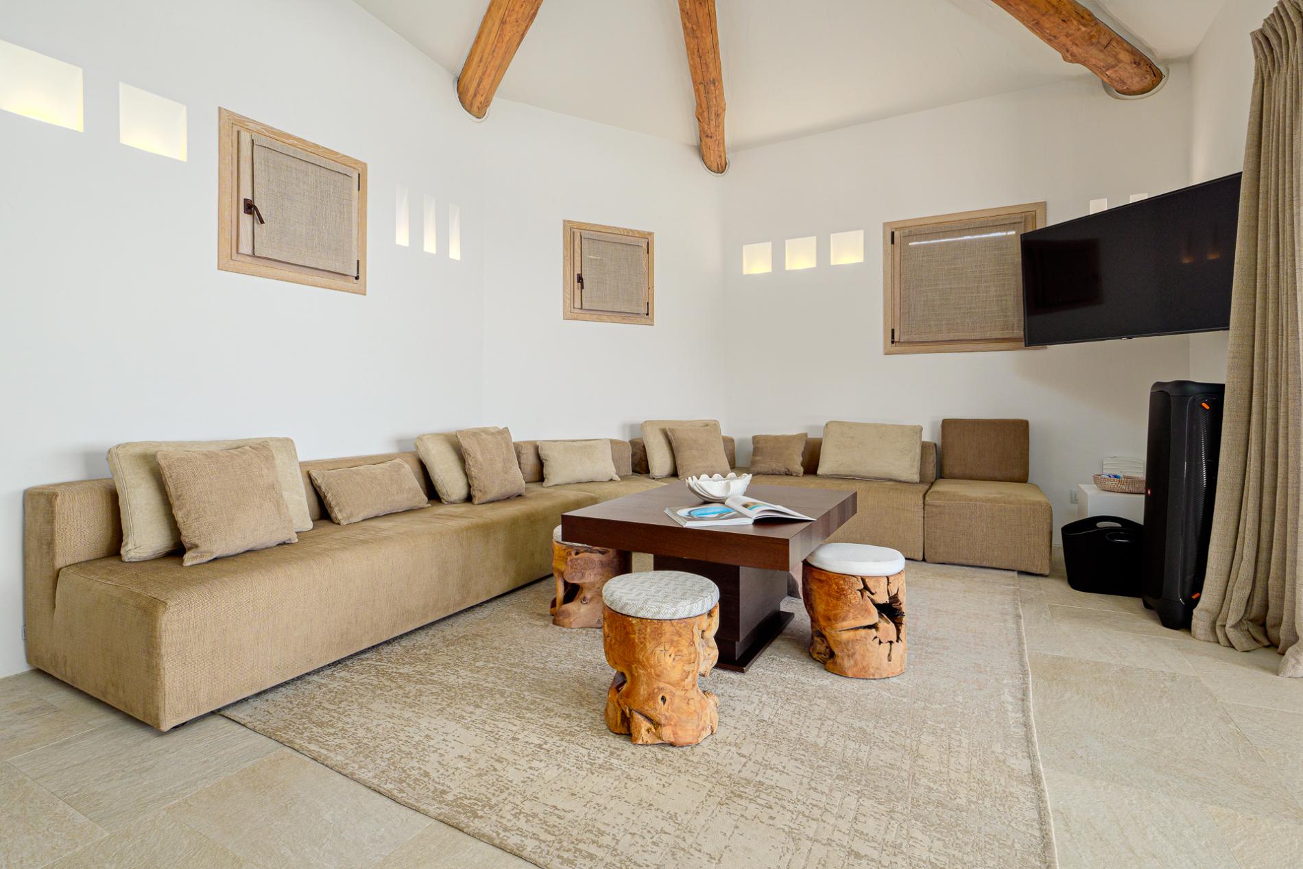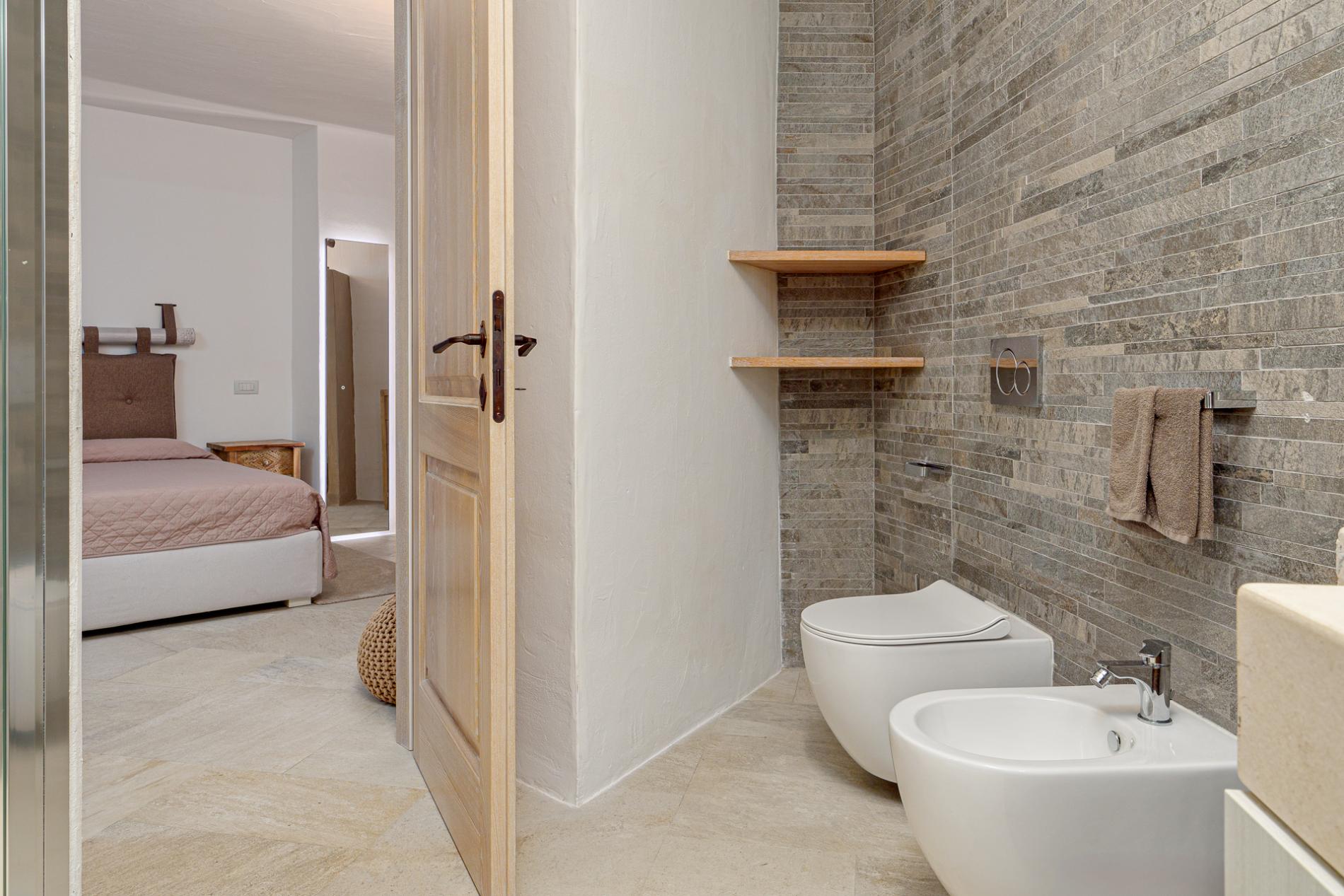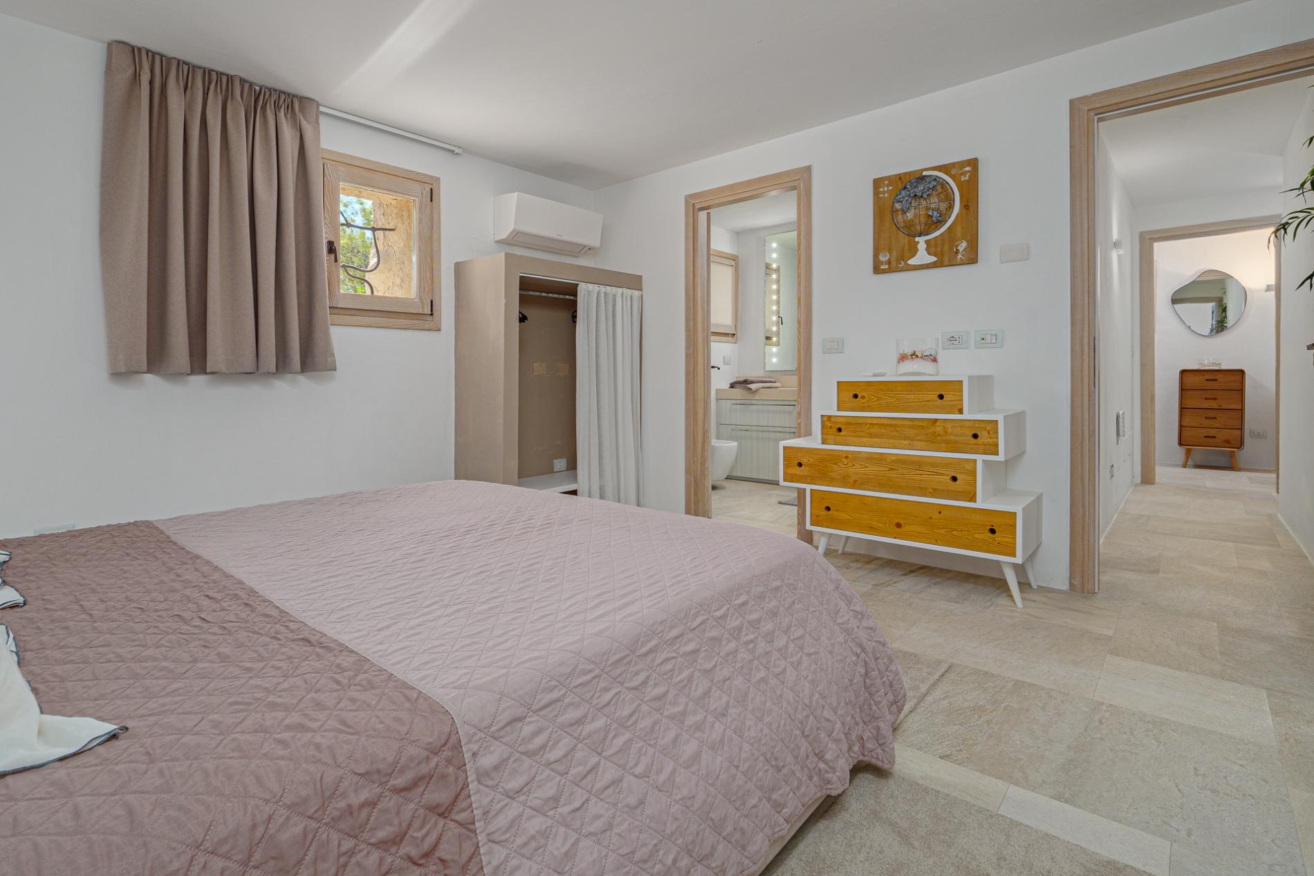 Villa Mabelle has precious character and furnishings and develops over two floors. 5 bedrooms, 7 toilets. Including 1 private apartment with a live-in maid. This Villa is a fabulous example of how great Sardinian design is, the brightness of the white walls, the chestnut roofs supported by monoliths, rocks and juniper set in the wall create a unique and scenographic environment with natural light and harmonious shape.