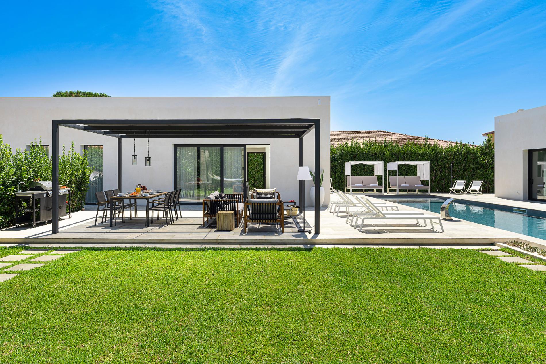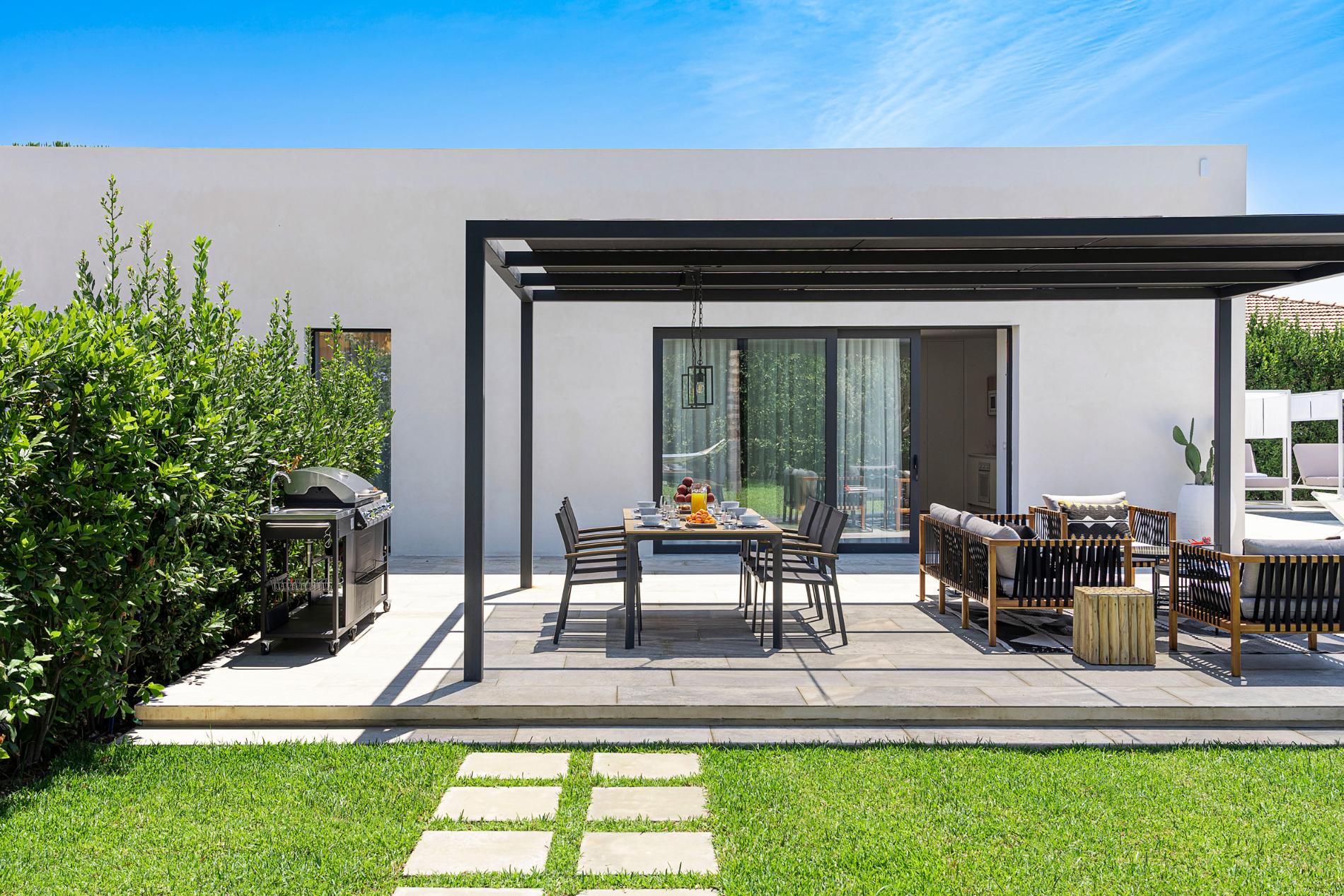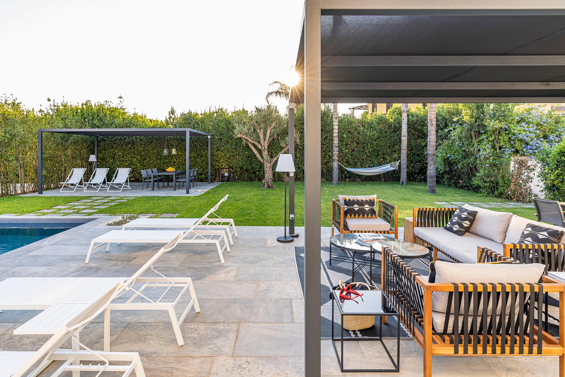 Patio with pergola, terrace, garden, swimming pool, sun terrace.