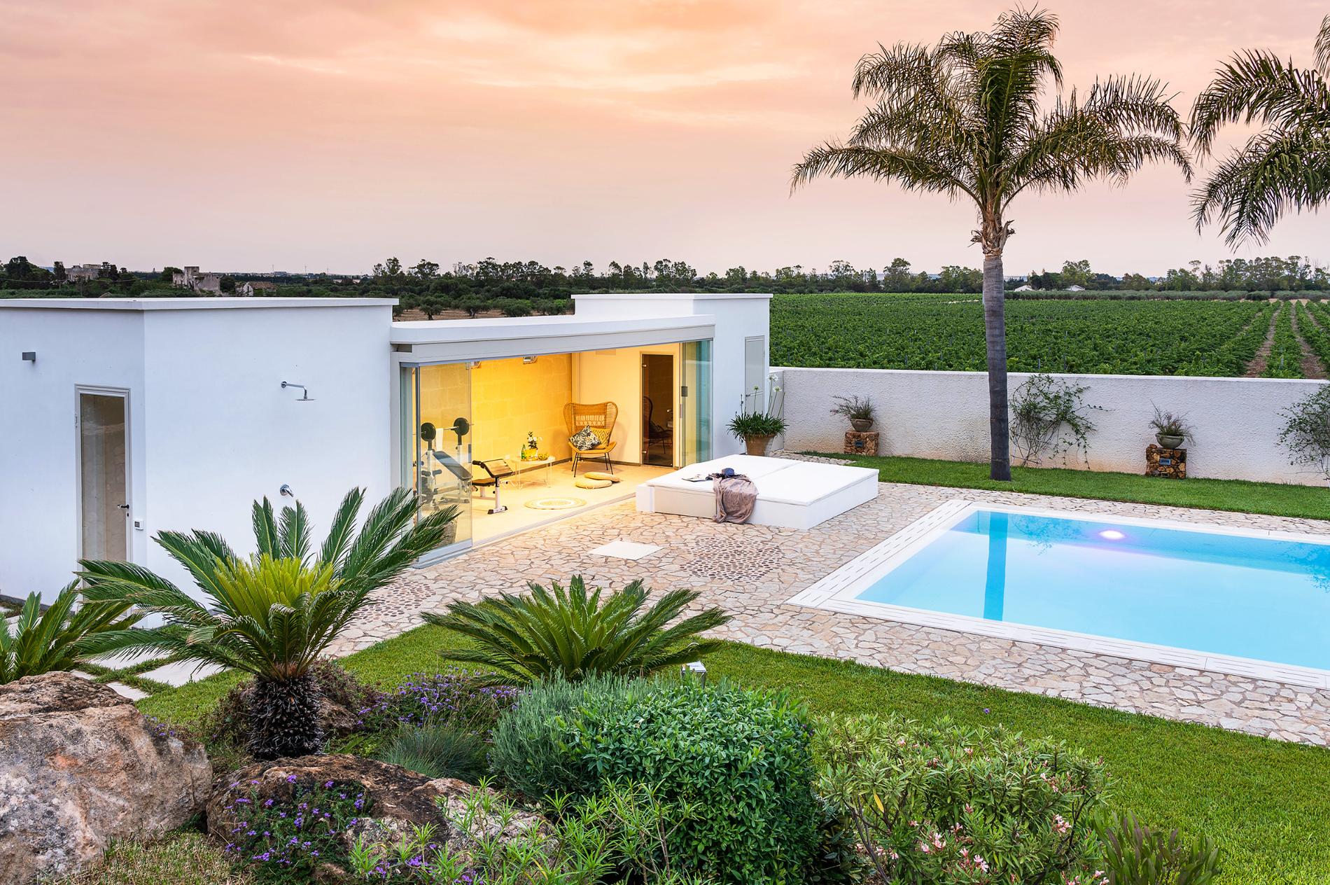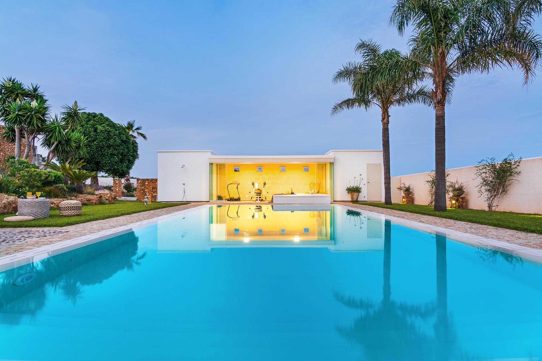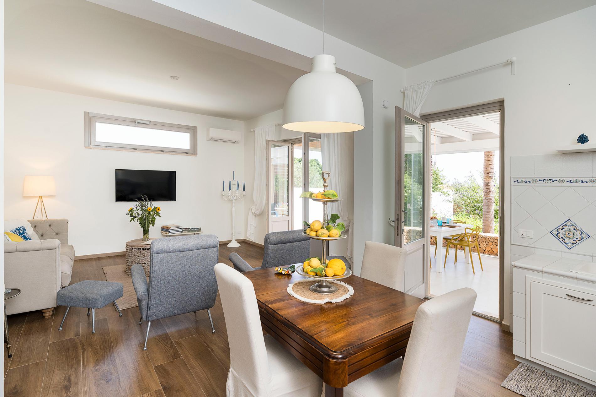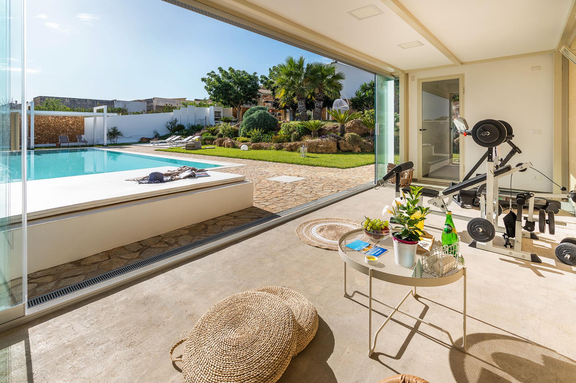 Surrounded by a lovely garden with lawn, ornamental and aromatic plants, Pietra del Sole offers a large saltwater infinity pool (chlorine-free) together with a Turkish bath, a fitness area and a bathroom with shower, a veranda equipped with a dining area and an external kitchen (cooking corner, oven, fridge, dishwasher and bbq).