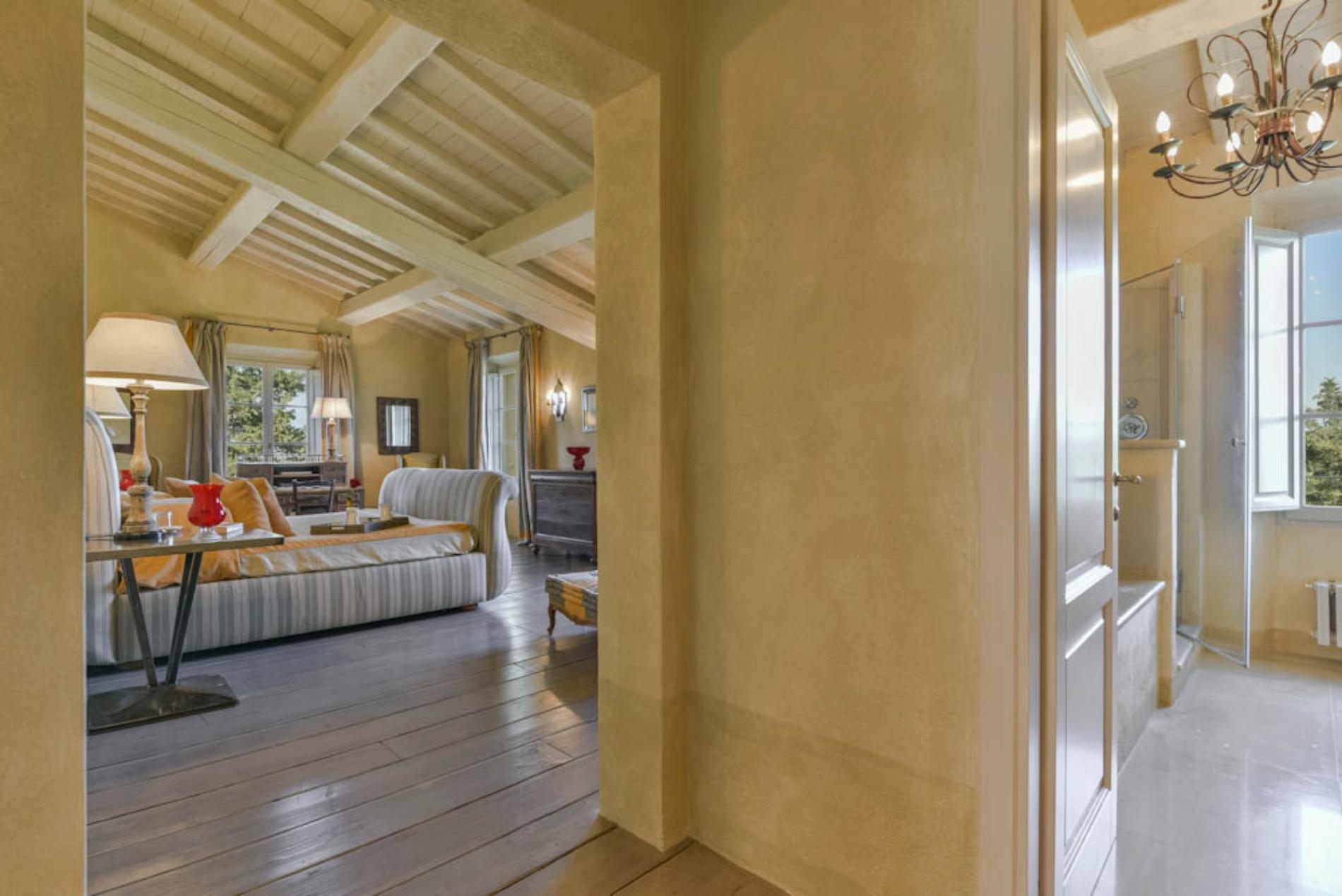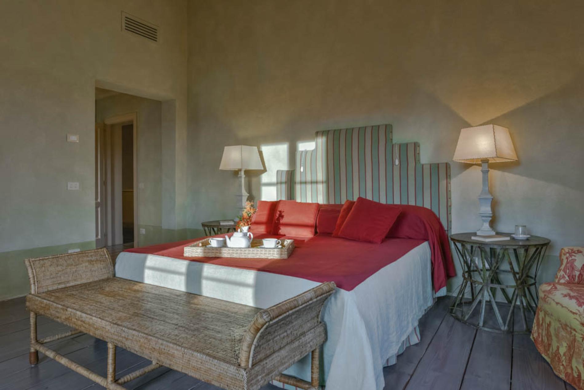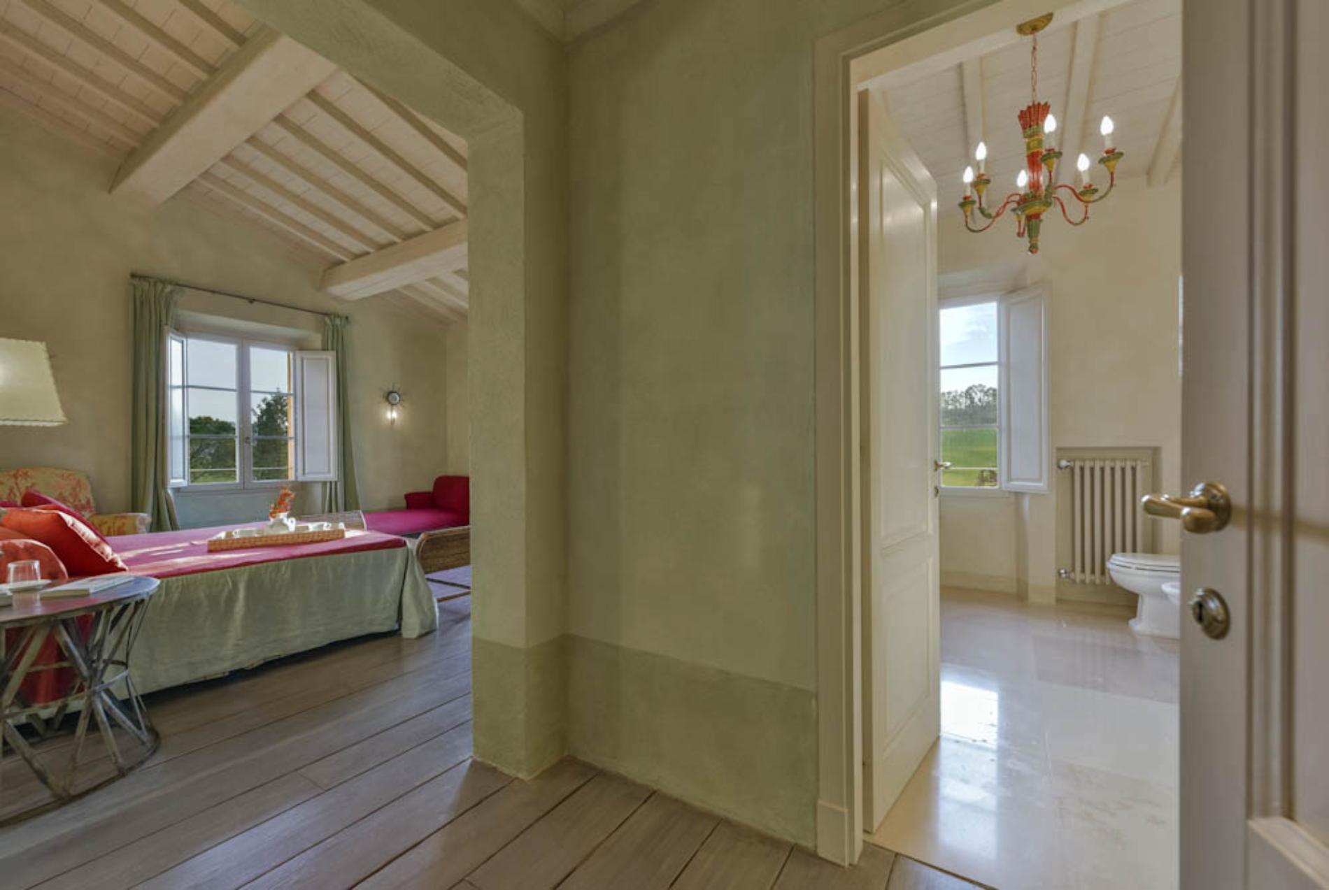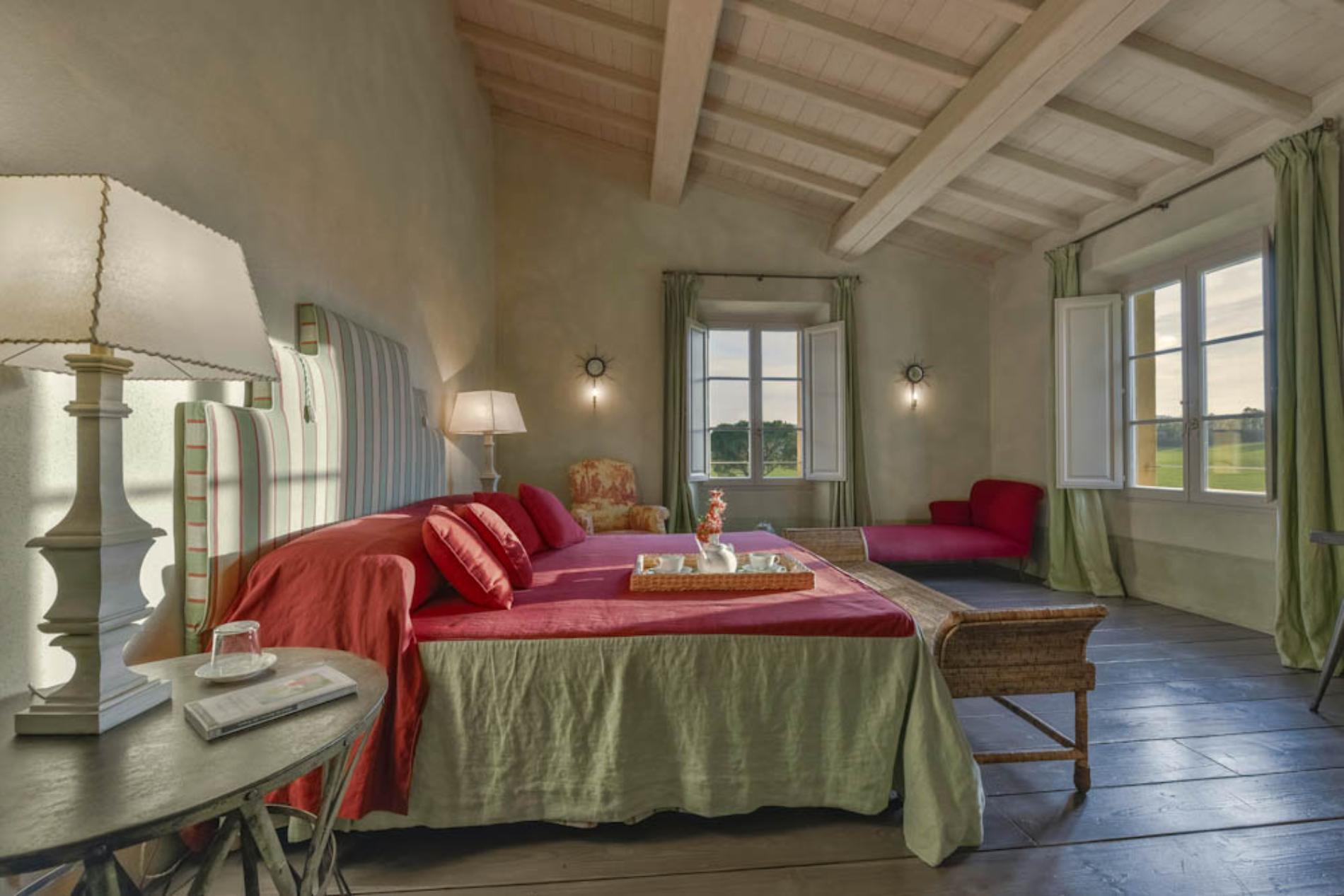 Corner bedroom with rooftop access and spectacular views of the far off hilltown of Roccastrada, Scarlino. Views of the silo spa, pool and La Vigna.