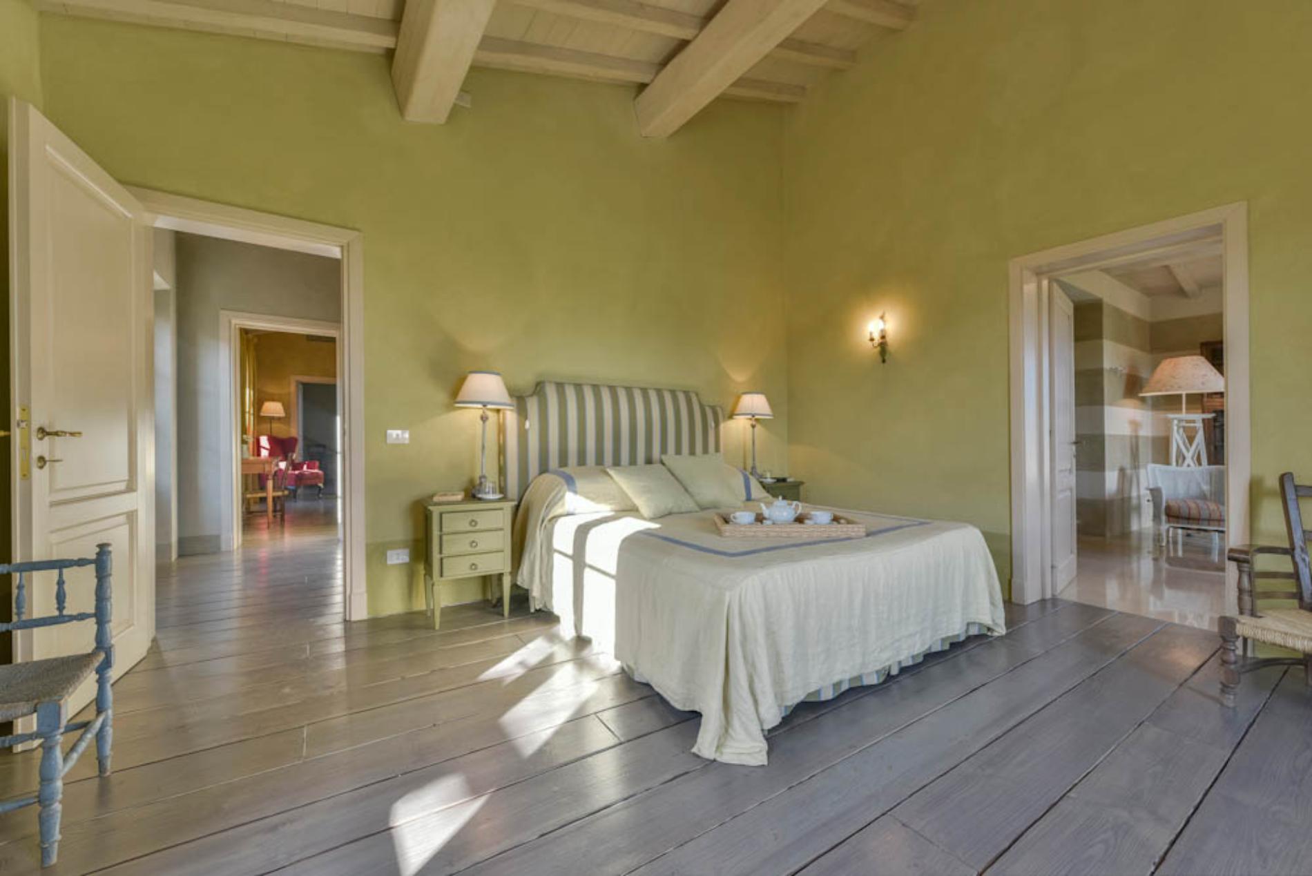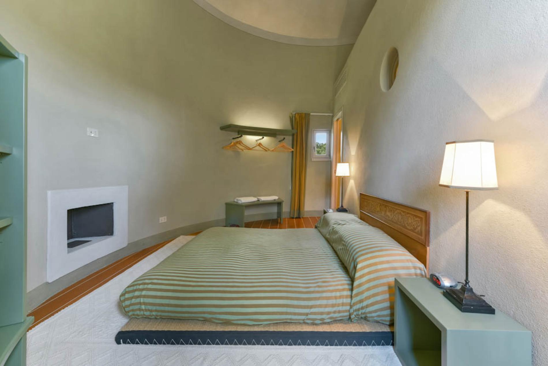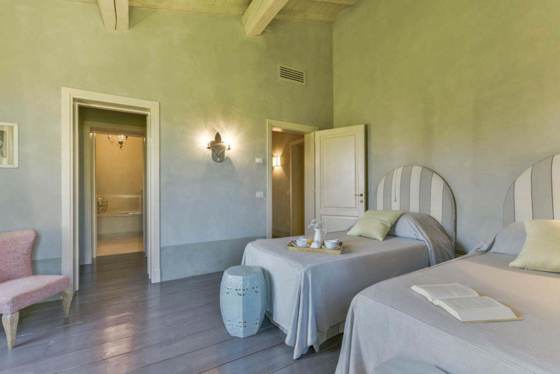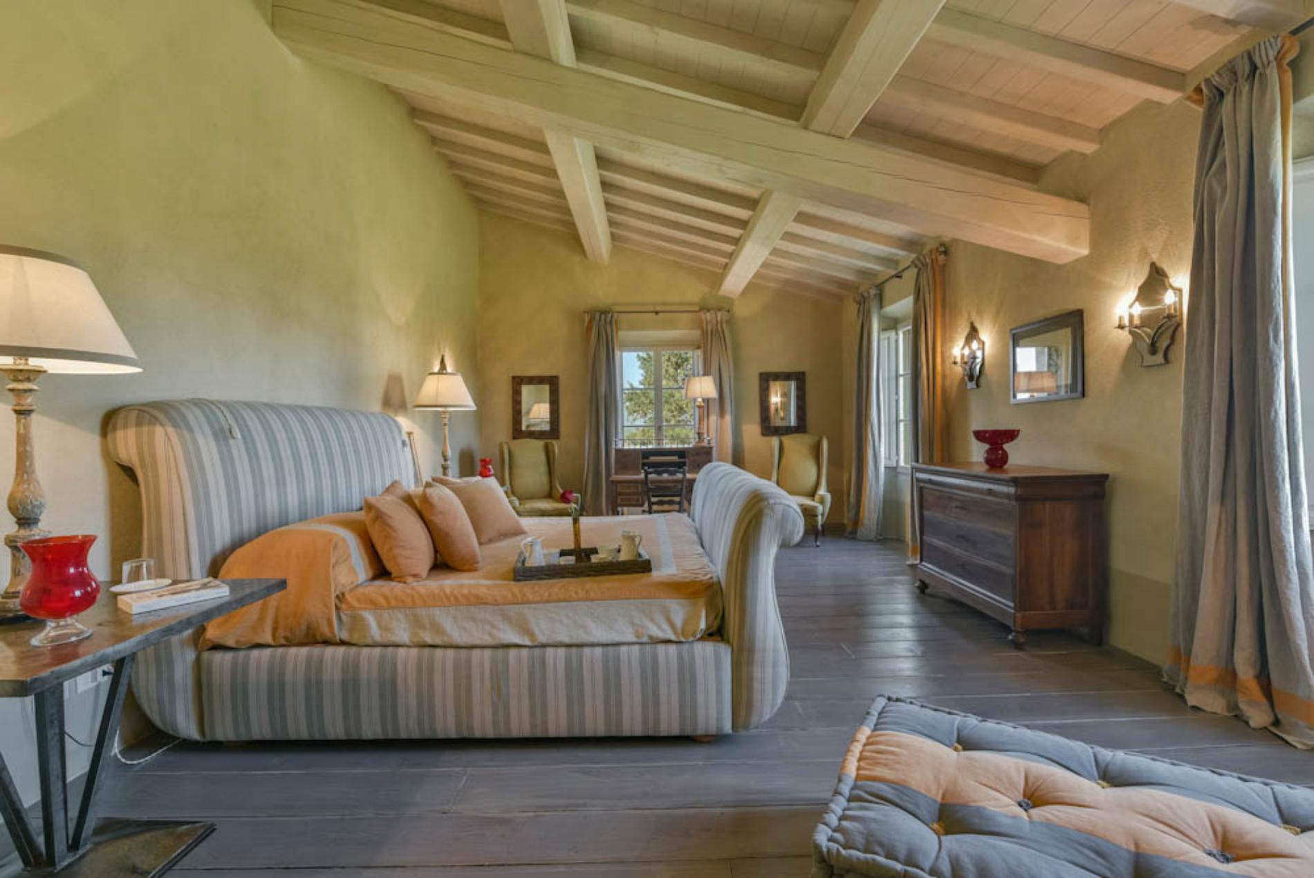Corner bedroom with rooftop access and spectacular views of the far off hilltown of Roccastrada, Scarlino. Views of the silo spa, pool and La Vigna.